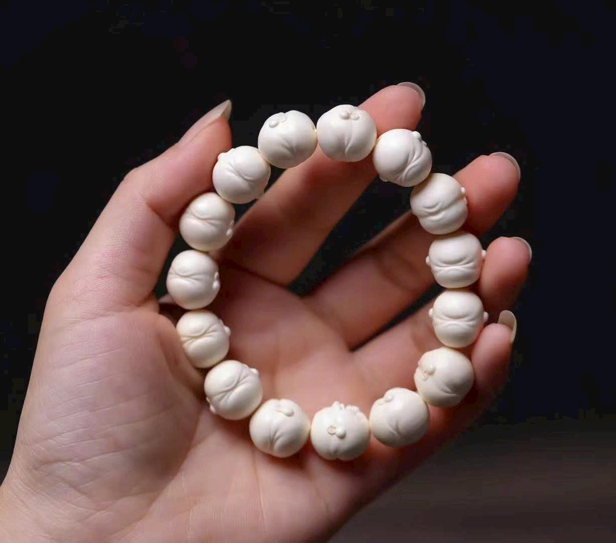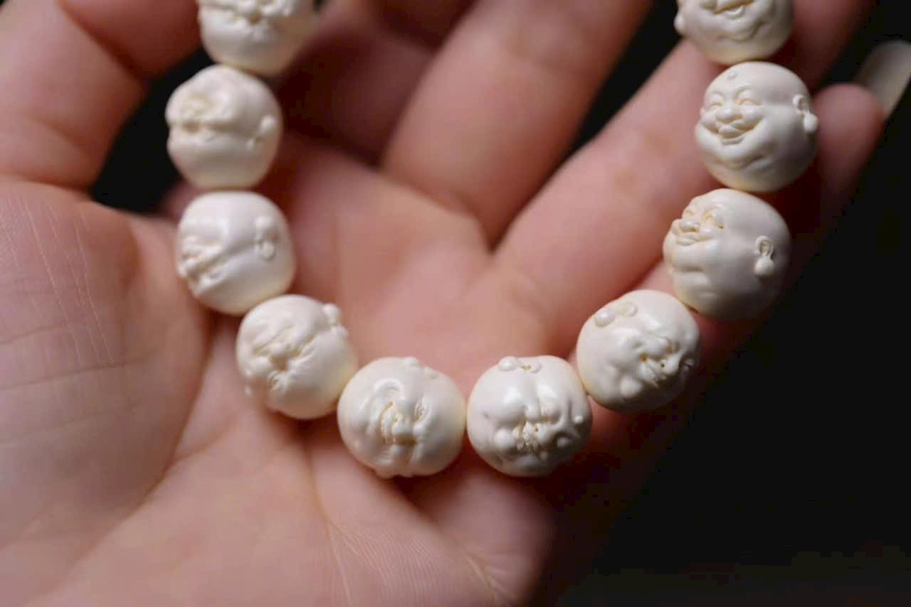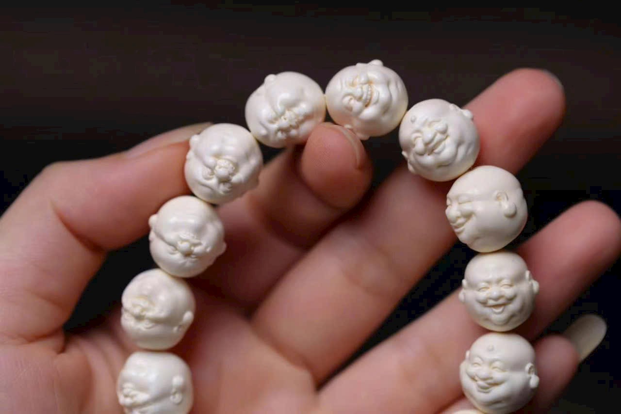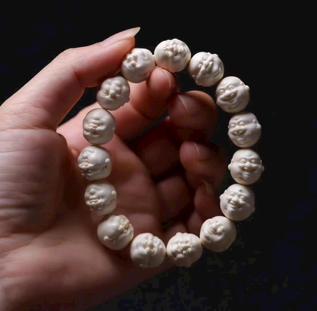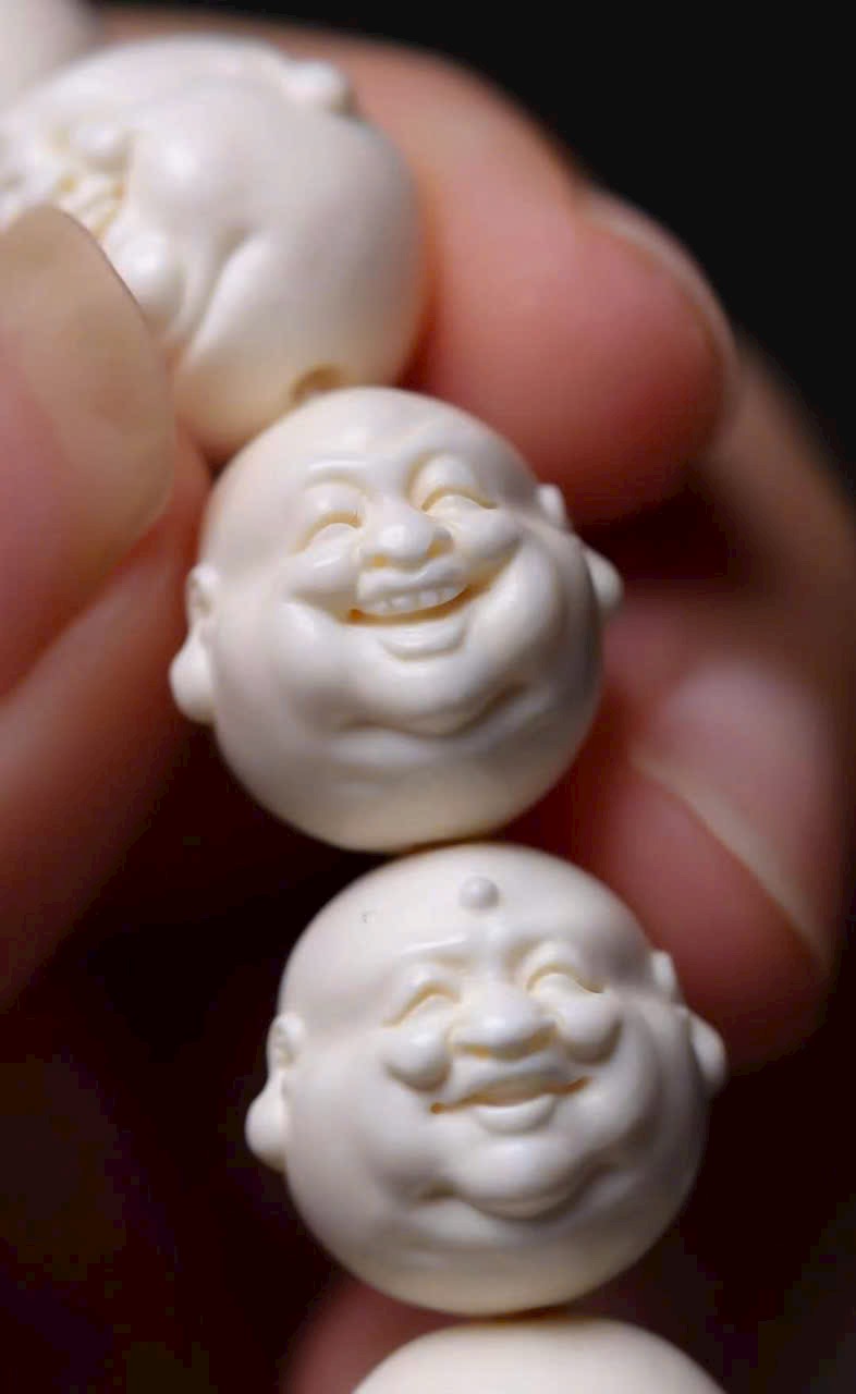 Mỗi hạt tròn đều khắc gương mặt Phật cười – nét hiền hòa, tươi vui, đậm chất thiền.
