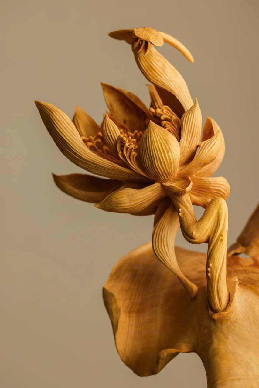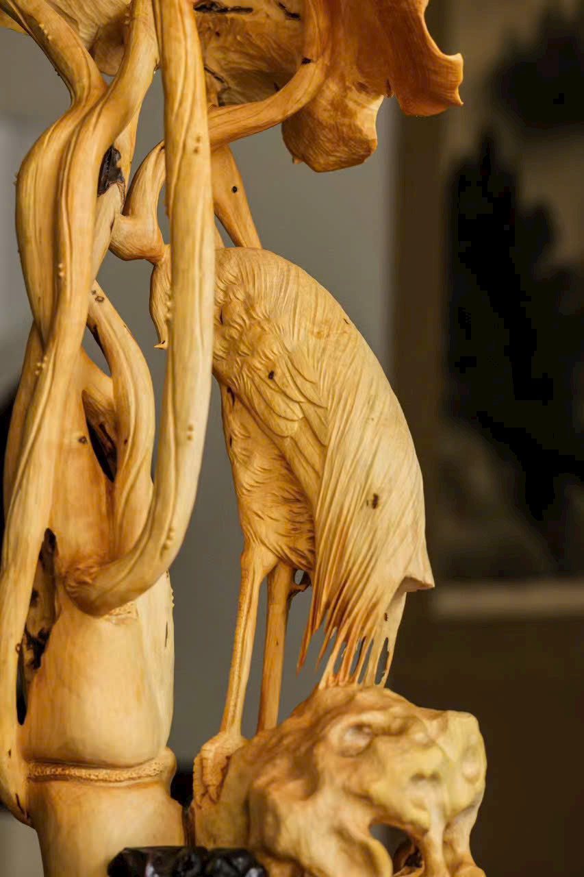 Tác phẩm thuận theo dáng gỗ mà tạo hình, nhập đao đúng mạch, chạm khắc thấu hiểu đặc tính gỗ; đao pháp biến hóa linh hoạt, các mặt đều tinh xảo, tạo khối lập thể sinh động. Hình tượng bạch lộ thần thái thanh nhã, trong tĩnh lặng toát ra linh khí tự nhiên. Bày nơi án thư mang điềm lành, gửi lời chúc đỗ đạt liên tiếp, công danh hanh thông.