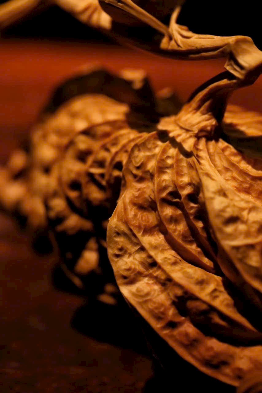 lá sen khô cuộn mình, đài sen vươn cao, chim diệc lặng lẽ đậu trên cành sen.