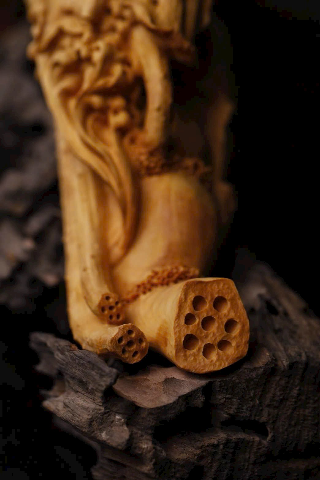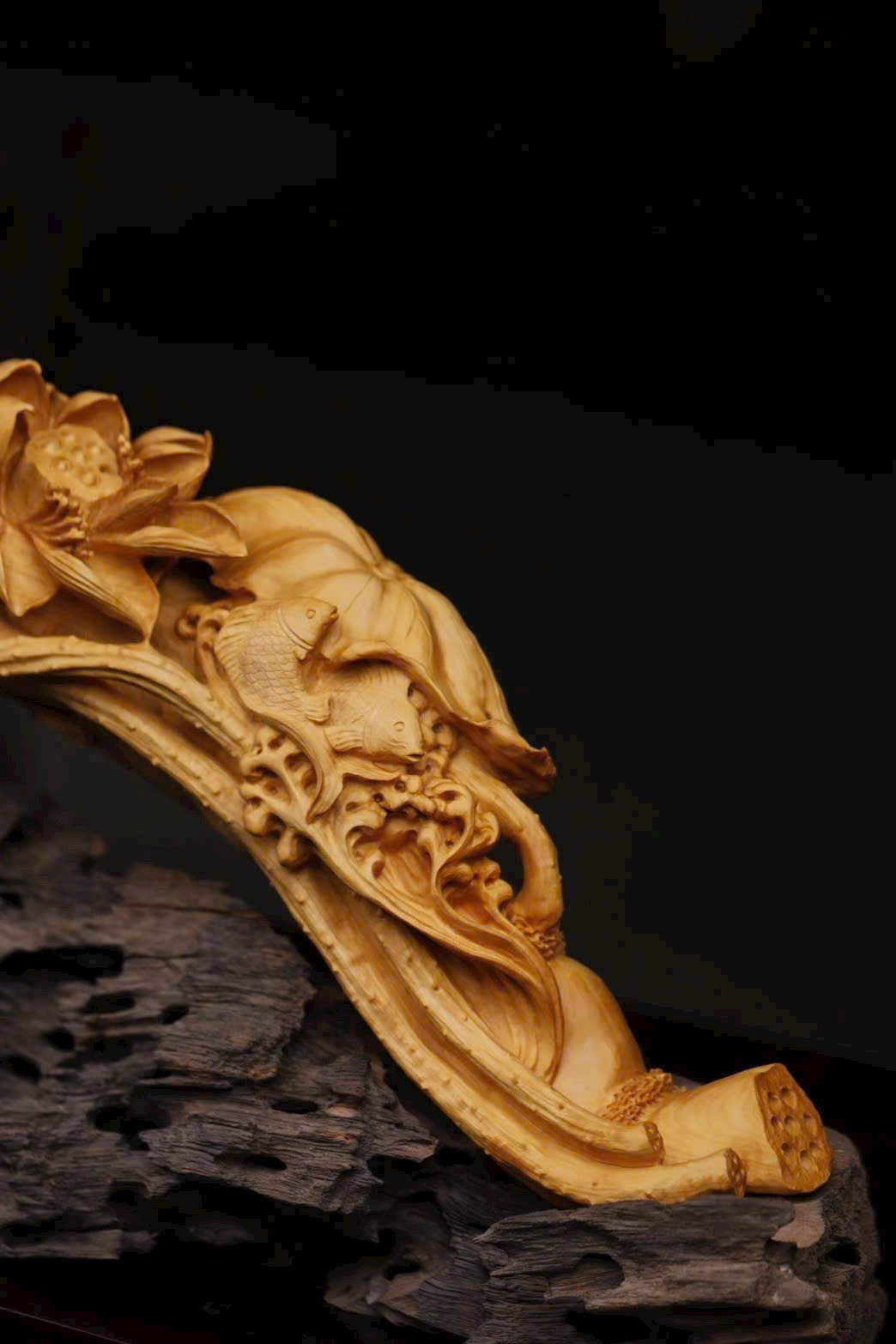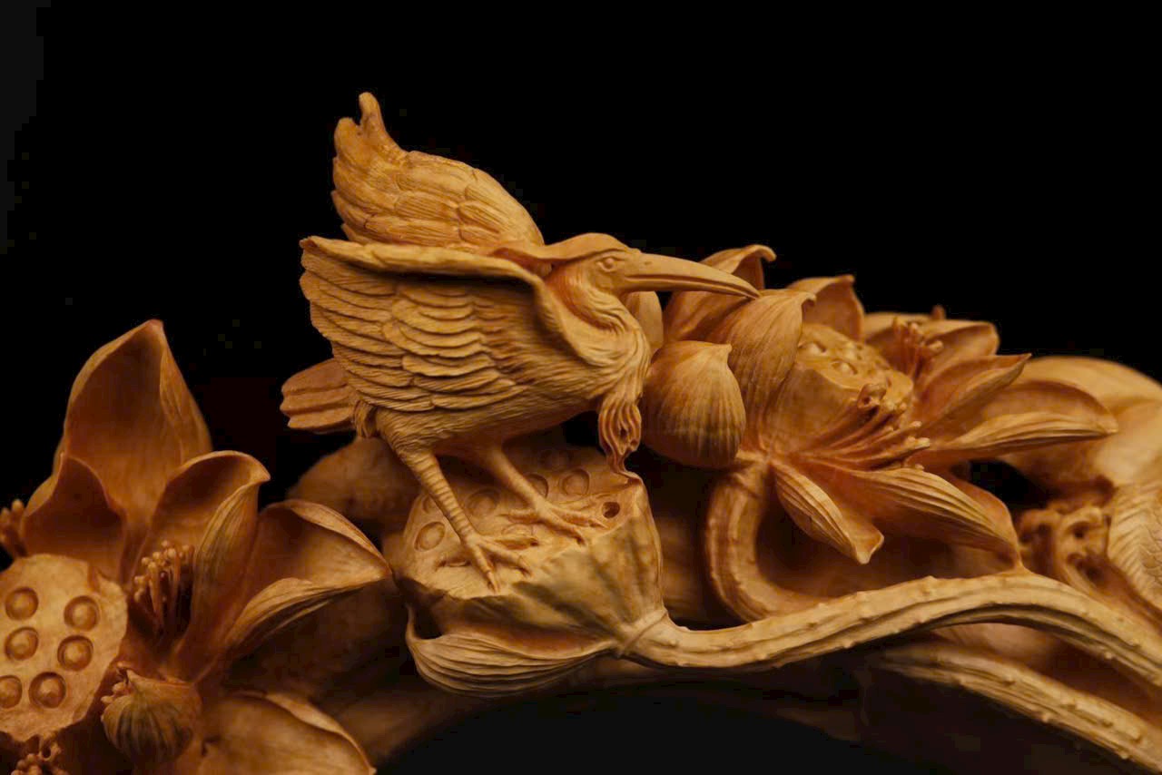 Tác phẩm được đục chạm thủng từ một khối gỗ nguyên, hoa sen nở rộ rạng ngời, chim hạc đứng uyển chuyển, cá bơi thong dong dưới nước. Đôi tay tài hoa của nghệ nhân khắc nên ý cảnh “Nhất lộ liên khoa” – biểu trưng cho con đường công danh hanh thông, và “Liên niên hữu dư” – tượng trưng cho cuộc sống sung túc đủ đầy.