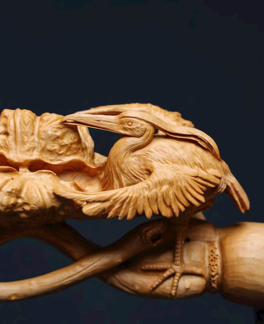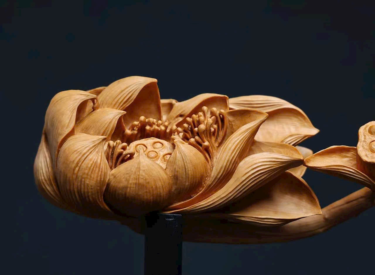 - Tác phẩm thủ công gỗ hoàng dương, nguyên khối chạm khắc tinh xảo. Hoa sen nở rộ, tiên hạc đậu nghỉ, mang ý nghĩa liên niên hữu dư. Đao pháp tỉ mỉ, tầng lớp rõ ràng, nghệ thuật tinh mỹ.