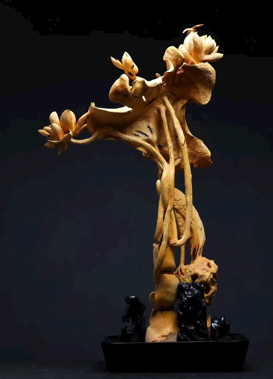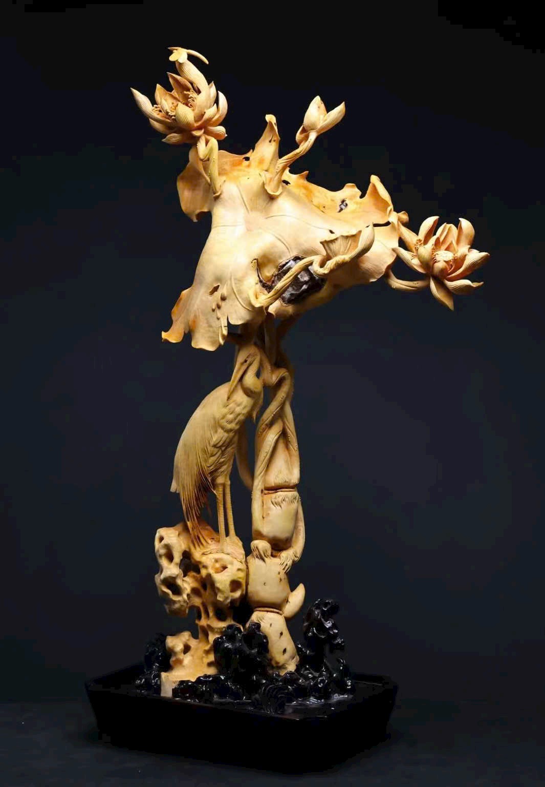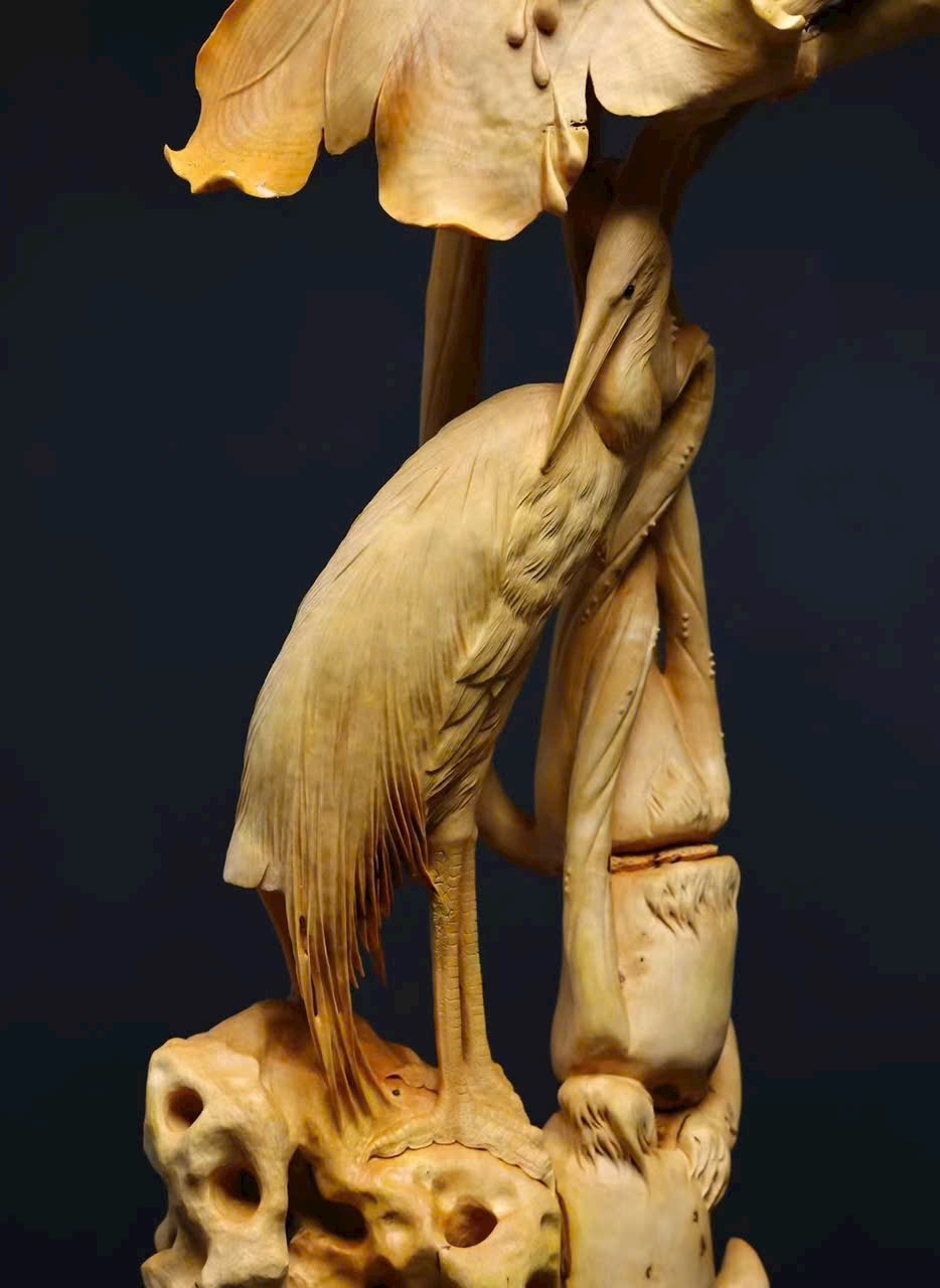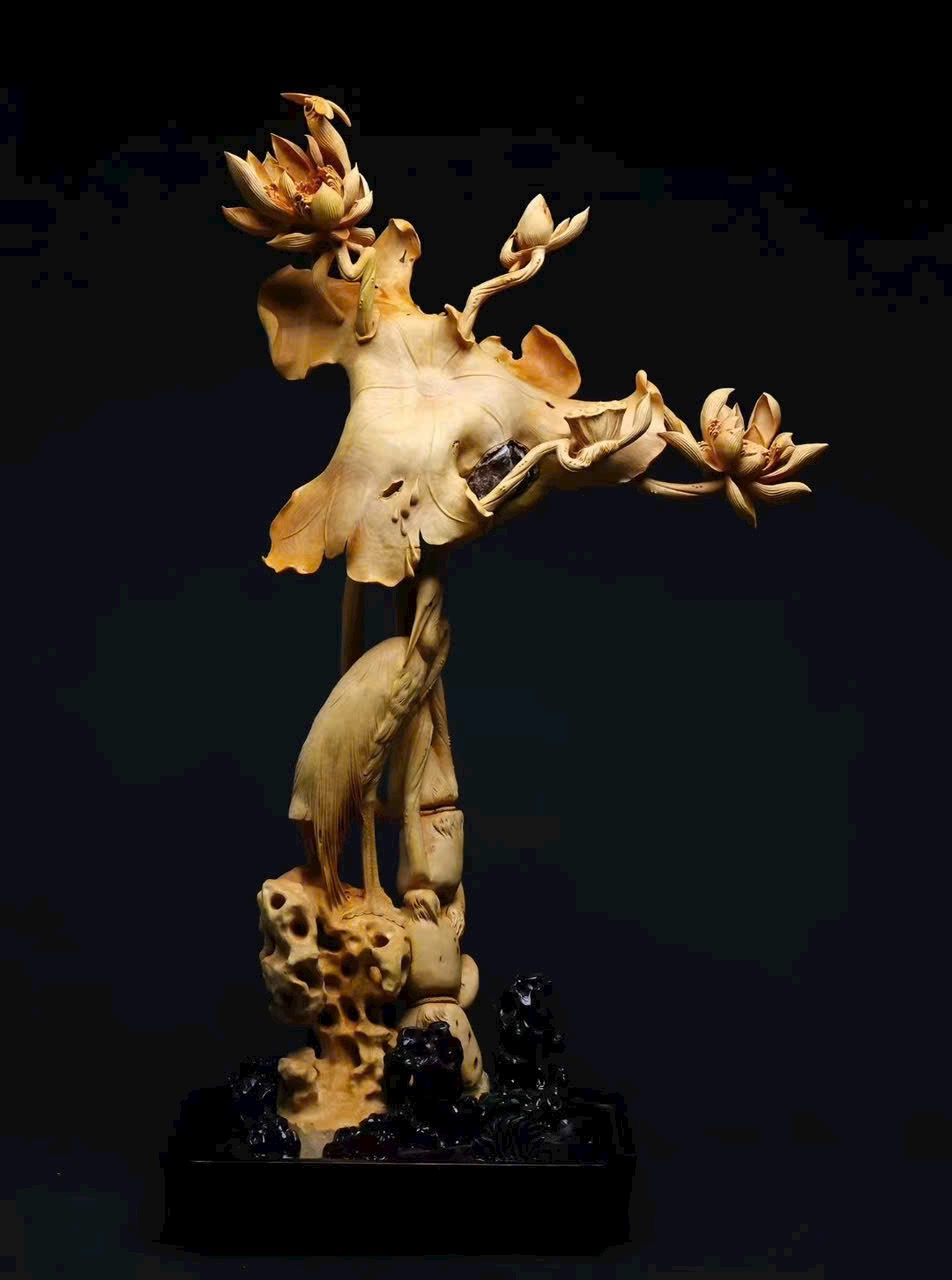 Tác phẩm hoàng dương mộc liền khối, hoàn toàn điêu khắc thủ công. Đan đỉnh hạc đứng giữa đầm sen, mang ý nghĩa bước bước cao thăng. Hoa sen nở tầng tầng lớp lớp, dáng vẻ thanh tao, tượng trưng liên niên hữu dư. Toàn thể bố cục hài hòa, đường nét tinh tế, kết hợp đế đen càng tôn vẻ trang nhã và khí thế trang trọng.