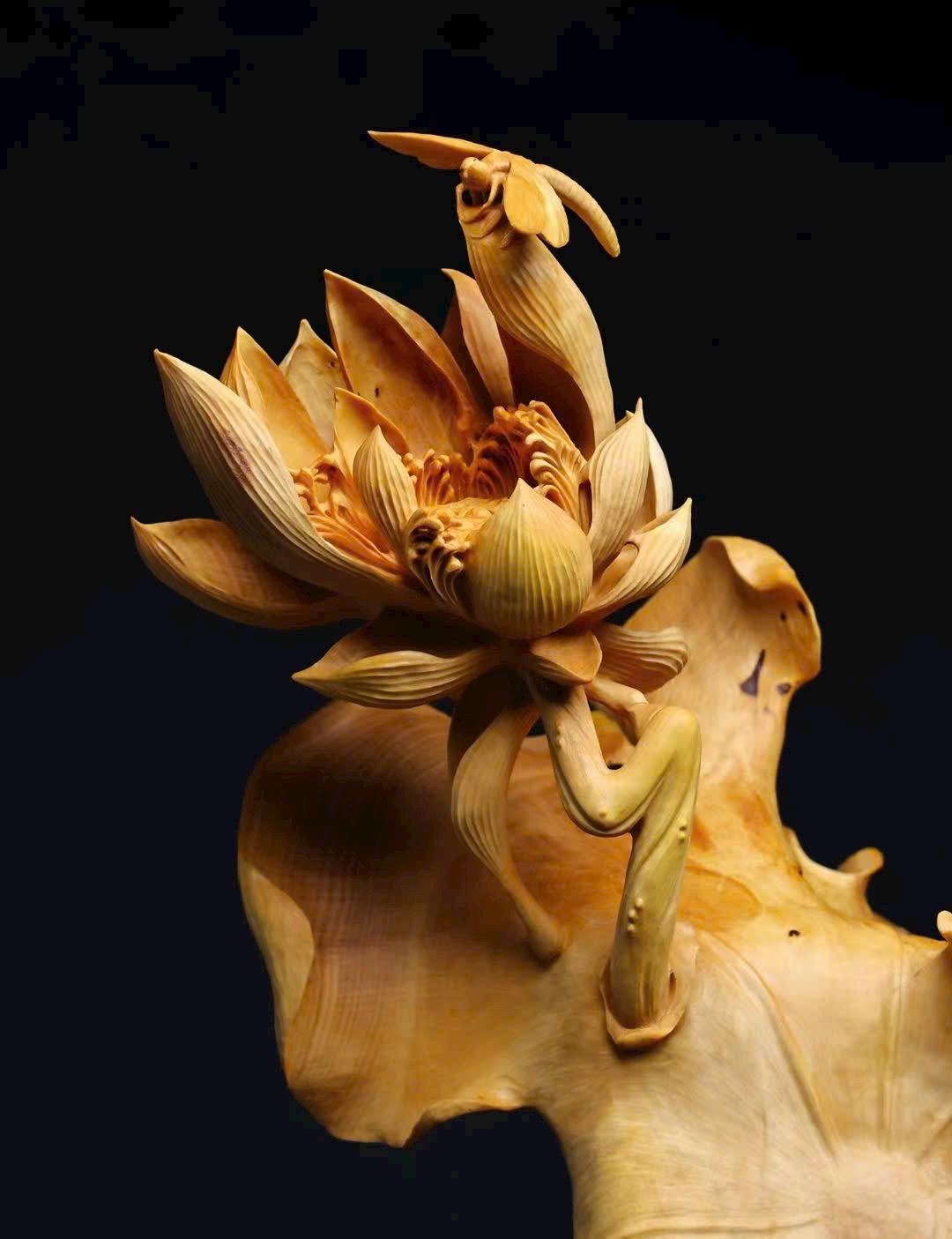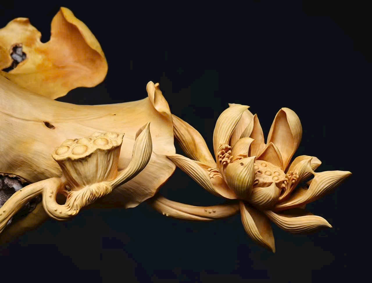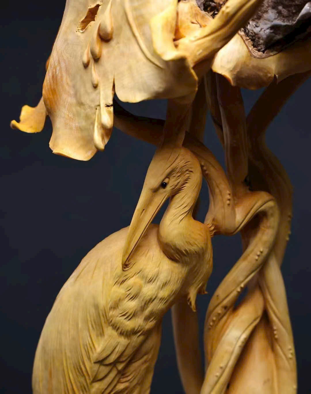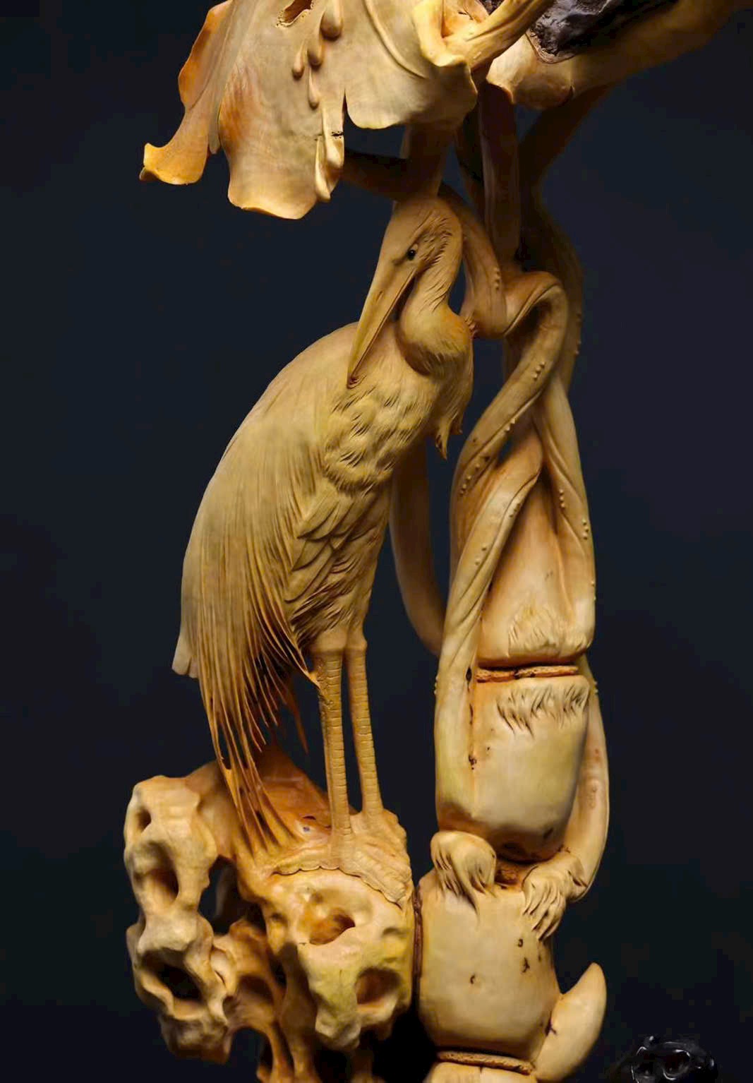 Tác phẩm hoàng dương mộc liền khối, hoàn toàn điêu khắc thủ công. Đan đỉnh hạc đứng giữa đầm sen, mang ý nghĩa bước bước cao thăng. Hoa sen nở tầng tầng lớp lớp, dáng vẻ thanh tao, tượng trưng liên niên hữu dư. Toàn thể bố cục hài hòa, đường nét tinh tế, kết hợp đế đen càng tôn vẻ trang nhã và khí thế trang trọng.