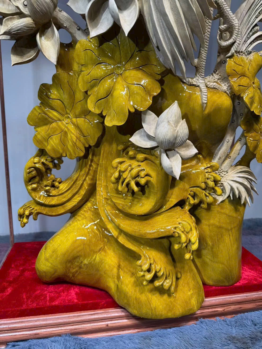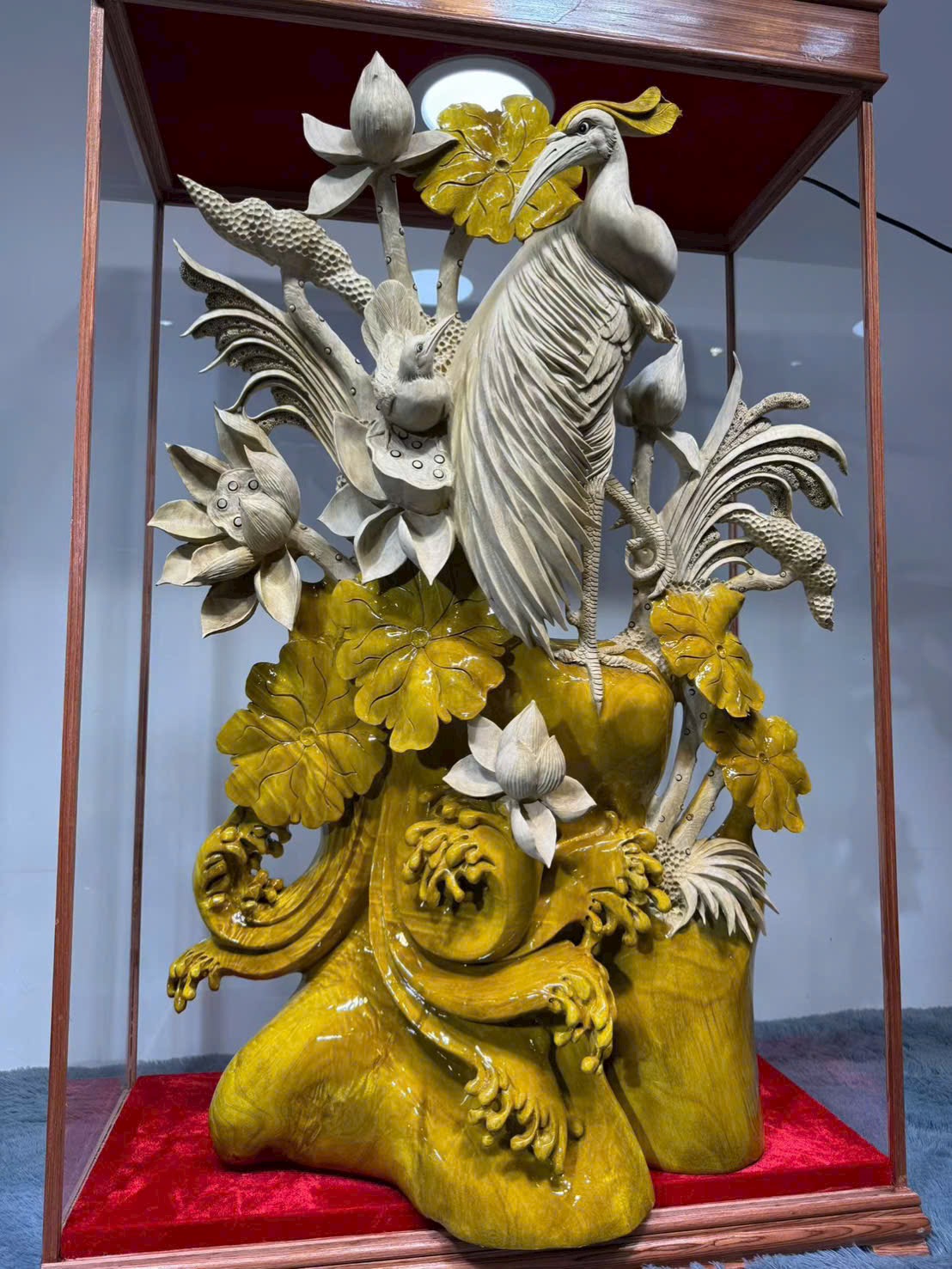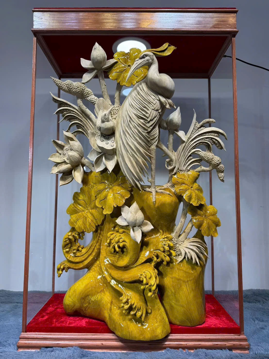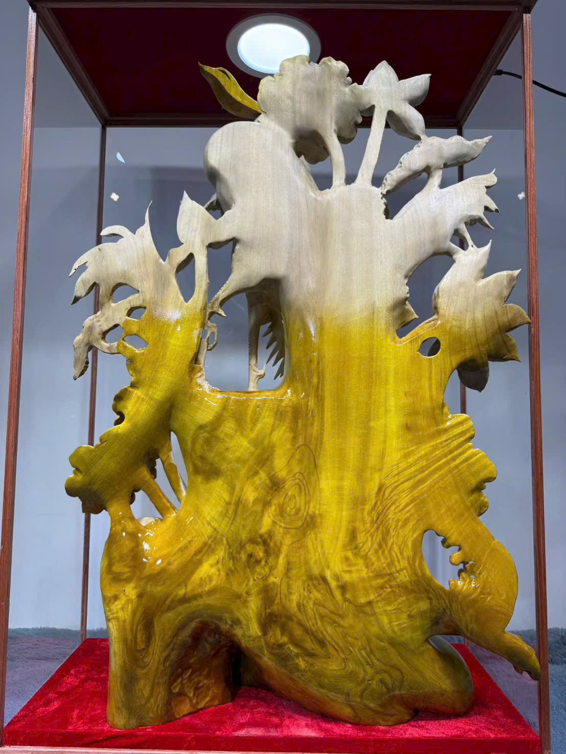 Tác phẩm được chế tác từ gỗ kim tơ nam, kèm khung trưng bày, kích thước dài 69 × dày 32 × cao 109 cm.