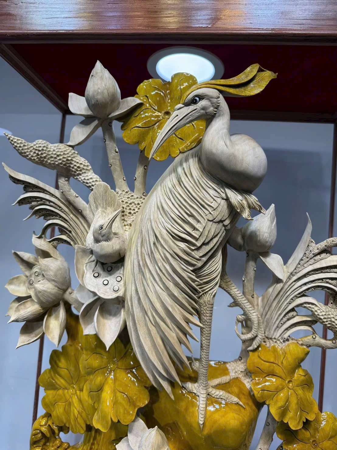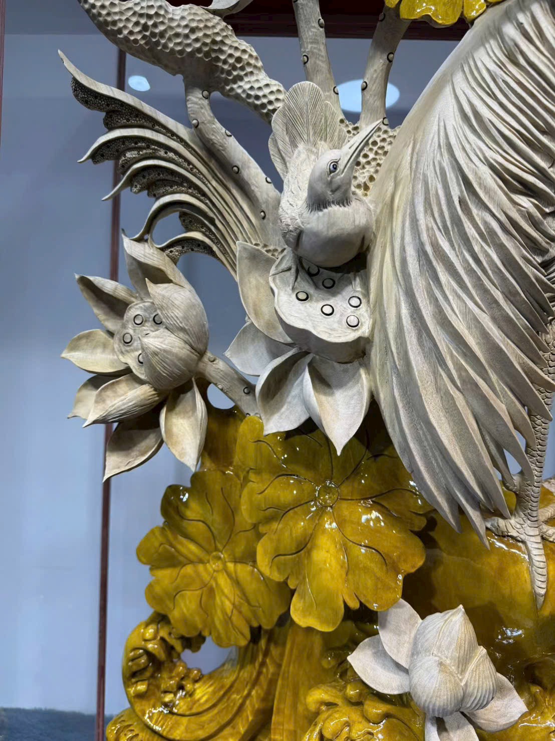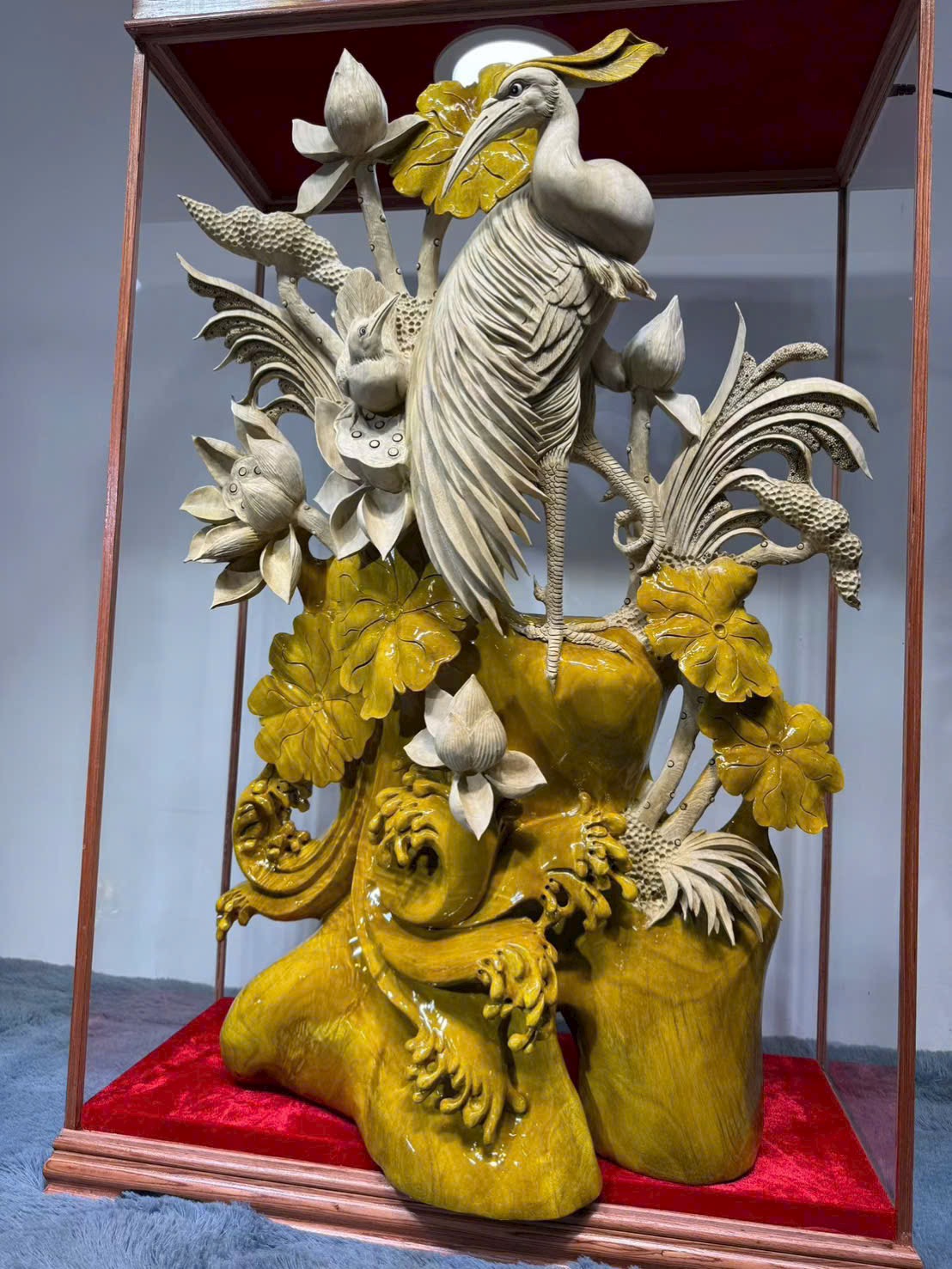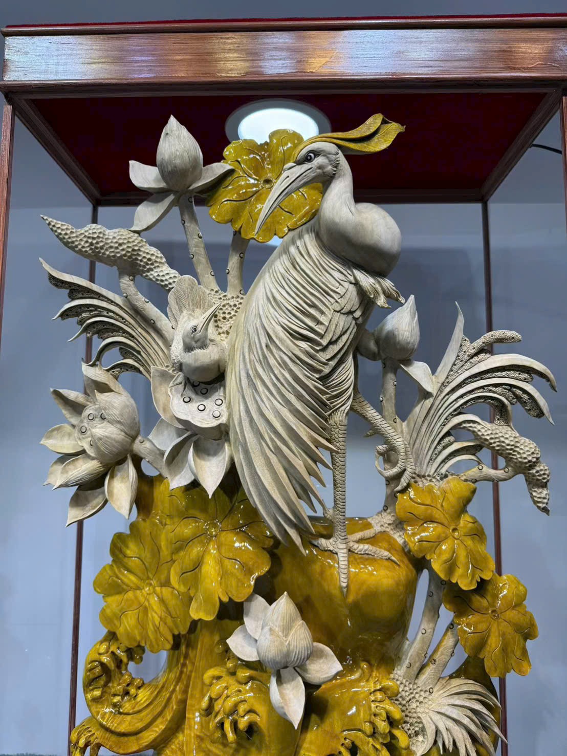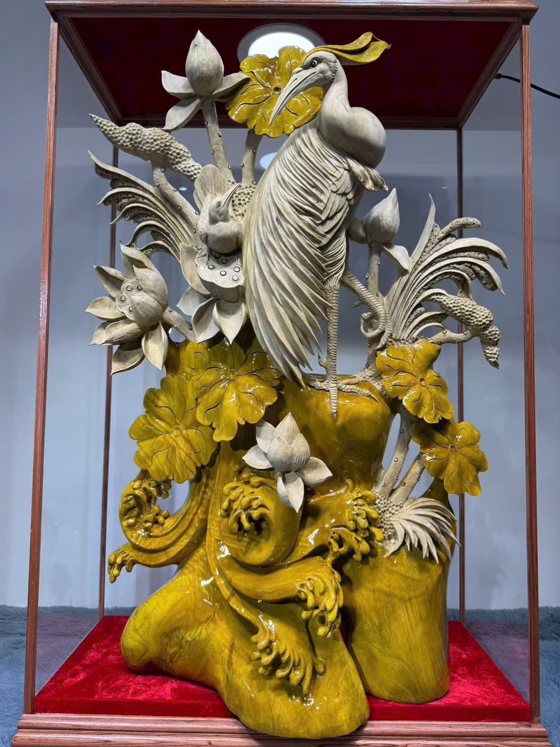 Tác phẩm được chế tác từ gỗ kim tơ nam, kèm khung trưng bày, kích thước dài 69 × dày 32 × cao 109 cm.