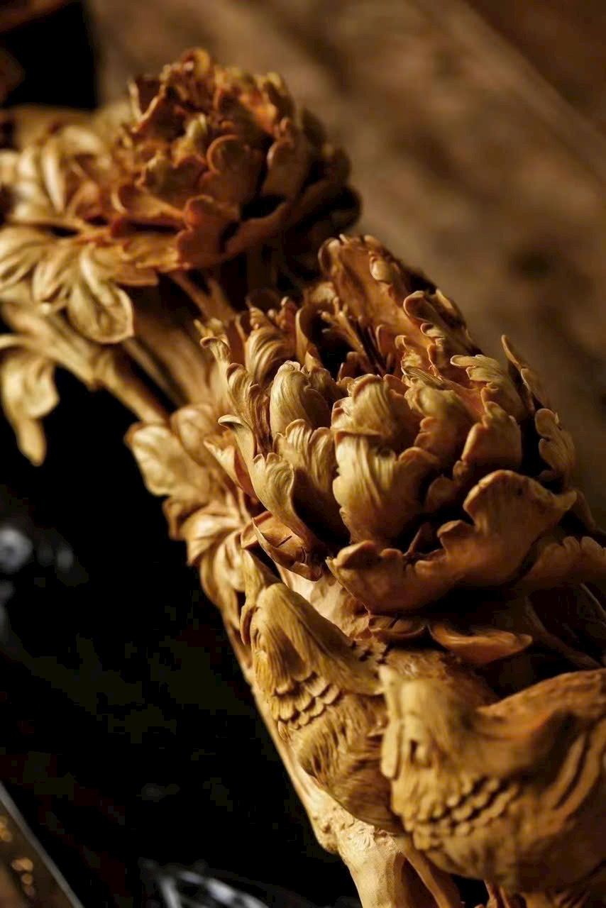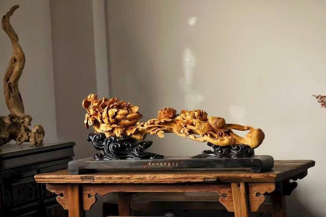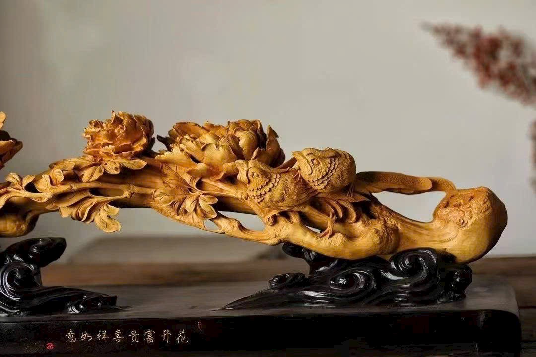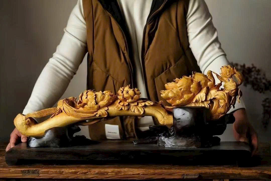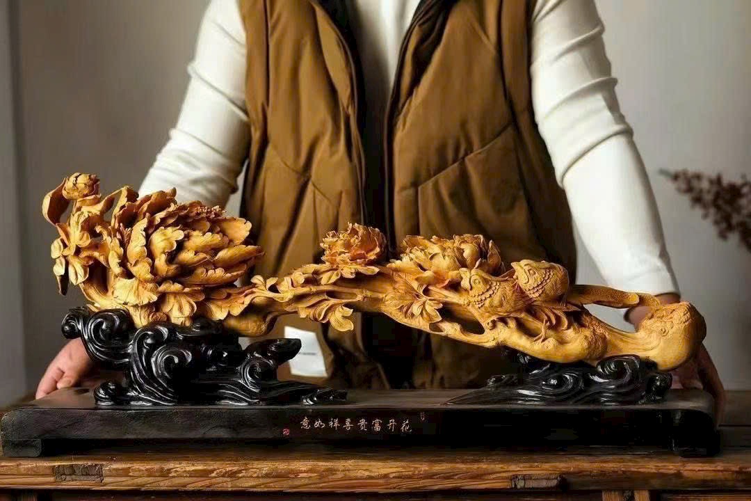 Tác phẩm chế tác tinh xảo từ một khối gỗ nguyên, tạo hình cây Như Ý thanh thoát, đầu uốn cong mềm mại, thân gắn nhành mẫu đơn đang nở – biểu tượng của phú quý. Chim trĩ đậu trên cành hoa, mang hàm ý “gấm thêm hoa” – cát tường, viên mãn.