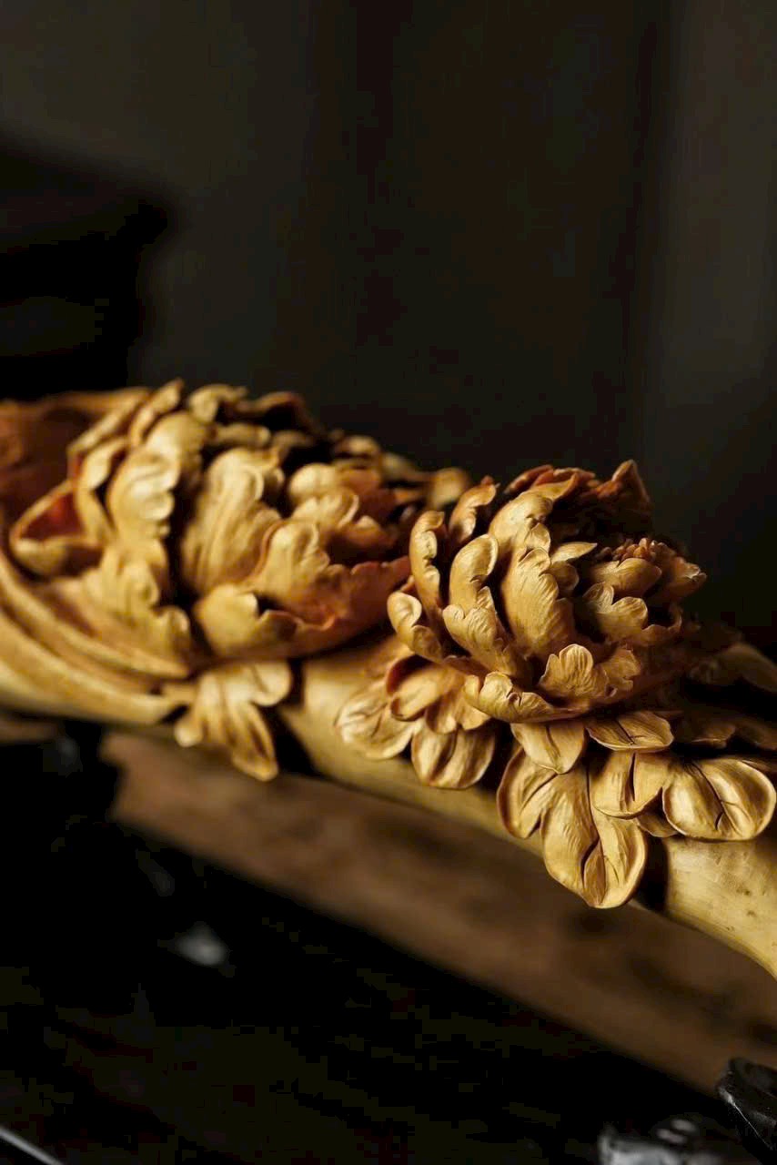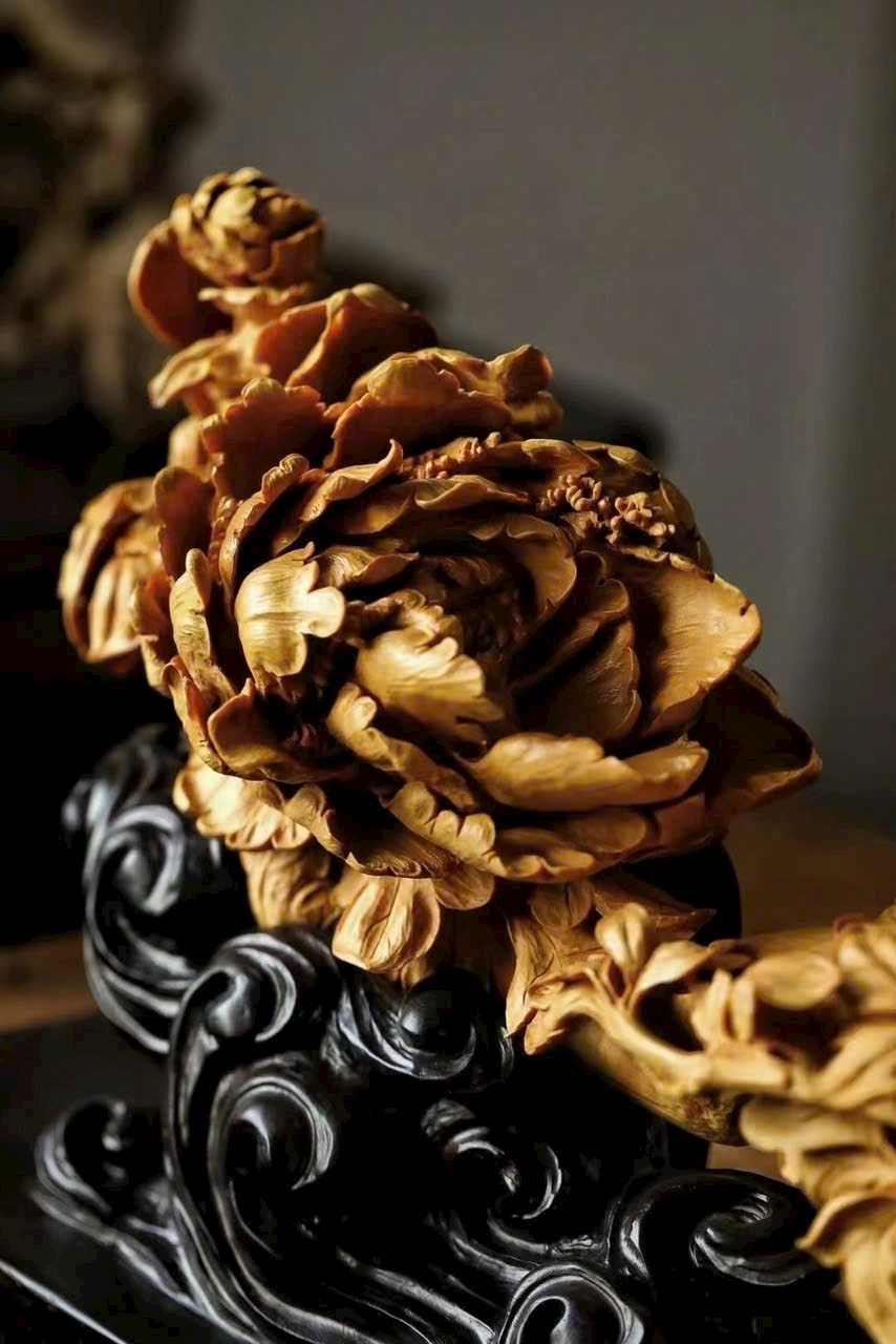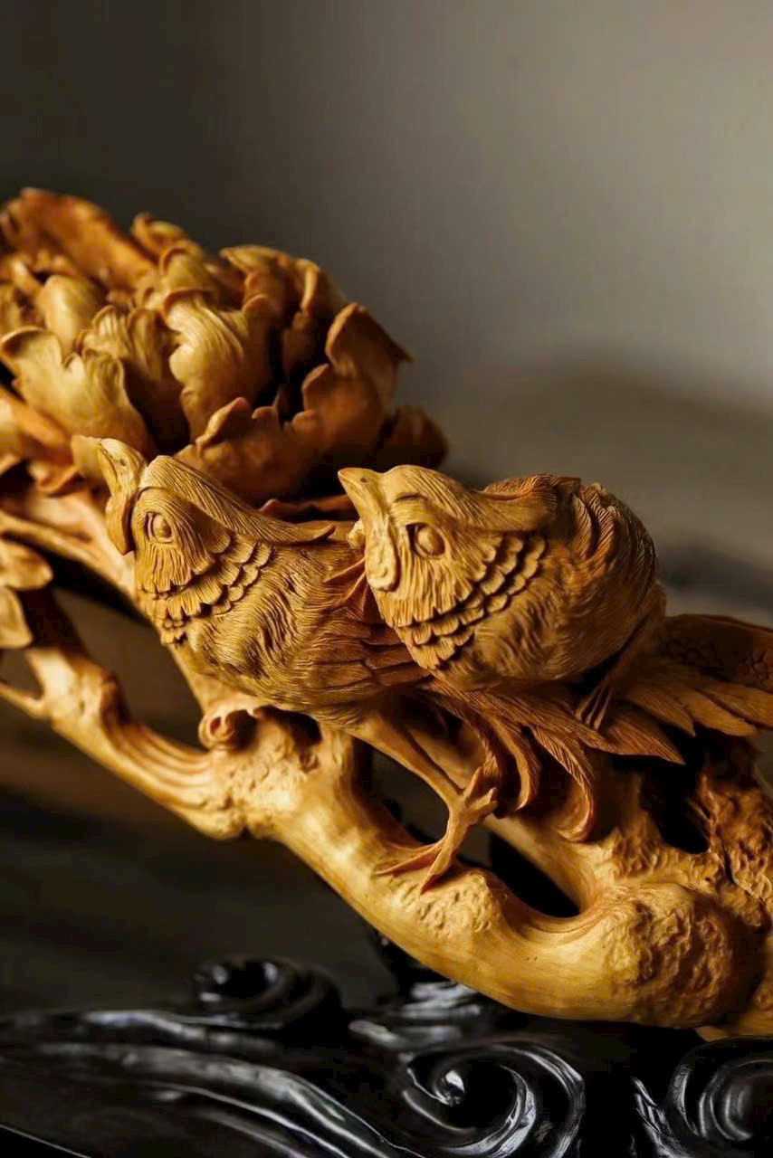 Tác phẩm chế tác tinh xảo từ một khối gỗ nguyên, tạo hình cây Như Ý thanh thoát, đầu uốn cong mềm mại, thân gắn nhành mẫu đơn đang nở – biểu tượng của phú quý. Chim trĩ đậu trên cành hoa, mang hàm ý “gấm thêm hoa” – cát tường, viên mãn.