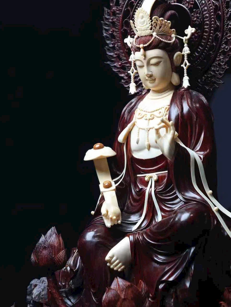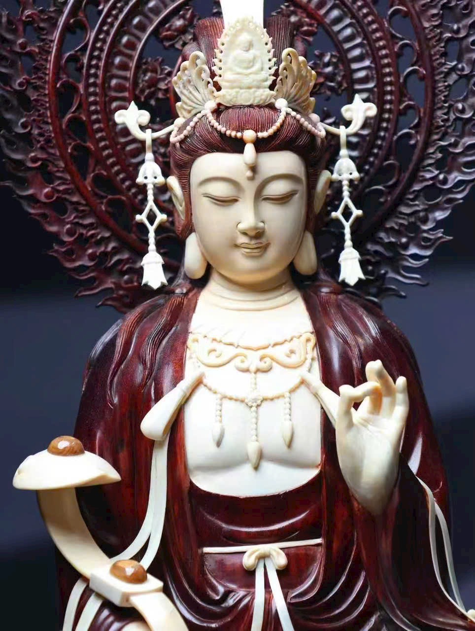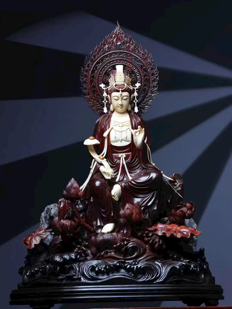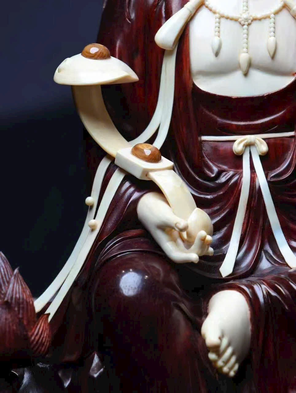 Tác phẩm thể hiện đường chạm tinh xảo tuyệt đỉnh, kết hợp hoàn hảo với ngà ma mút, tạo nên tổng thể hài hòa. Quan Âm an nhiên ngồi trên đài sen, tay cầm Như Ý, ánh mắt hướng xuống như lắng nghe nguyện vọng của chúng sinh, mang đến sự viên mãn trọn vẹn.