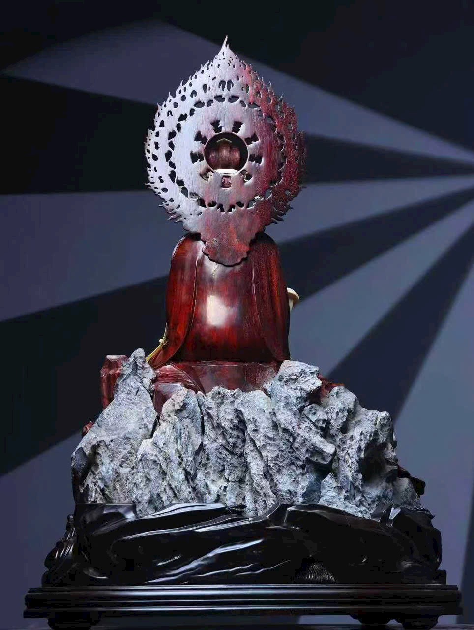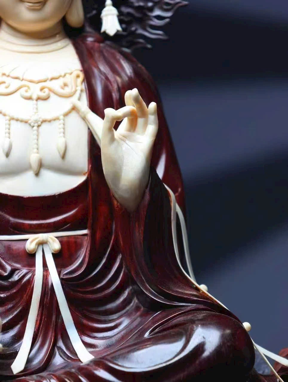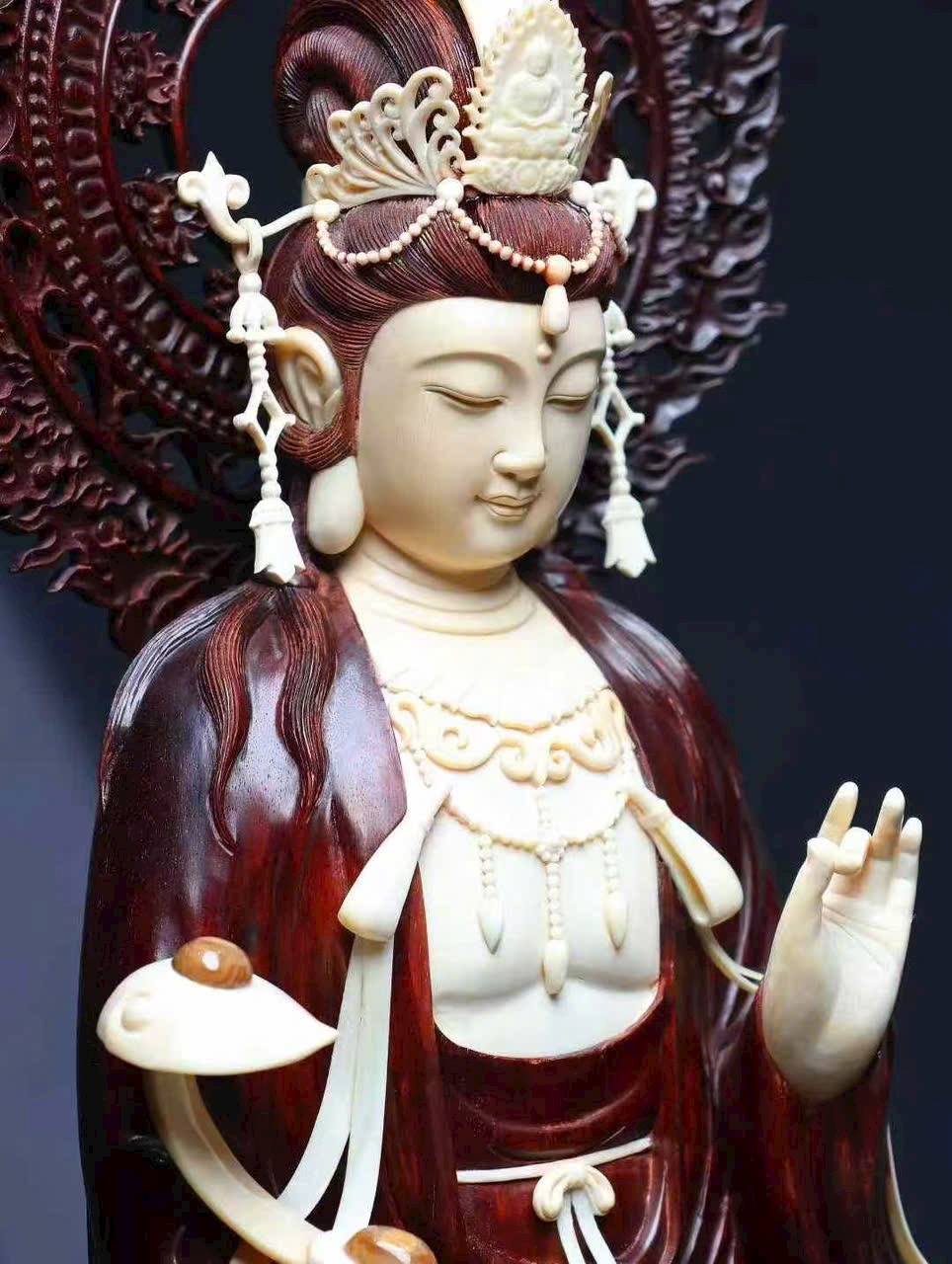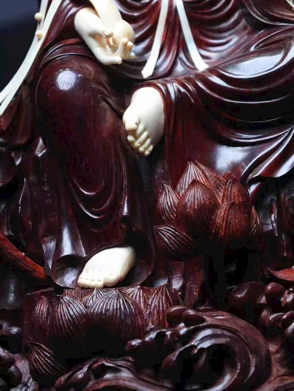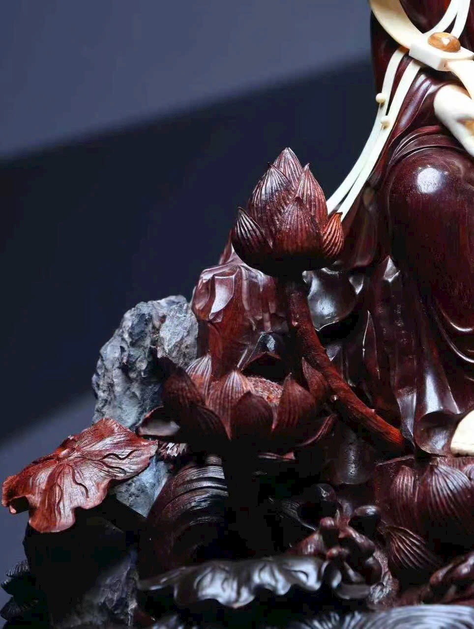 Tác phẩm thể hiện đường chạm tinh xảo tuyệt đỉnh, kết hợp hoàn hảo với ngà ma mút, tạo nên tổng thể hài hòa. Quan Âm an nhiên ngồi trên đài sen, tay cầm Như Ý, ánh mắt hướng xuống như lắng nghe nguyện vọng của chúng sinh, mang đến sự viên mãn trọn vẹn.