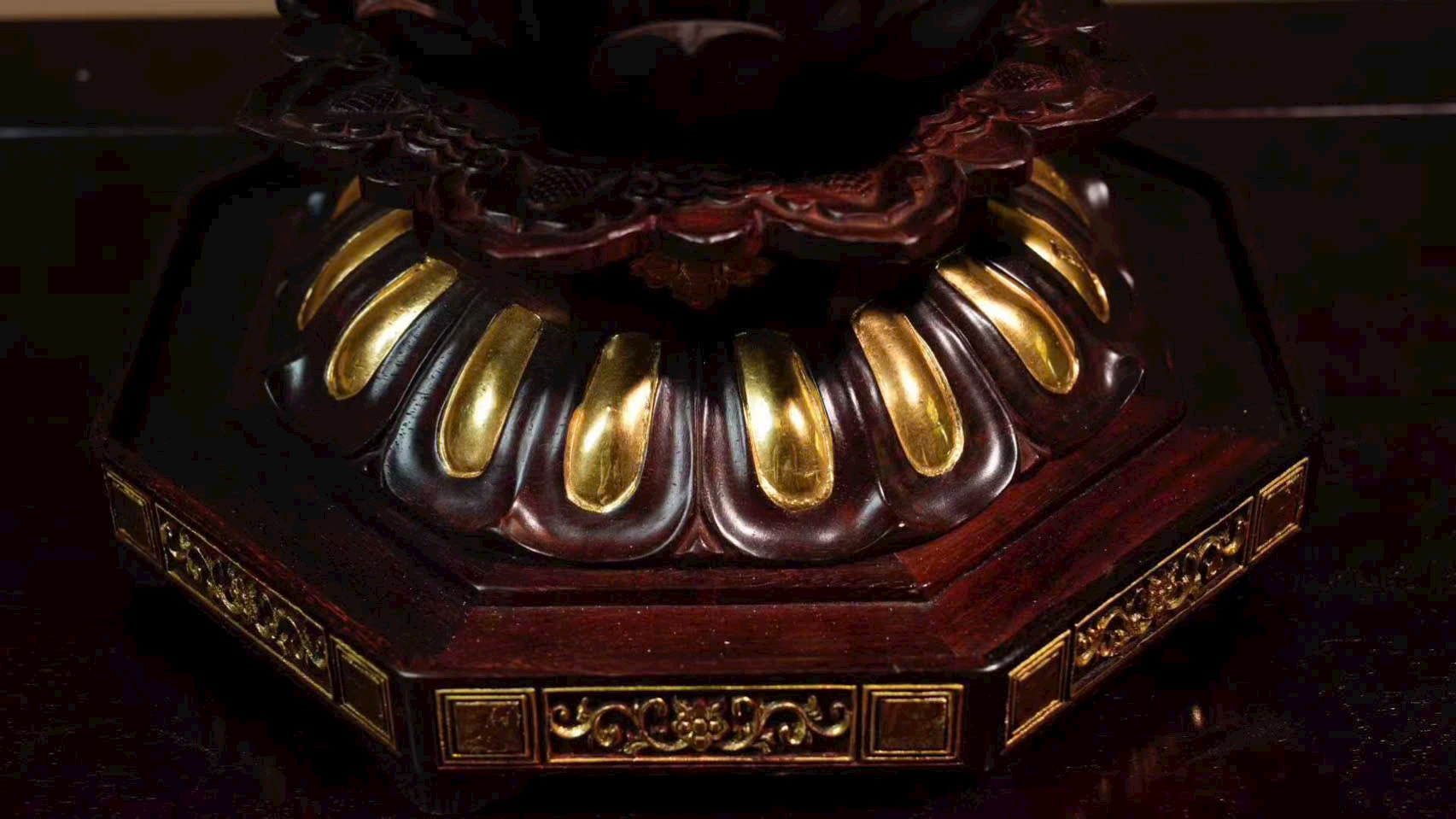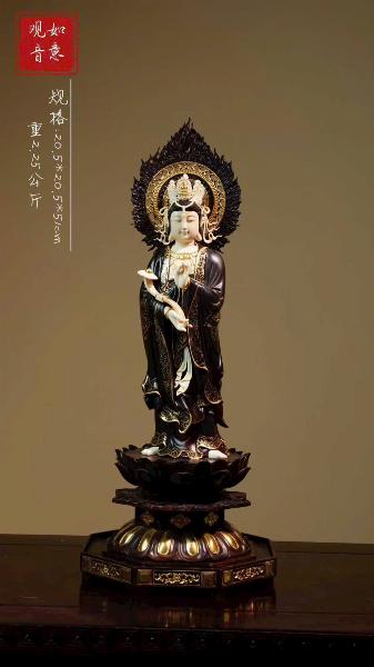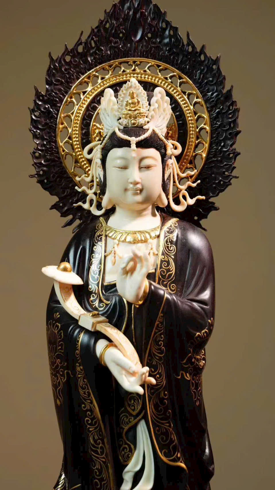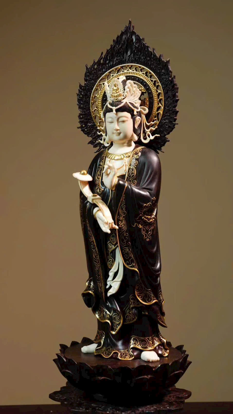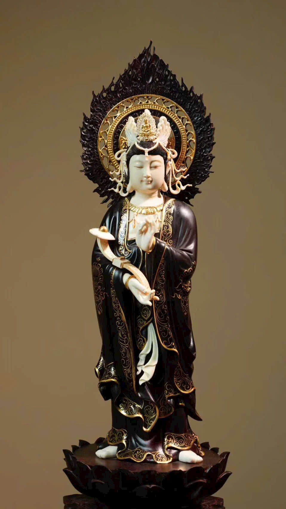Tuyển chọn lão liệu đặc ruột, chế tác thủ công bằng đục sắc, khảm n.gà ma mút. Tổng thể tác phẩm tinh mỹ vô song. Quan sát kỹ: khuôn mặt Bồ Tát đầy đặn, mày mắt thanh tú, thân khoác áo choàng, hạ thân mặc xiêm, tay cầm như ý, ngồi kiết già trên đài sen, thần thái an hòa từ bi, pháp tướng trang nghiêm. Đường đao lưu loát, nếp áo tự nhiên uyển chuyển, vô cùng tinh xảo. Một tay cầm như ý, một tay kết pháp ấn, mang ý nghĩa cát tường: cứu độ chúng sinh, trừ bệnh diệt tai, giải thoát khổ nạn nhân gian. Là tác phẩm quý hiếm, giá trị sưu tầm cao.