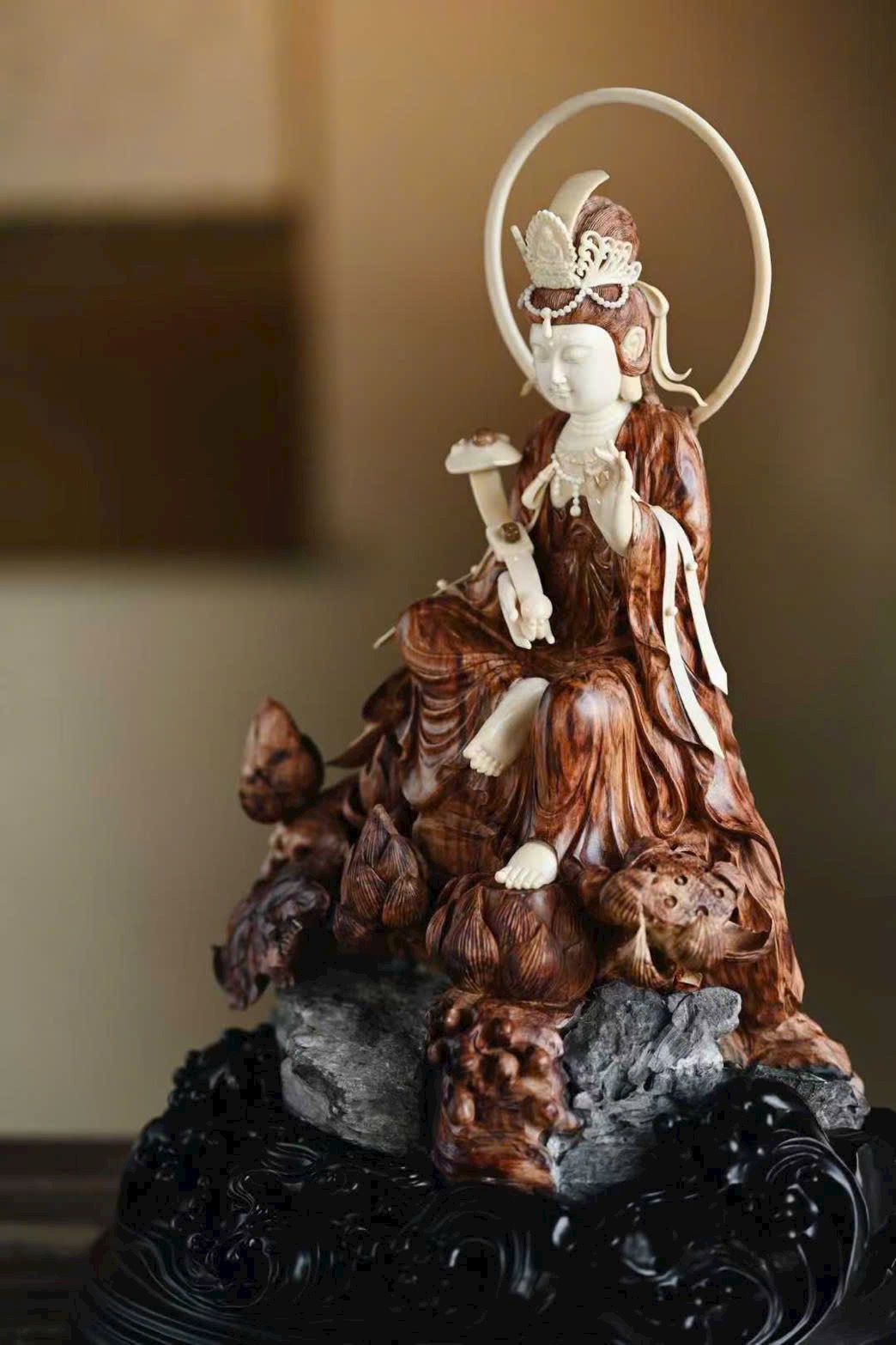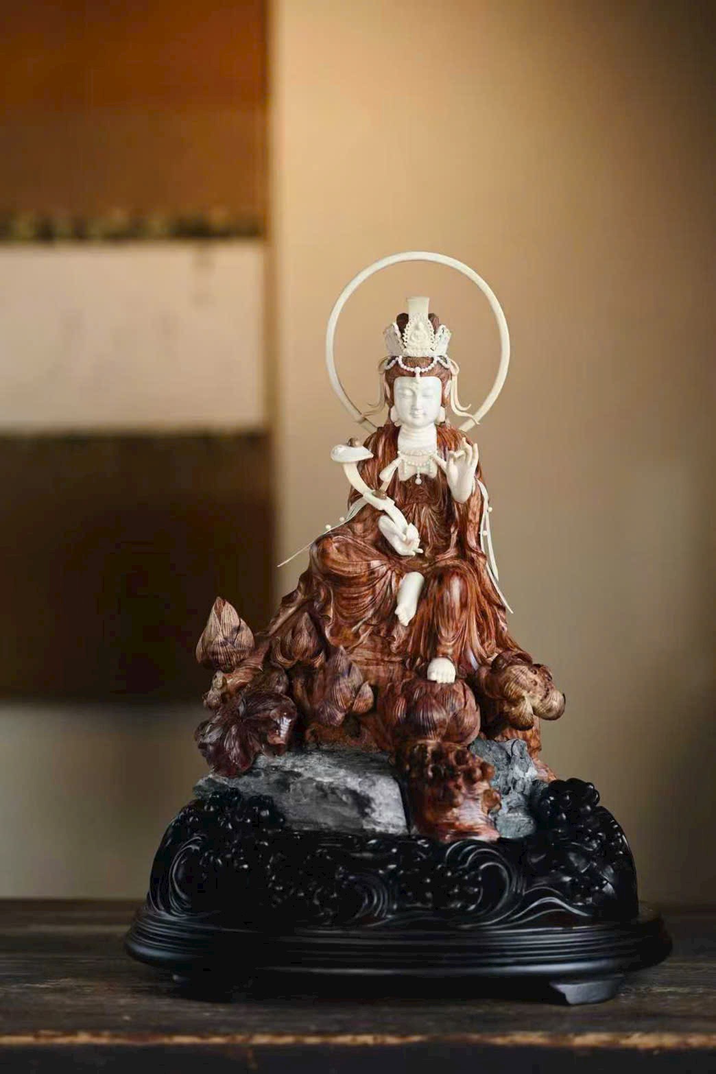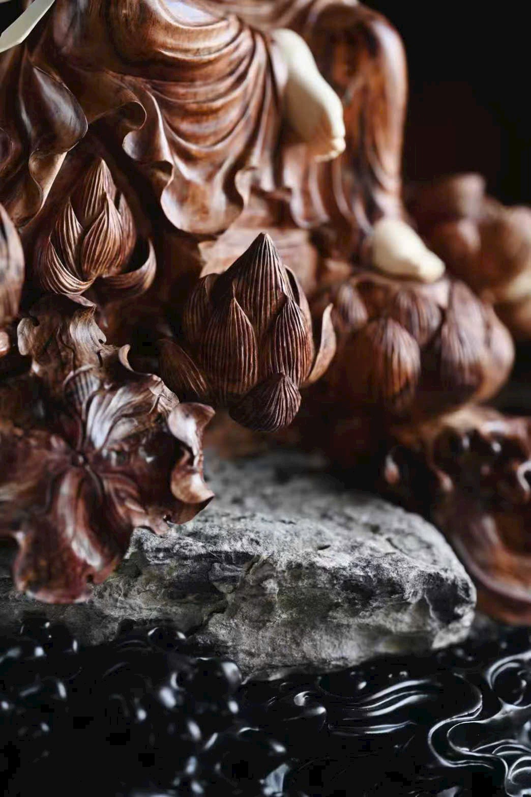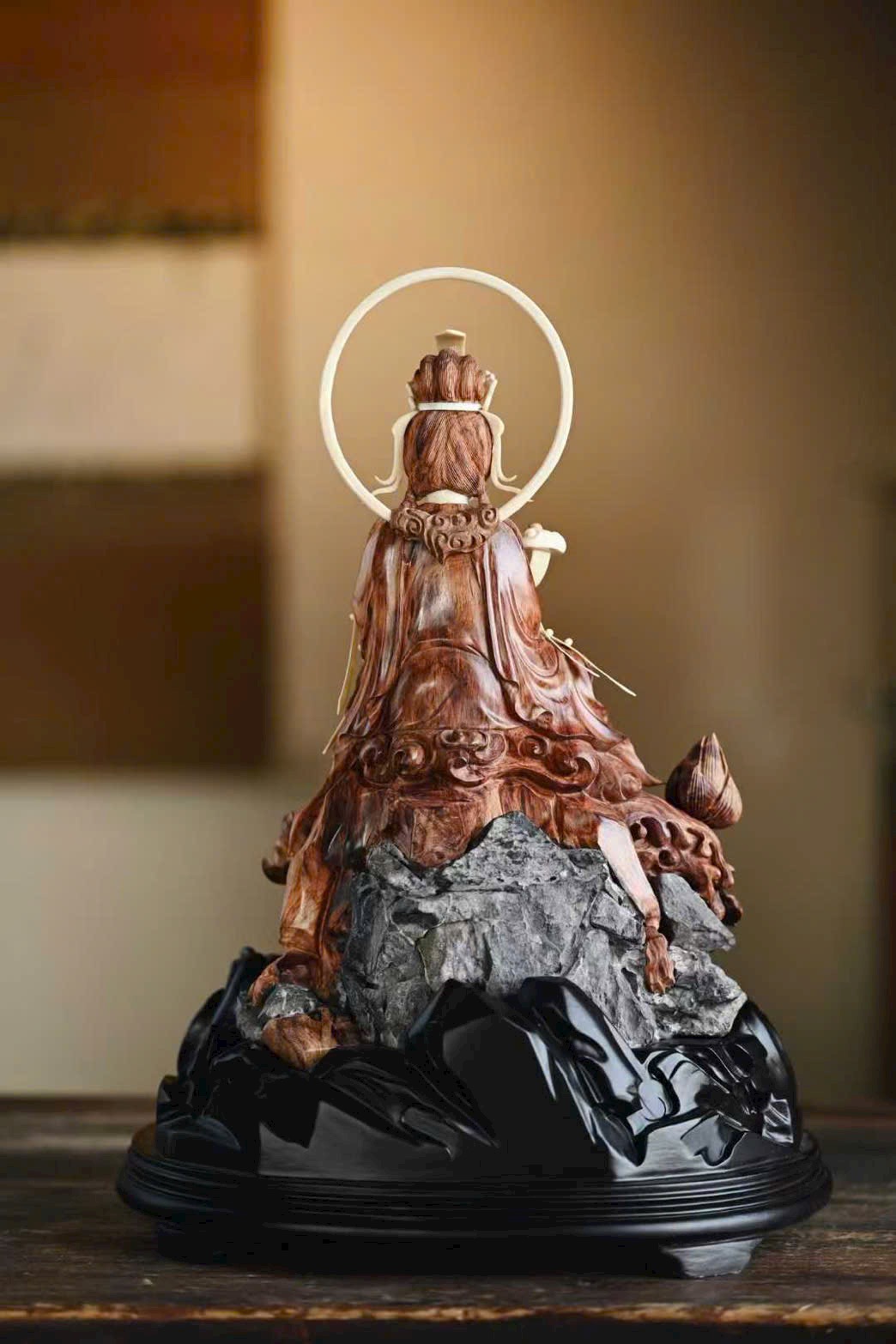 Tượng Quan Âm có dáng vẻ đoan trang thanh tú, pháp tướng hiền hòa; nếp áo uyển chuyển tự nhiên, mềm mại nhẹ bẫng. Đường khắc tinh tế sống động, đóa sen tràn đầy sinh khí, mang ý cát tường và trang nghiêm.