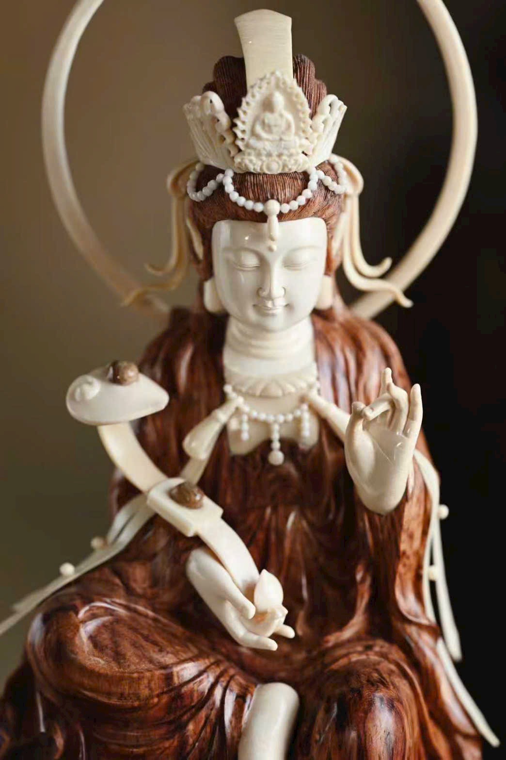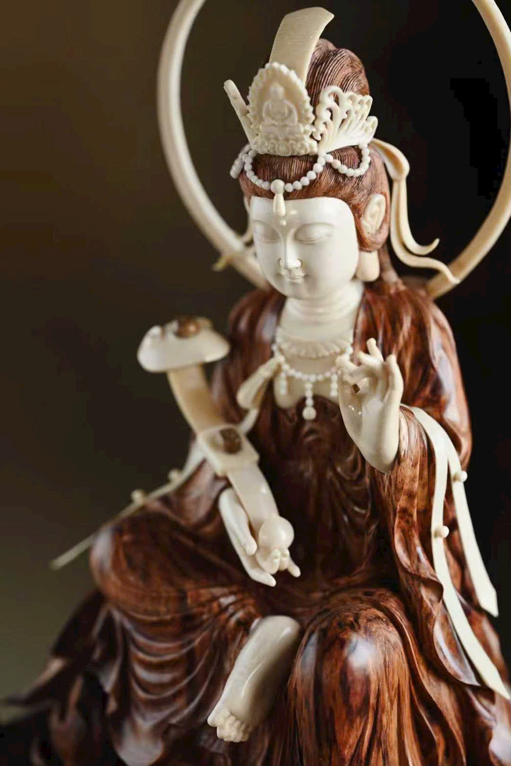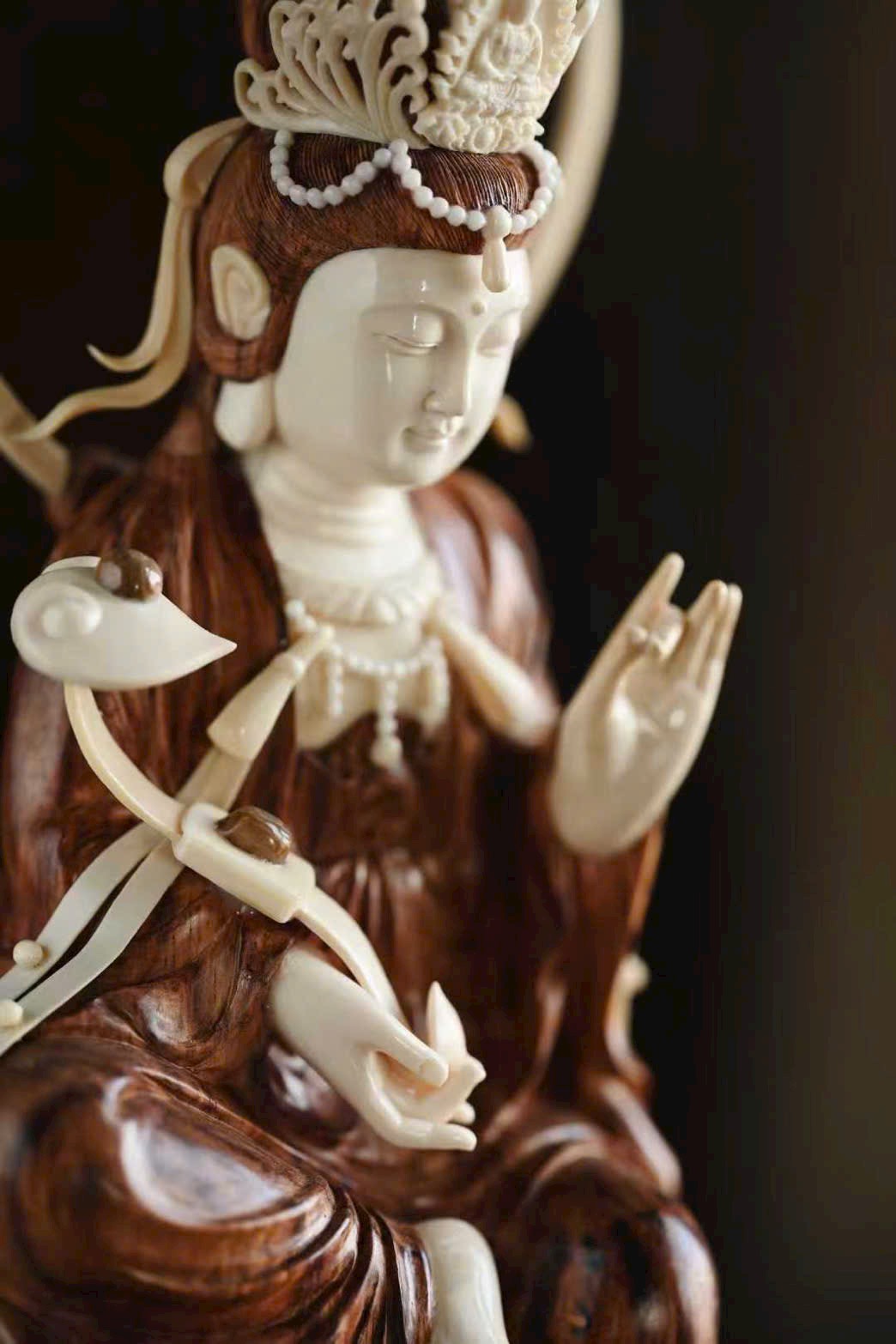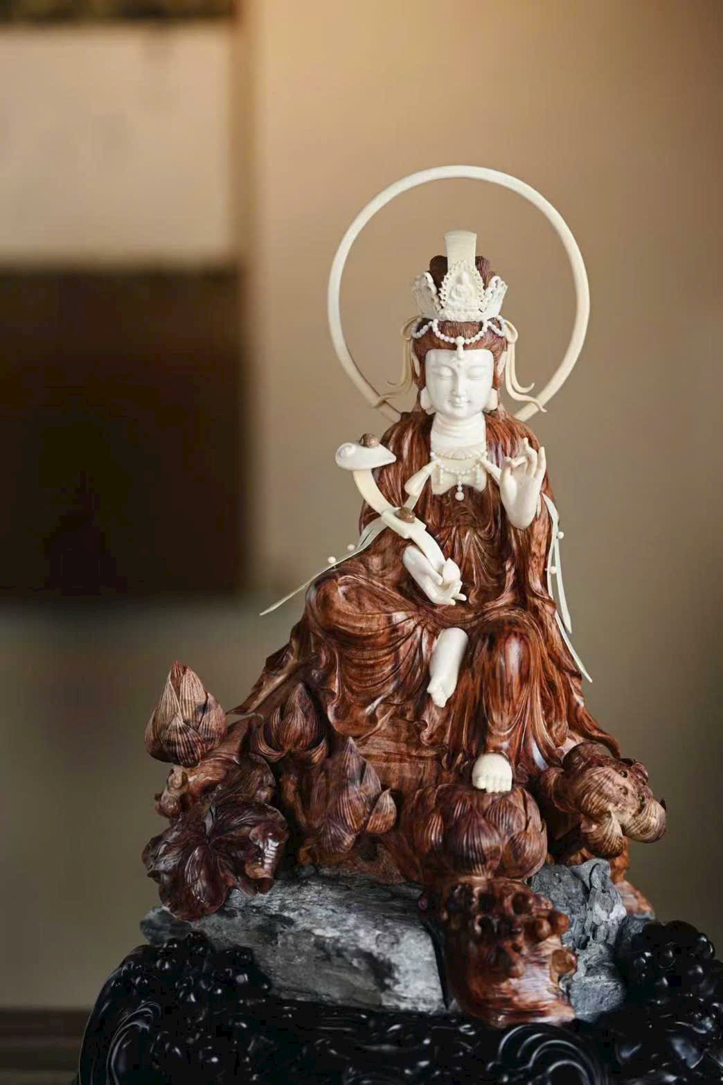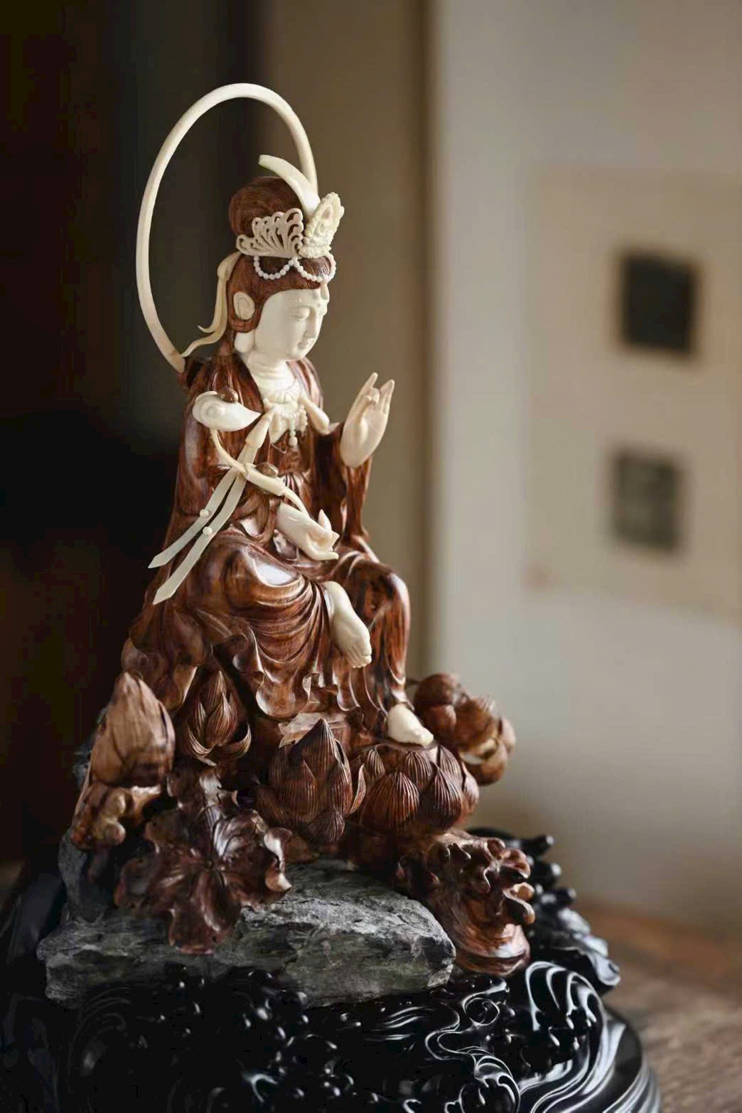 Tượng Quan Âm có dáng vẻ đoan trang thanh tú, pháp tướng hiền hòa; nếp áo uyển chuyển tự nhiên, mềm mại nhẹ bẫng. Đường khắc tinh tế sống động, đóa sen tràn đầy sinh khí, mang ý cát tường và trang nghiêm.