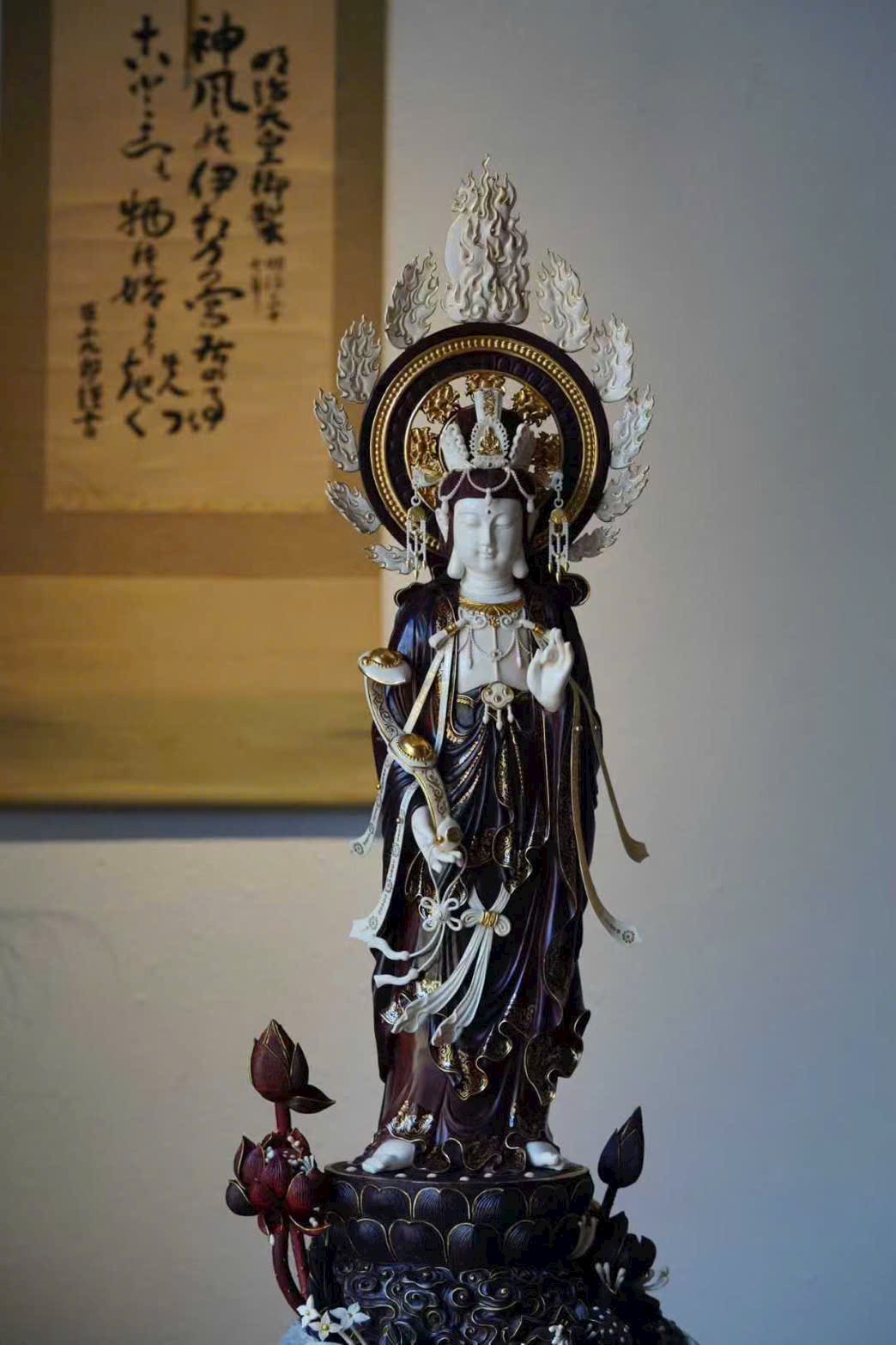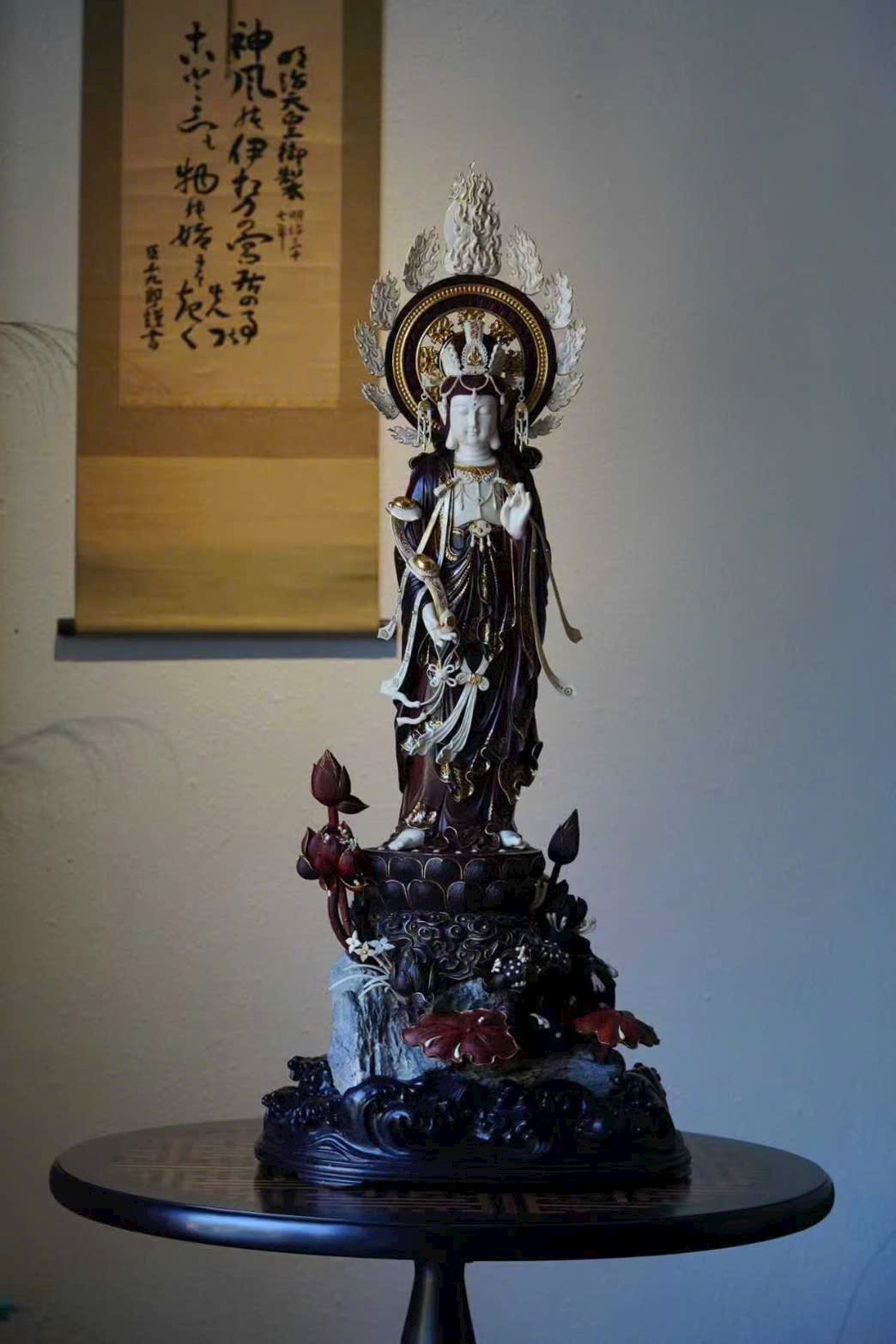 Màu gỗ ấm nhuận, thanh nhã. Quan Âm dung mạo đầy đặn, đôi mắt khẽ khép, tay cầm Như Ý, toát ra vẻ an tĩnh.