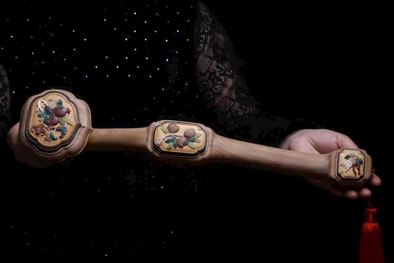 Tác phẩm “Tam Đa Như Ý” được chế tác từ gỗ đàn hương Lão Sơn quý hiếm, hoàn toàn bằng tay trên một khối gỗ liền nguyên, kết hợp kỹ thuật khảm bách bảo cổ truyền, tạo nên một hình tượng vừa tinh xảo vừa tràn đầy ý nghĩa tốt lành.