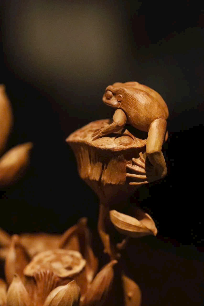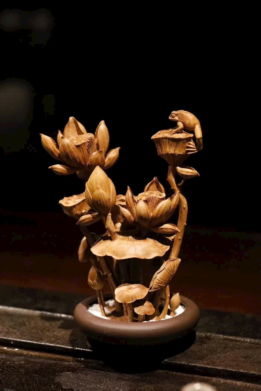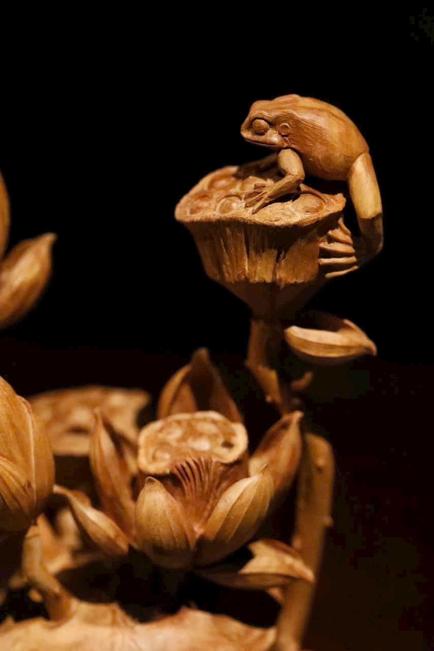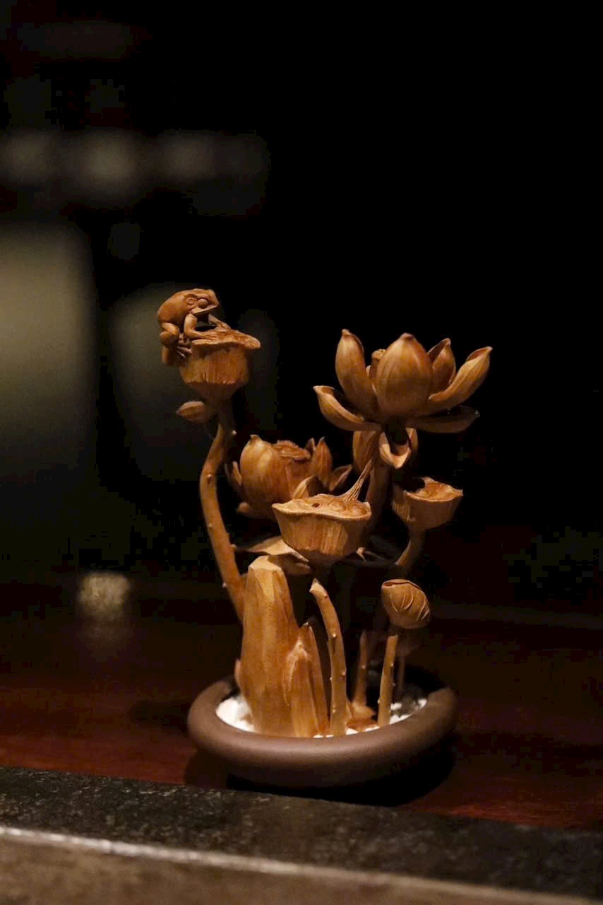 Tác phẩm điêu khắc xuyên suốt từ một khối gỗ, khắc hình hoa sen, đài sen và nụ sen đan xen tự nhiên. Sen tượng trưng cho phẩm chất cao quý, thanh sạch; ẩn hiện chú ếch nhỏ đầy sinh khí, hàm ý “Ếch kêu chiêu tài” – cát tường phú quý. Đường dao tinh tế tái hiện vẻ thanh nhã và sức sống mùa hạ của đầm sen trong một góc nhỏ trên bàn.