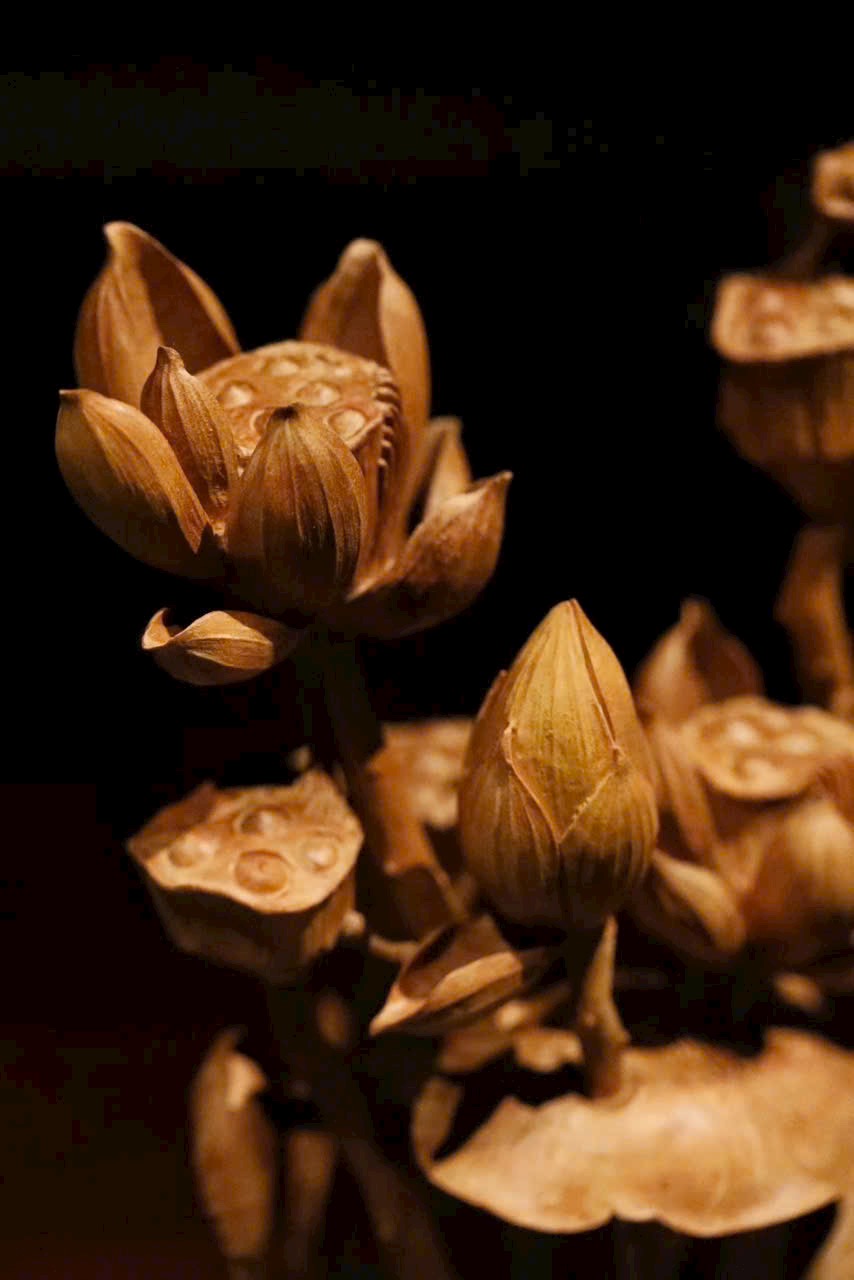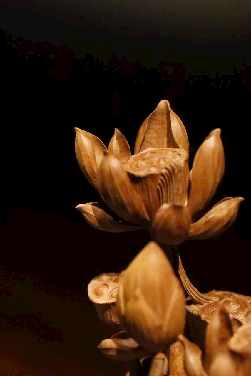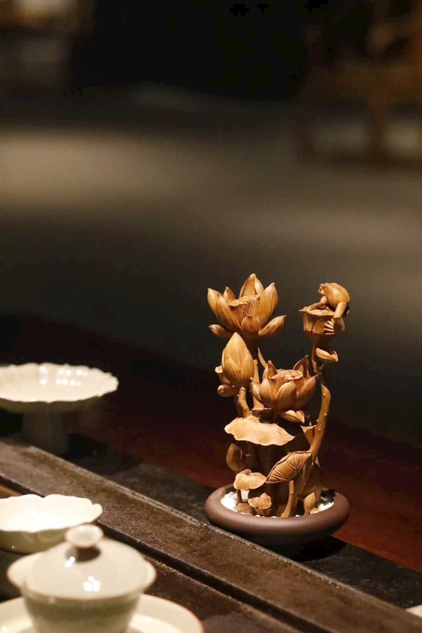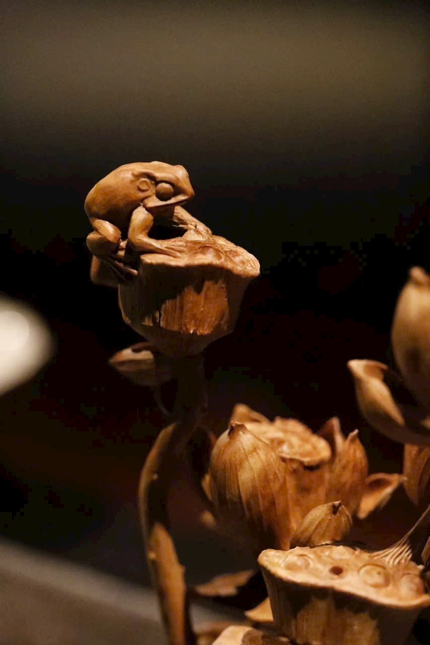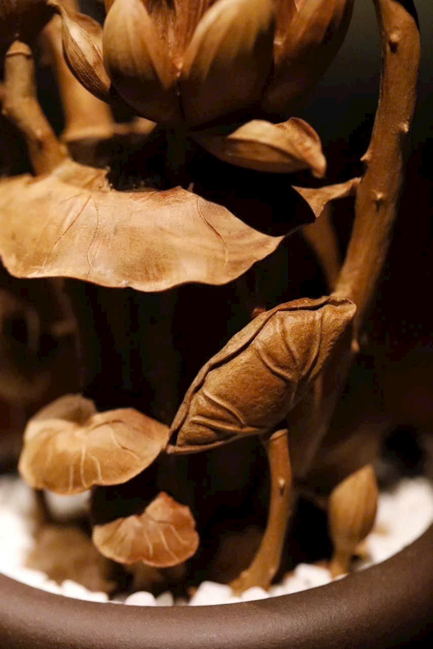 Tác phẩm điêu khắc xuyên suốt từ một khối gỗ, khắc hình hoa sen, đài sen và nụ sen đan xen tự nhiên. Sen tượng trưng cho phẩm chất cao quý, thanh sạch; ẩn hiện chú ếch nhỏ đầy sinh khí, hàm ý “Ếch kêu chiêu tài” – cát tường phú quý. Đường dao tinh tế tái hiện vẻ thanh nhã và sức sống mùa hạ của đầm sen trong một góc nhỏ trên bàn.