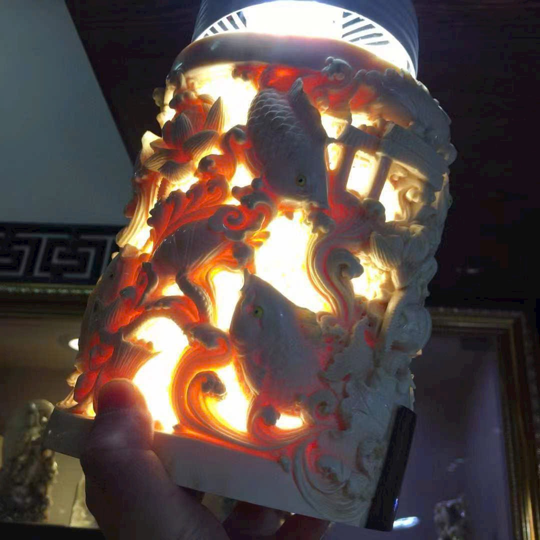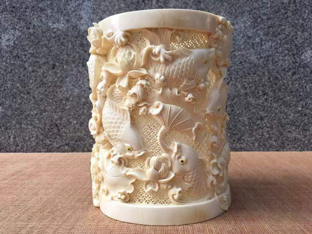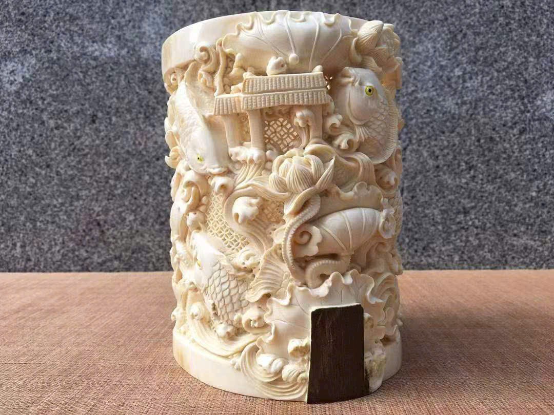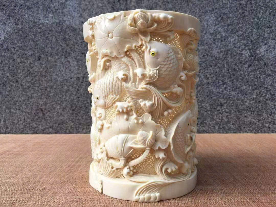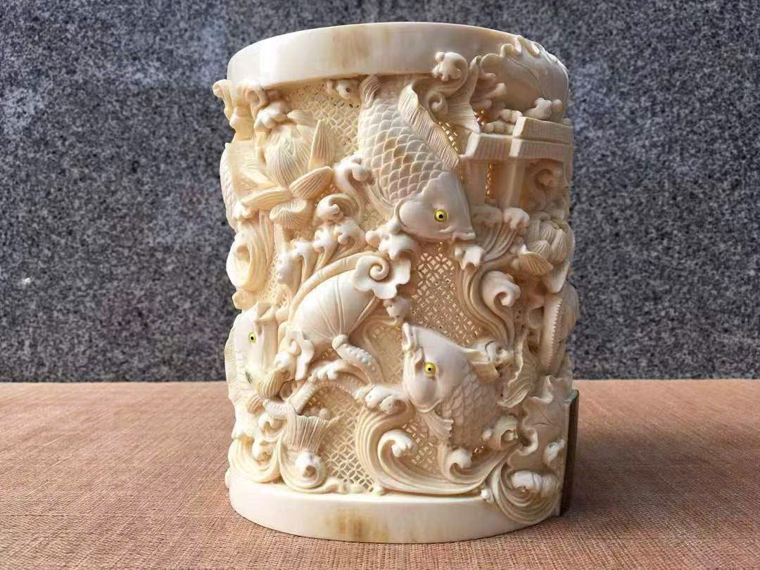 Tác phẩm do nghệ nhân thủ công điêu khắc rỗng tinh xảo, chất ngà ấm mịn, vân mượt tự nhiên, chi tiết sinh động và mềm mại. Hình tượng chín con cá chép tượng trưng cho trường cửu và dư dả quanh năm (“cửu” – lâu dài, “ngư” đồng âm với “dư”). Là món phẩm cao cấp, thích hợp để biếu tặng hoặc sưu tầm trưng bày.