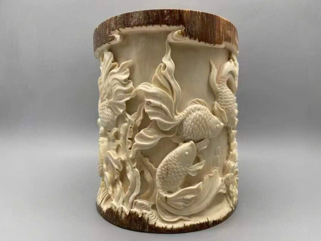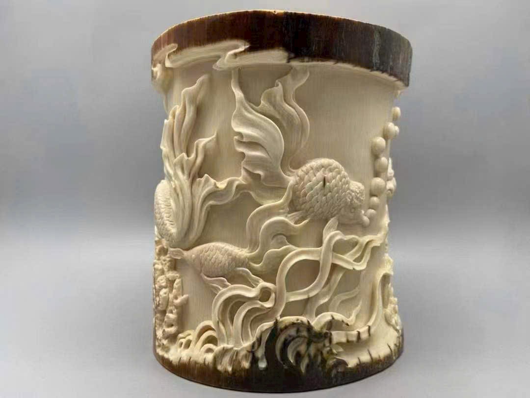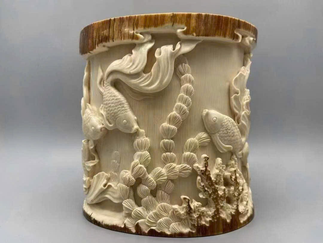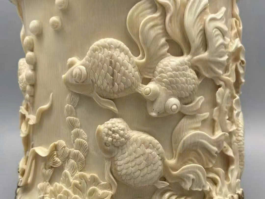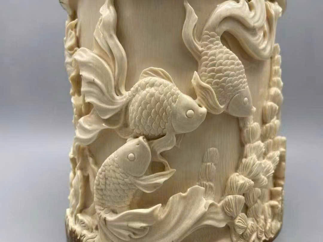Tác phẩm do nghệ nhân bậc thầy tinh xảo chạm khắc, giữ nguyên lớp vỏ ngà tự nhiên, biểu hiện sinh động và chân thực. Chủ đề “Phú quý hữu ngư – Kim ngọc mãn đường” mang ý nghĩa giàu sang, sung túc, năm nào cũng dư dả, tượng trưng cho cát tường thịnh vượng.