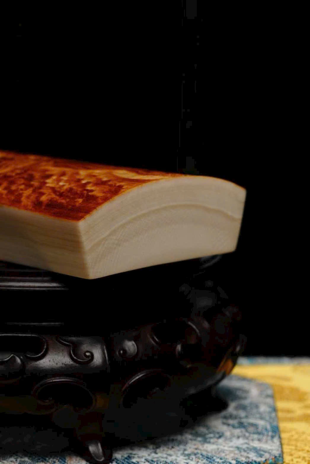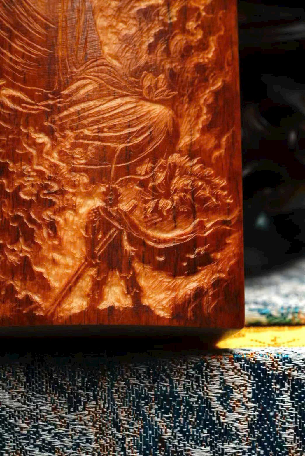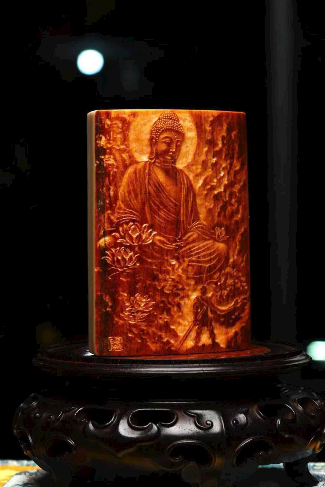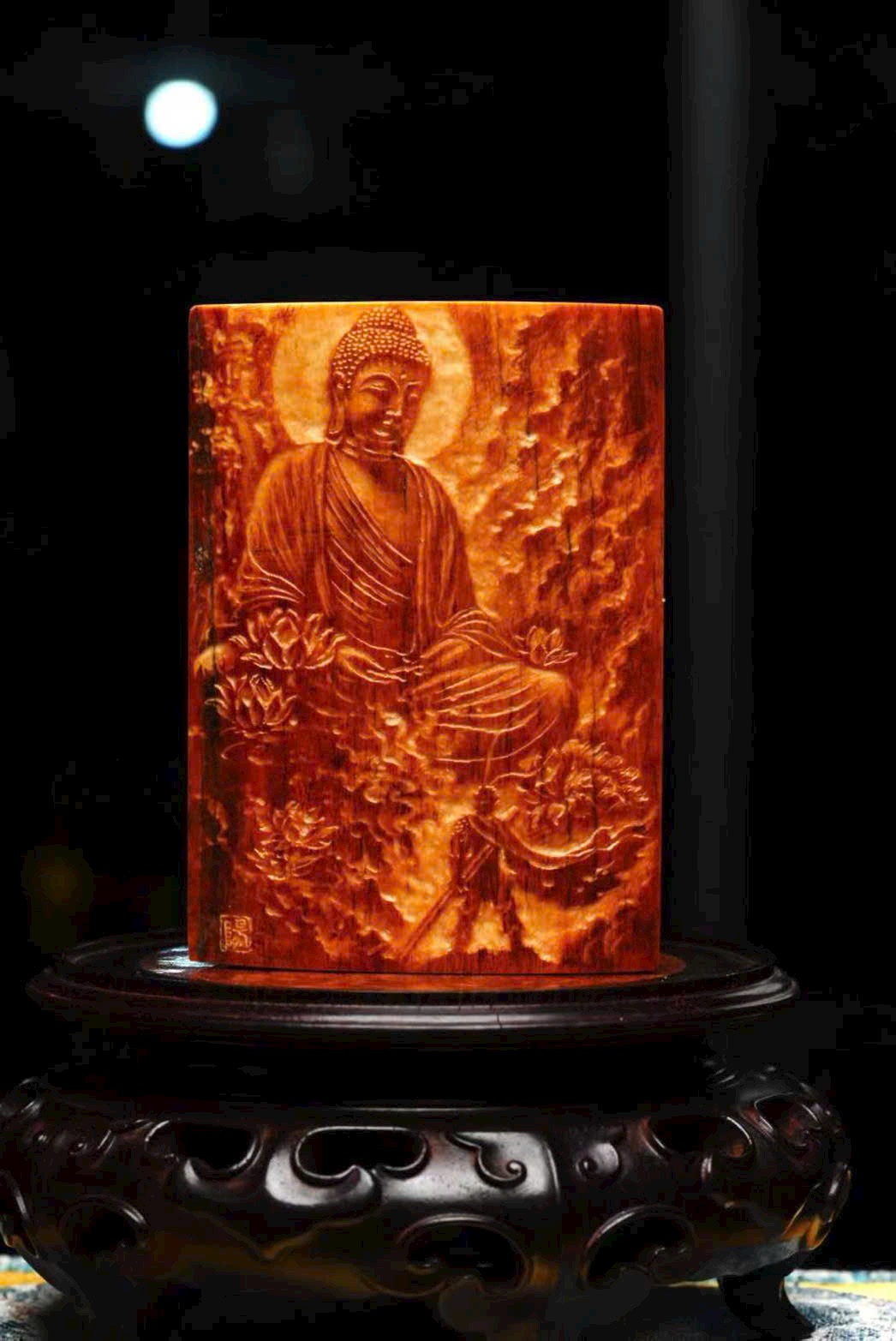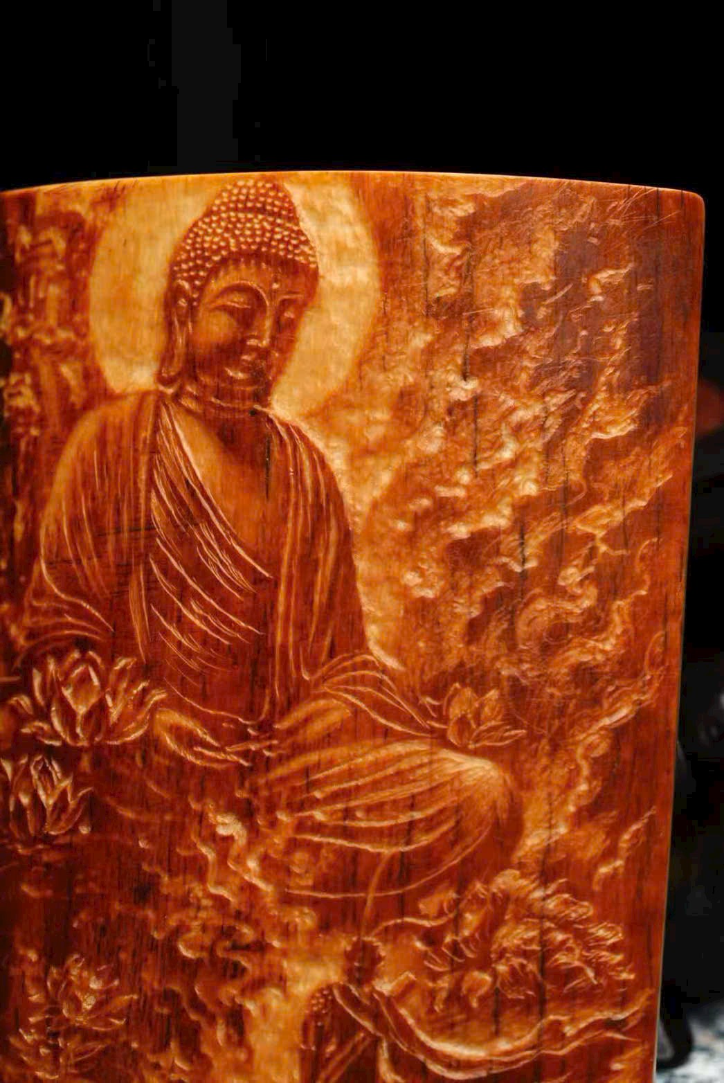 Thích Ca Mâu Ni ngồi ngay ngắn trên đỉnh mây lành, bảo tướng trang nghiêm, Phật quang phủ chiếu khắp trời đất. Ở phần khắc nông trên lớp da, Tôn Ngộ Không nhỏ tựa hạt cải, đang cúi mình hành lễ – chí tâm cầu đạo.