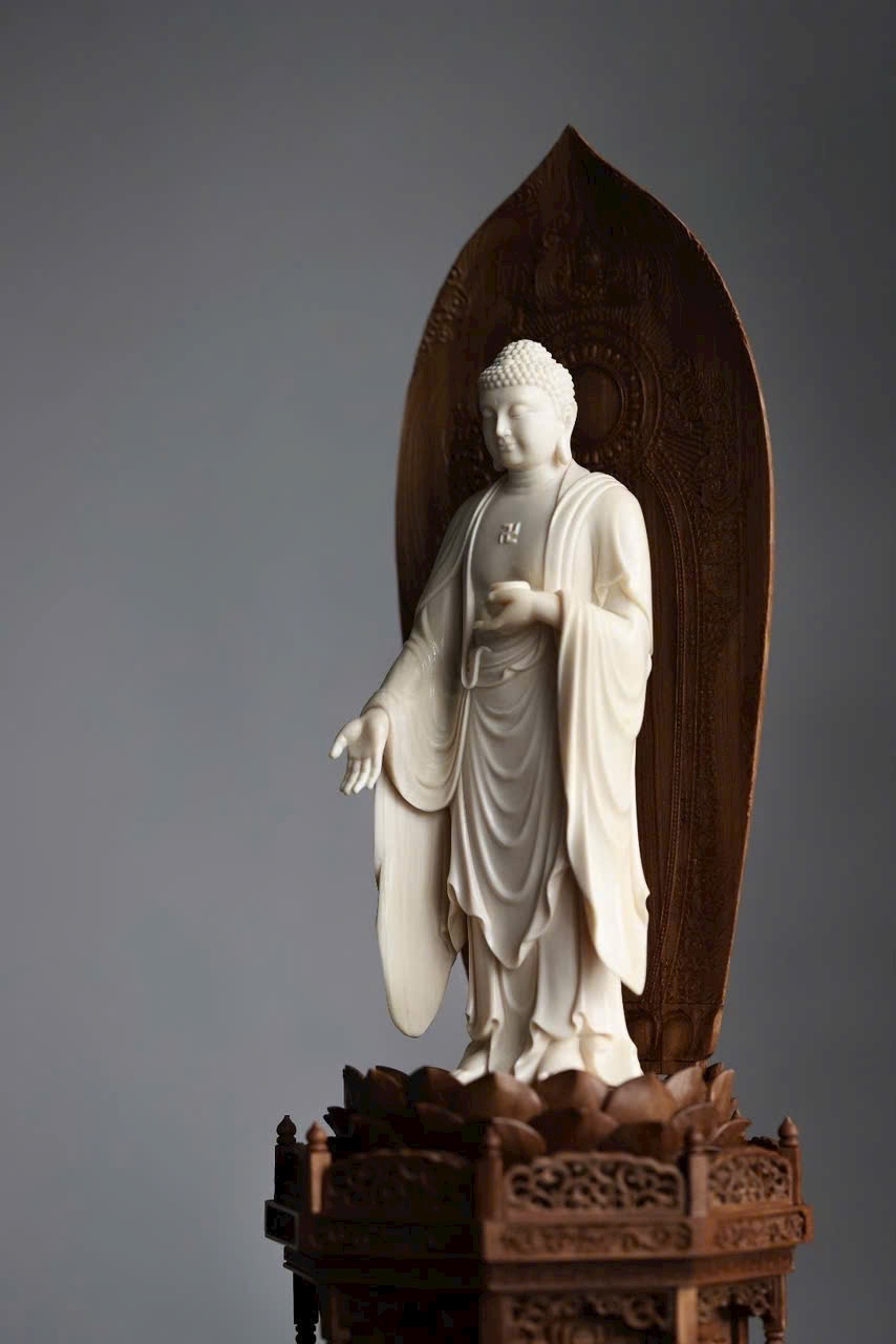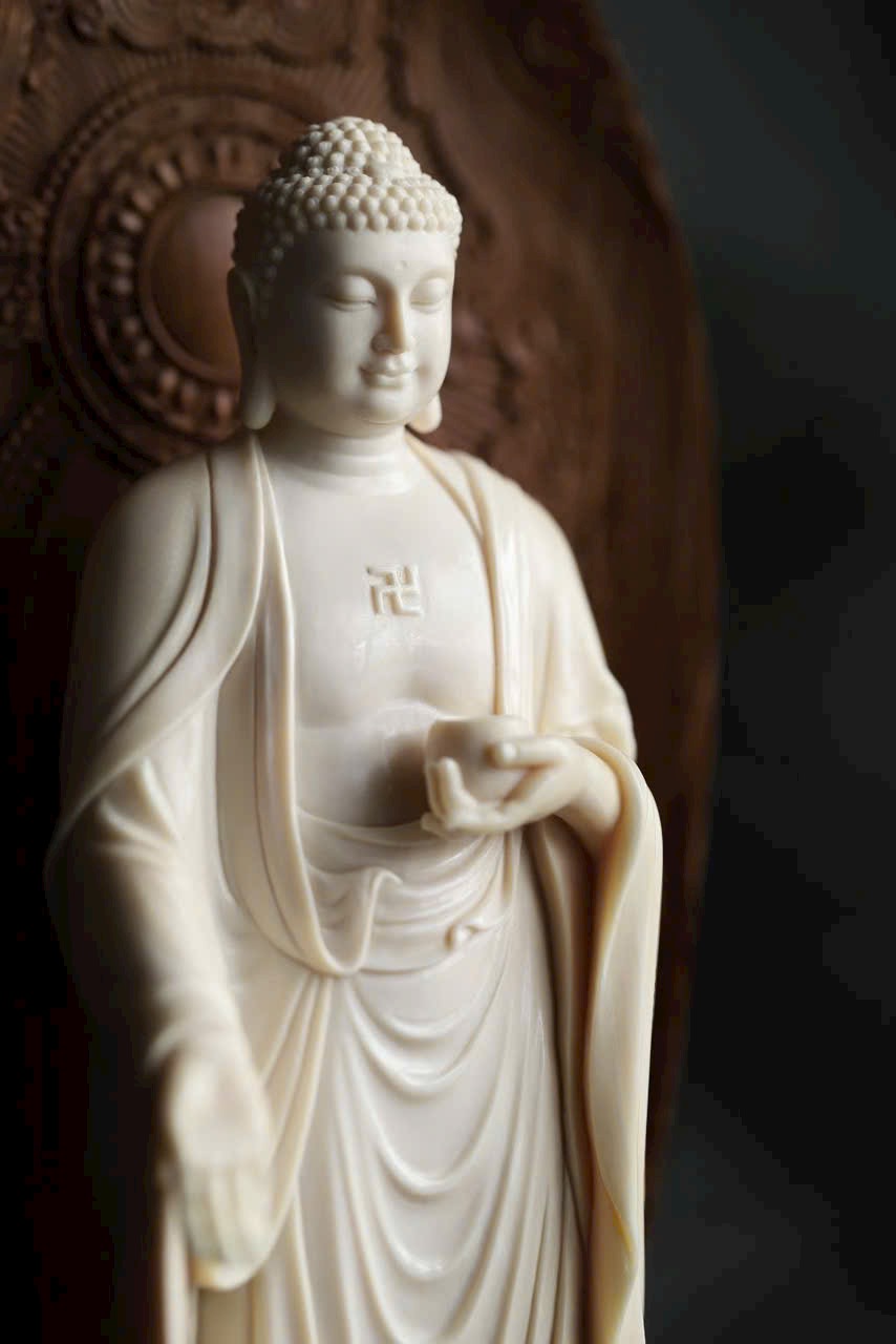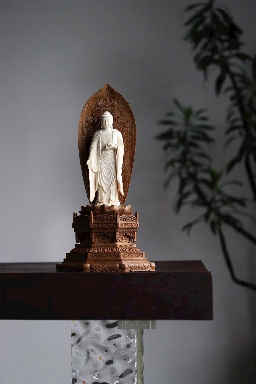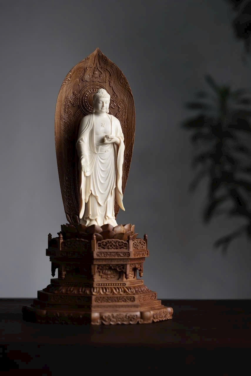 Phật A Di Đà mắt khép an nhiên, tay nâng bình bát, y phục uyển chuyển như nước chảy. Đế gỗ Đàn Hương Ấn Độ thơm nức hình đài sen tầng tầng, hương gỗ nhẹ lan. Dâng đặt nơi tịnh tâm, bát tuy không mà dung chứa vạn pháp, tĩnh nhìn mà ngộ trí tuệ.