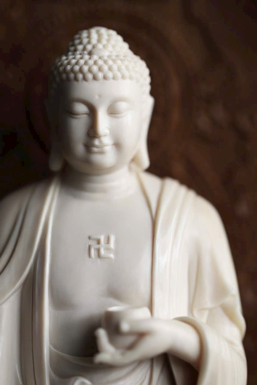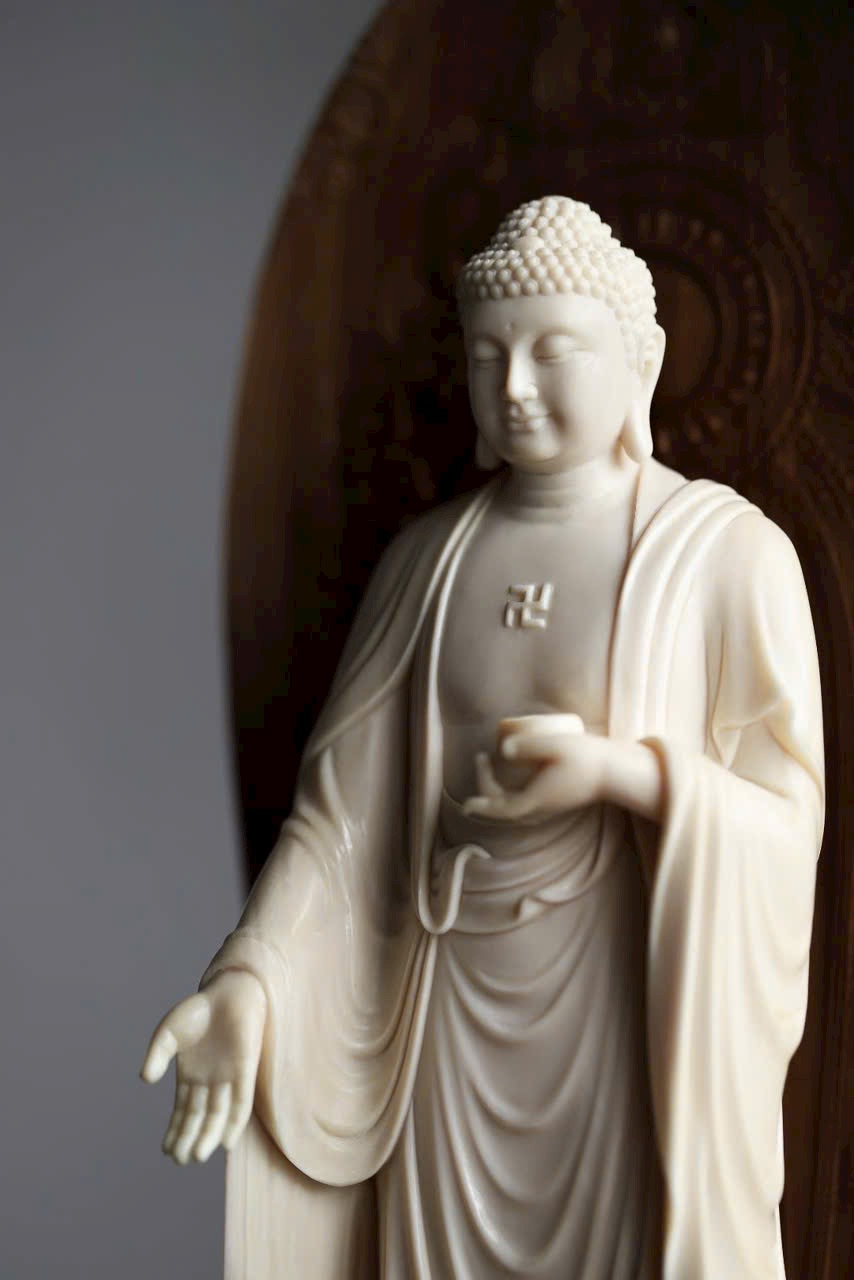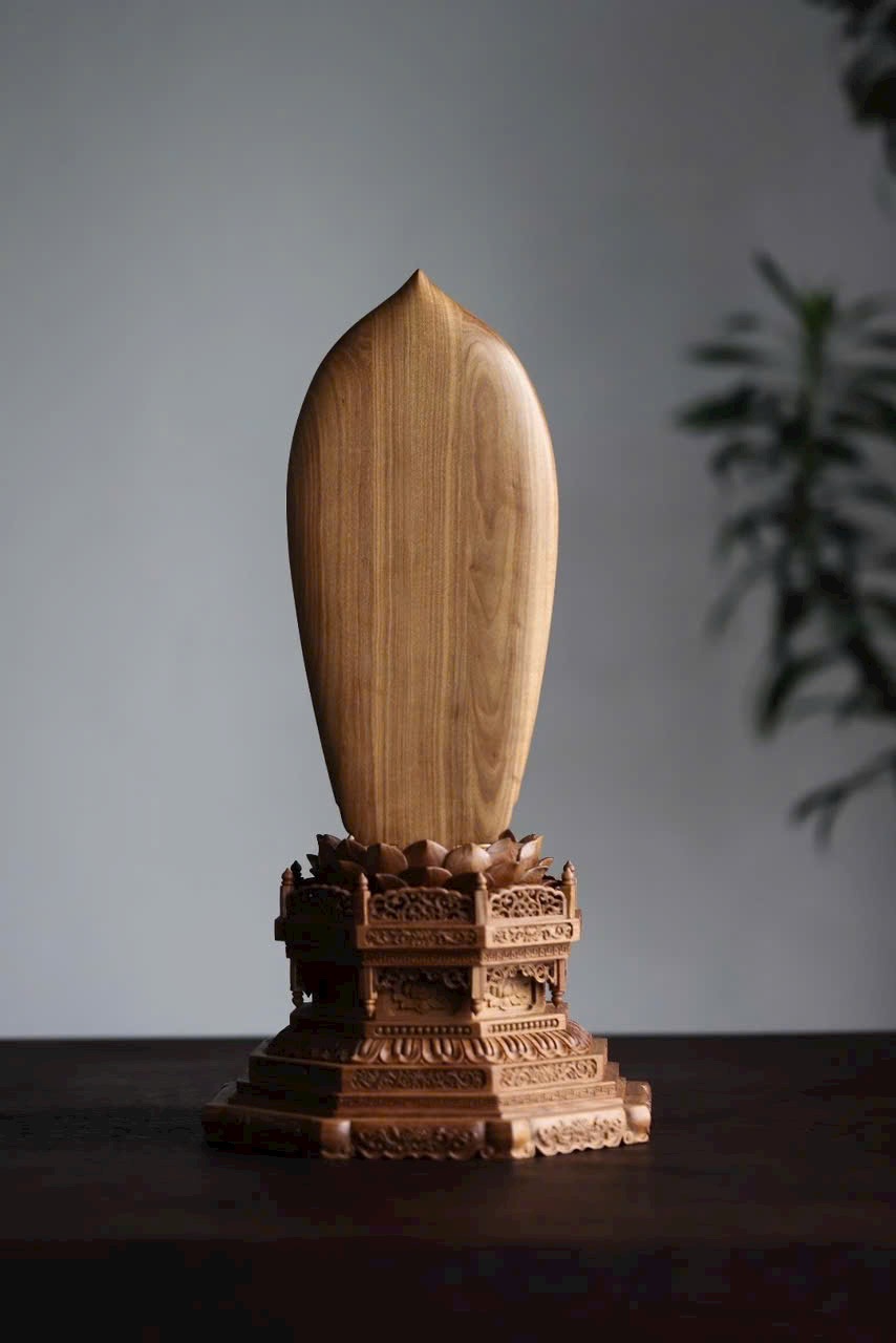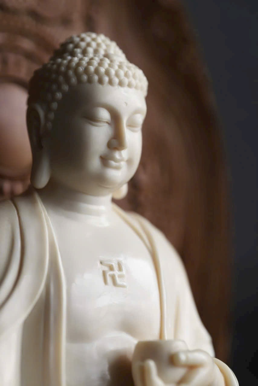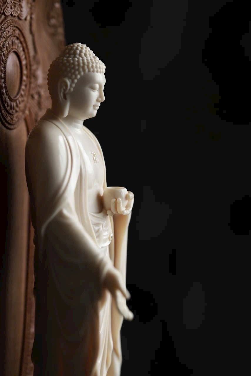 Phật A Di Đà mắt khép an nhiên, tay nâng bình bát, y phục uyển chuyển như nước chảy. Đế gỗ Đàn Hương Ấn Độ thơm nức hình đài sen tầng tầng, hương gỗ nhẹ lan. Dâng đặt nơi tịnh tâm, bát tuy không mà dung chứa vạn pháp, tĩnh nhìn mà ngộ trí tuệ.