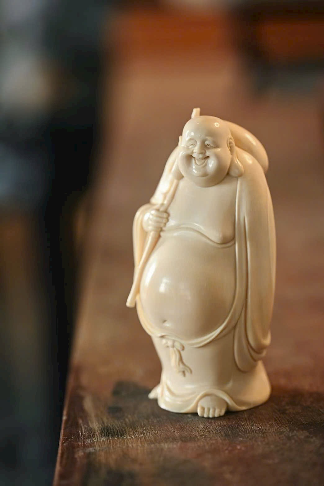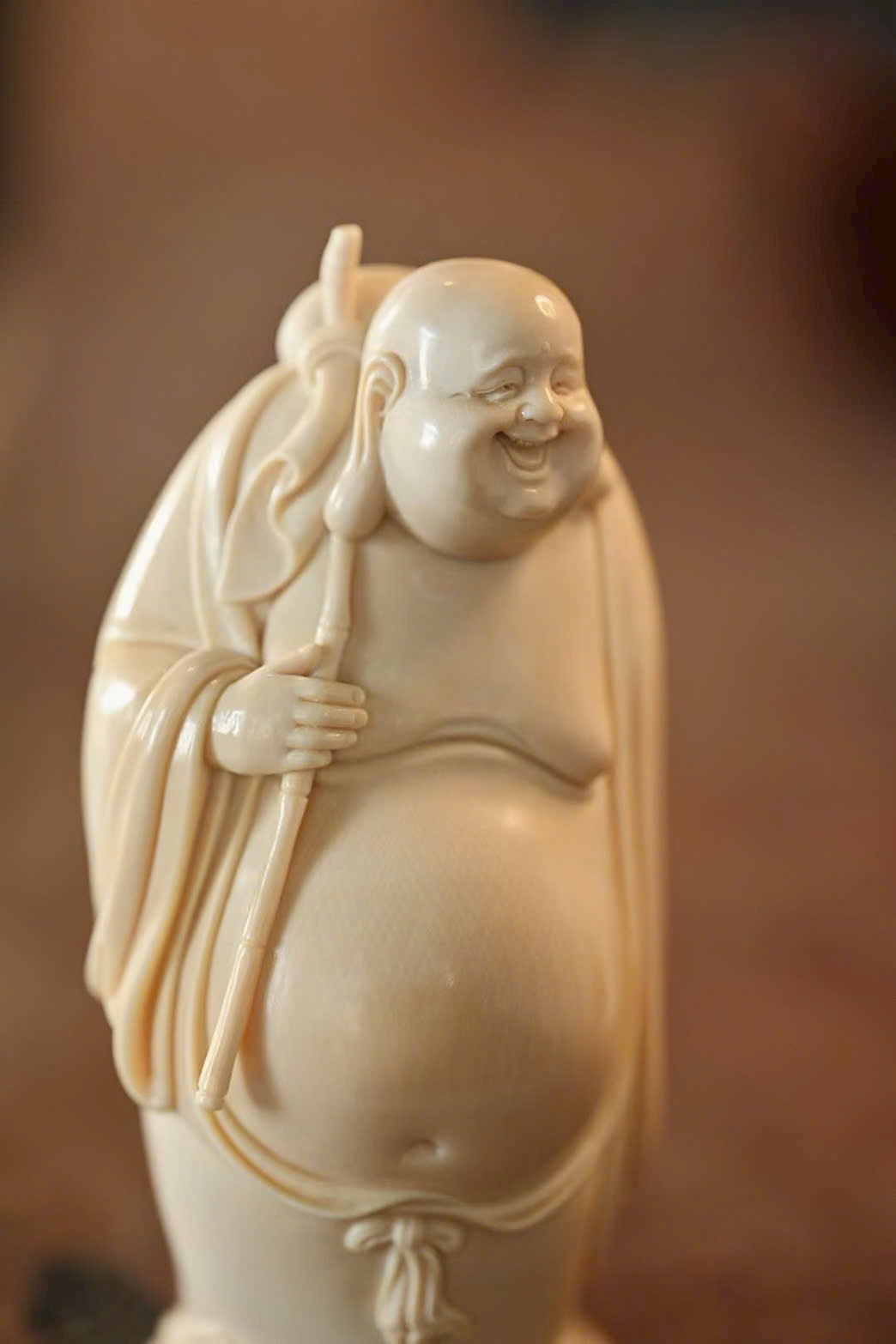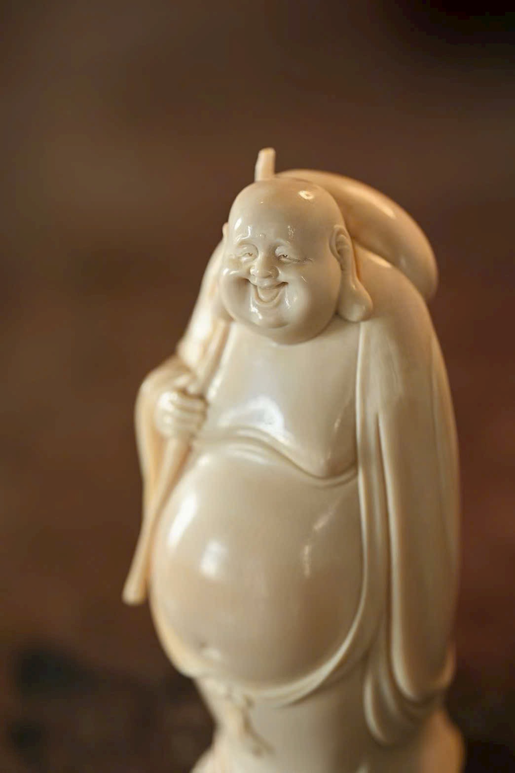 Tạo hình khuôn mặt độc đáo, khắc họa thần thái sinh động bằng đường dao đơn giản mà tinh tế. Vui tươi mà không tầm thường – “vừa nhìn đã bật cười, Phật cũng là chúng sinh”. Gợi nét duyên dáng khiến người xem khó không mỉm cười.