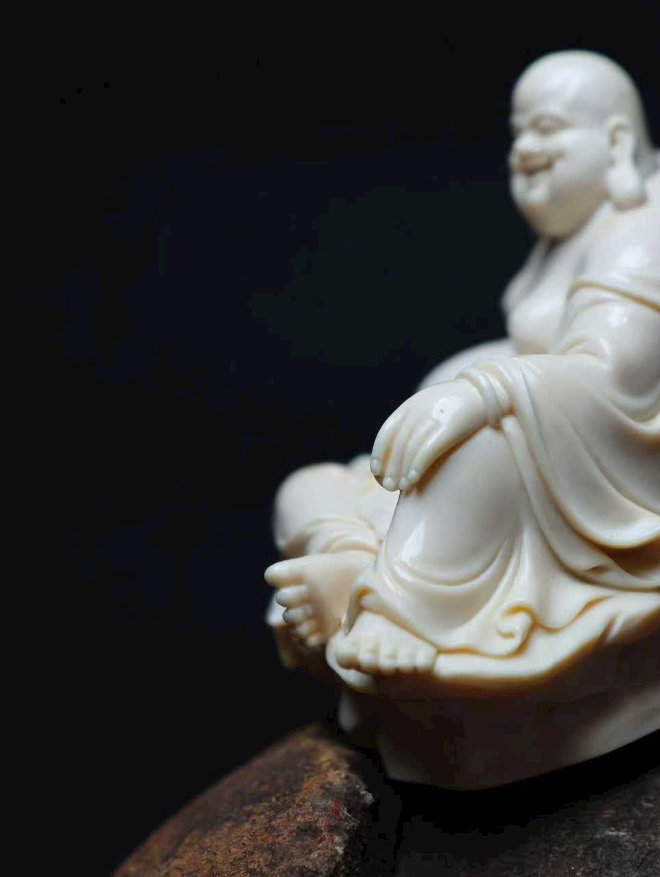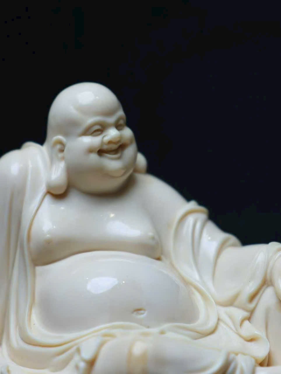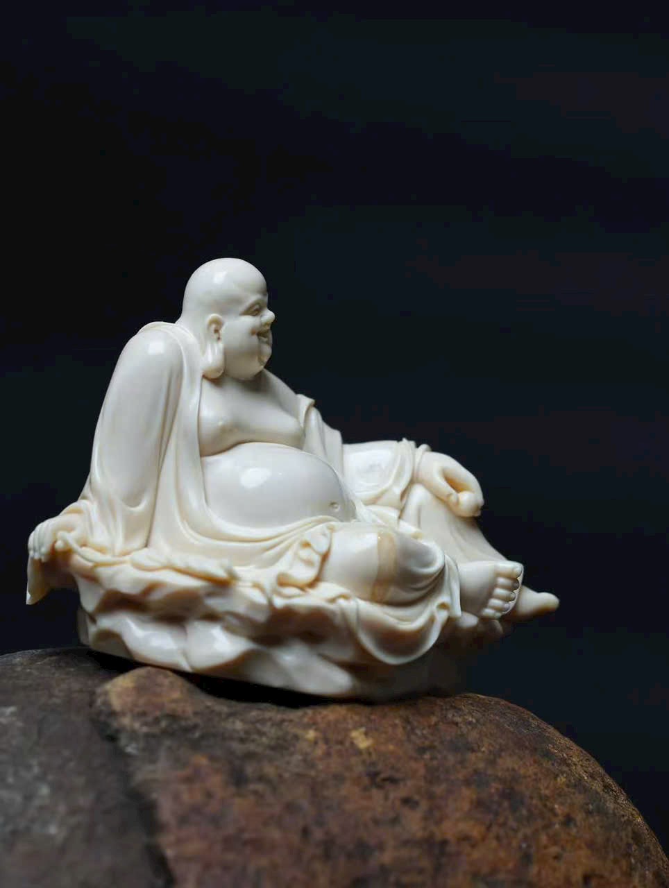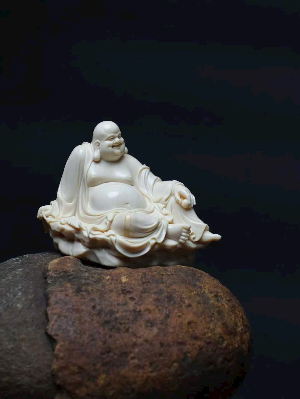 Tượng Di Lặc tròn đầy, mập mạp, dáng ngồi uyển chuyển tự nhiên, đường nét mềm mại. Gương mặt tươi cười, biểu cảm sinh động, tạo hình hài hòa, nhìn vào khiến lòng người ngập tràn niềm vui.