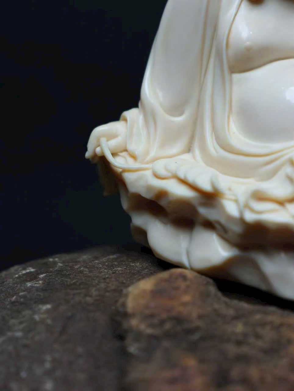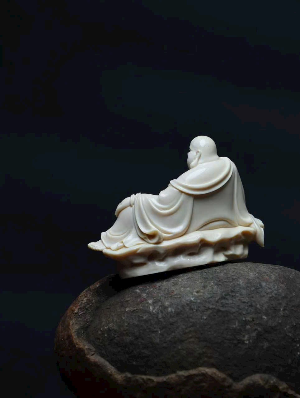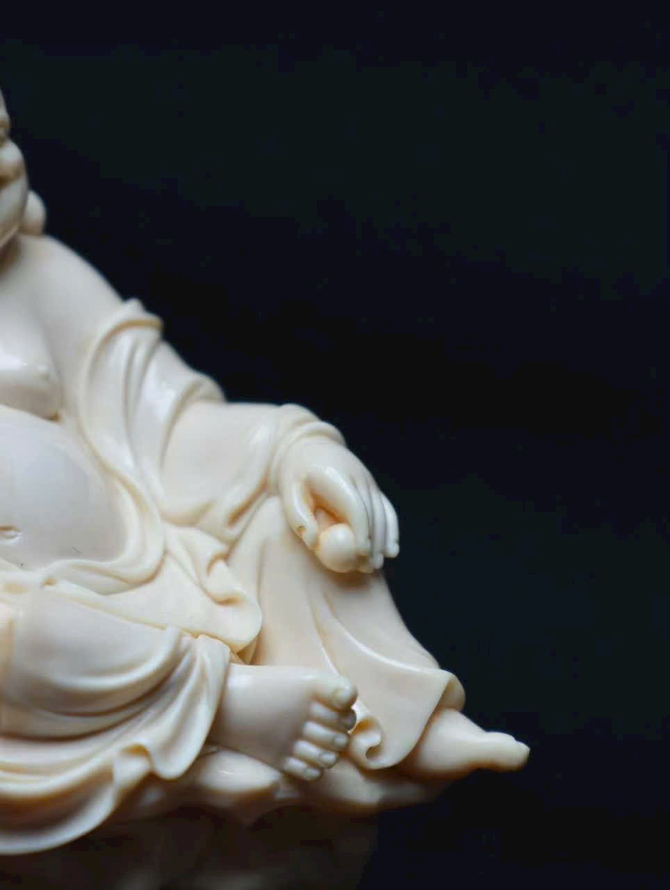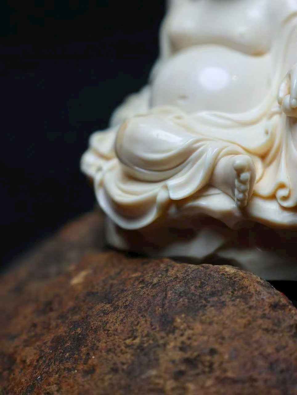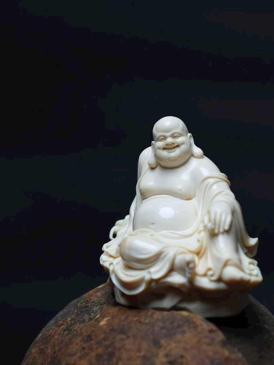 Tượng Di Lặc tròn đầy, mập mạp, dáng ngồi uyển chuyển tự nhiên, đường nét mềm mại. Gương mặt tươi cười, biểu cảm sinh động, tạo hình hài hòa, nhìn vào khiến lòng người ngập tràn niềm vui.