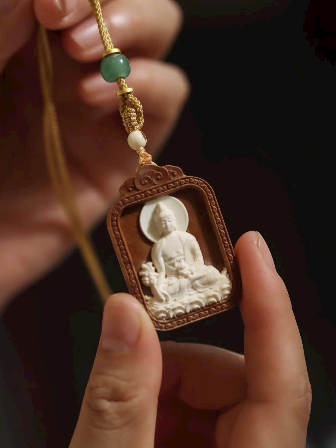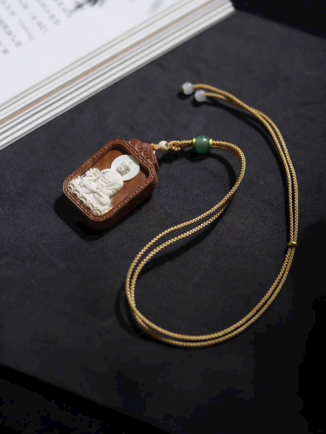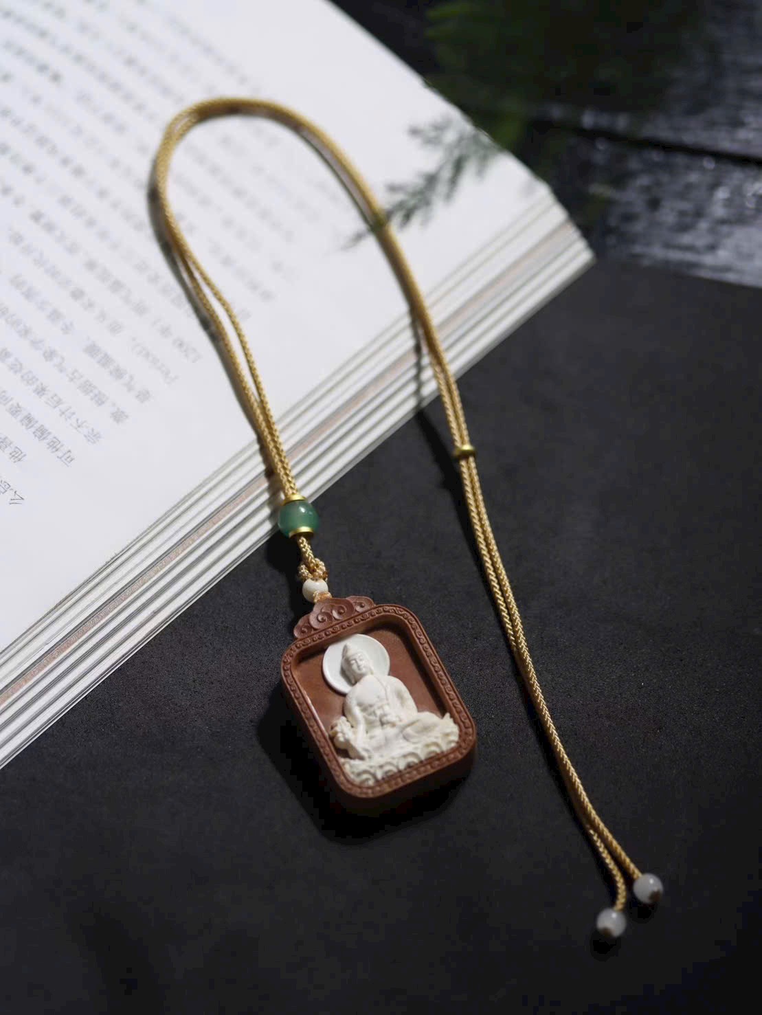 Chế tác từ đàn hương kết hợp m.a mút khảm liền mạch, kỹ nghệ tinh xảo độc đáo. Phối dây treo cao cấp, tặng kèm hộp quà sang trọng – phù hợp tự đeo hoặc biếu tặng.