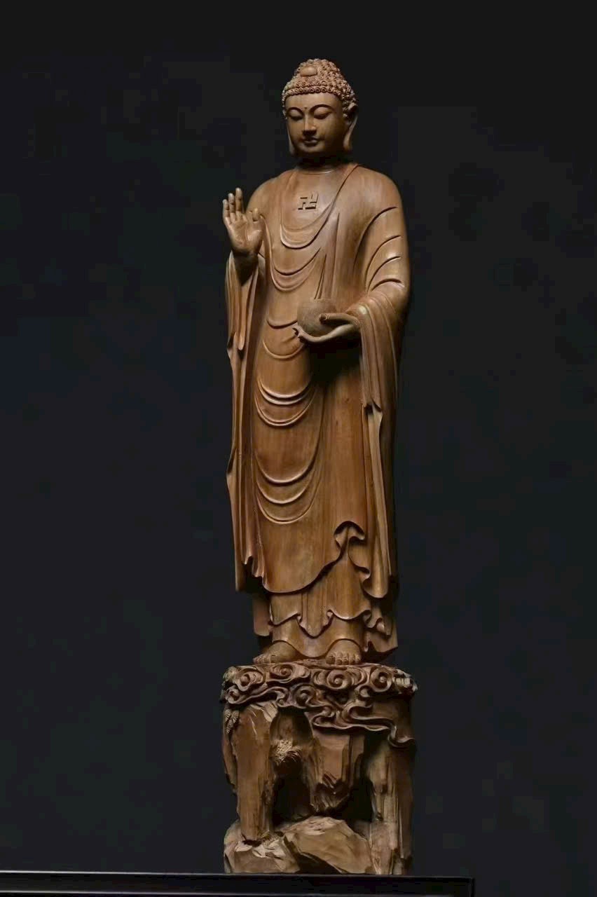 Tượng Thế Tôn với gương mặt đầy đặn hiền hòa, tay tròn mềm mại. Tay trái đặt trước bụng kết ấn thiền định, khoác áo ca sa hở vai phải, nếp áo tự nhiên mềm mại. Tóc xoắn ốc chạm tinh tế, từng chi tiết tỉ mỉ, tôn lên vẻ trang nghiêm. Phật đứng trên đài sen, dáng vẻ đoan trang, thanh tịnh.
