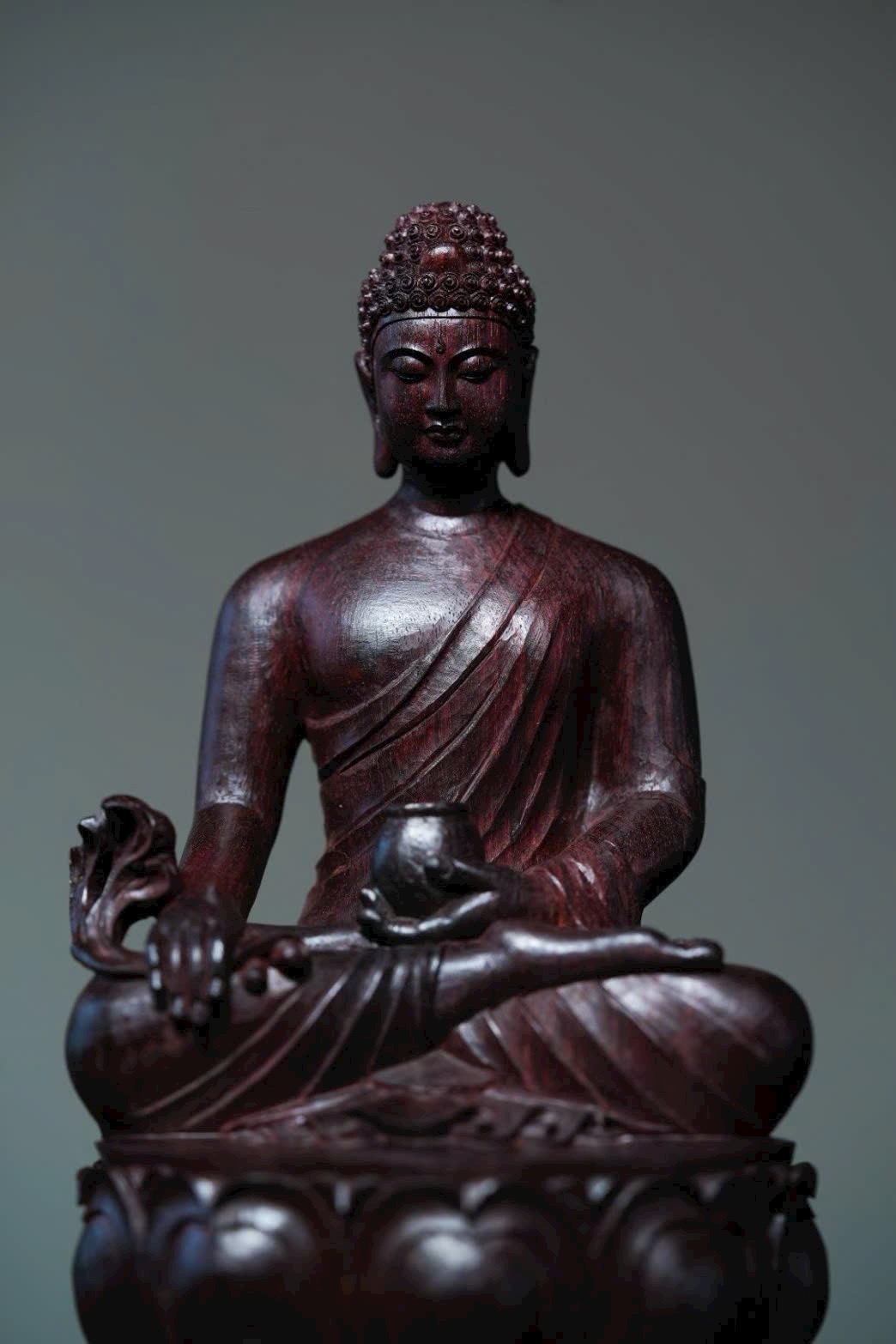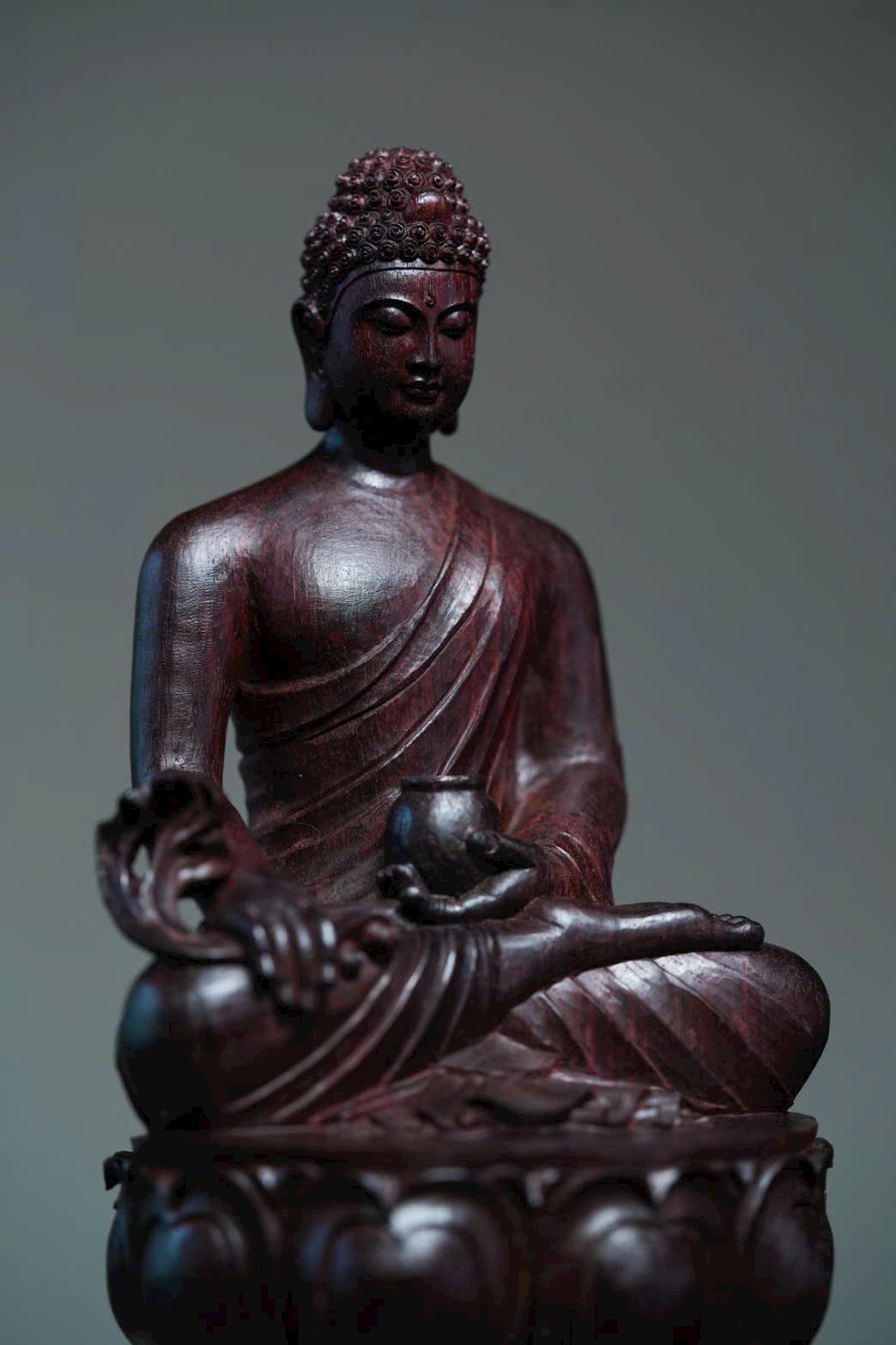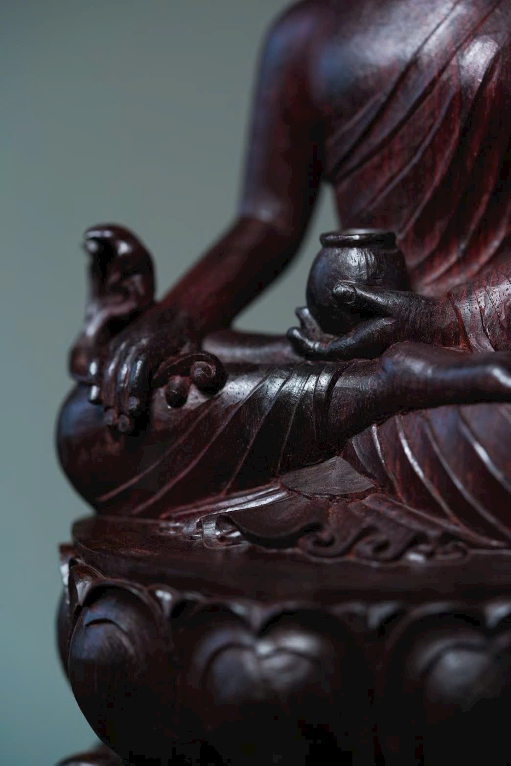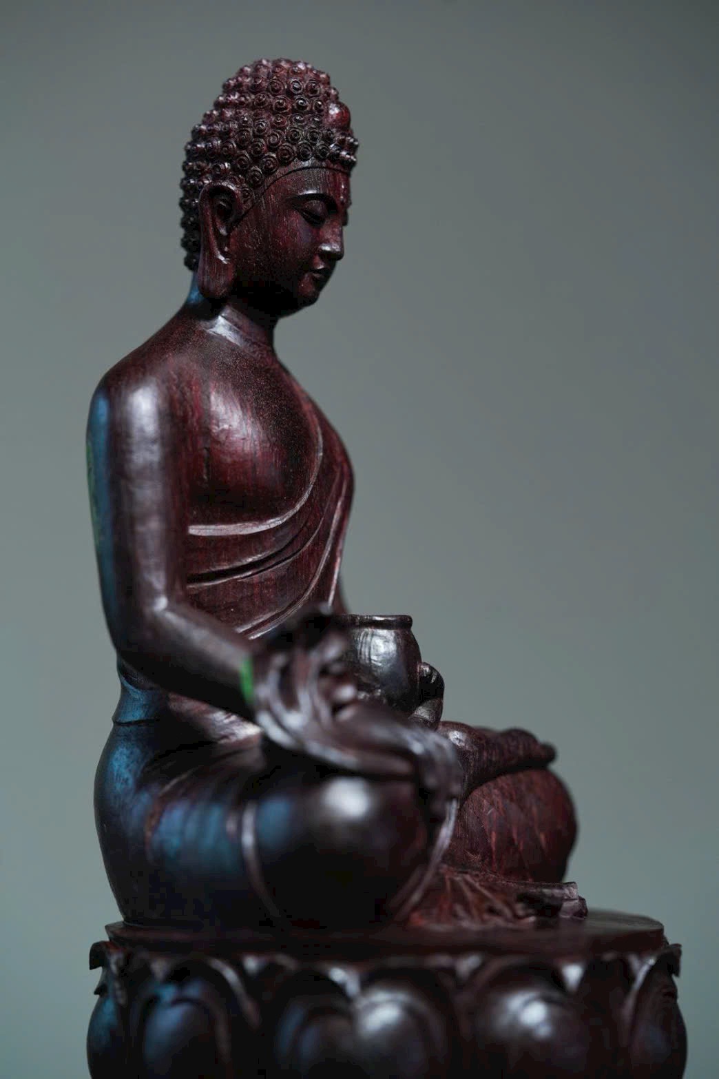 Tuyển chọn chất liệu gỗ Tử Đàn Ấn Độ mịn màng, thanh nhã, đường dao khắc vững vàng, đường nét giản lược tinh tế, toát lên thần thái trầm tĩnh và uy nghiêm.