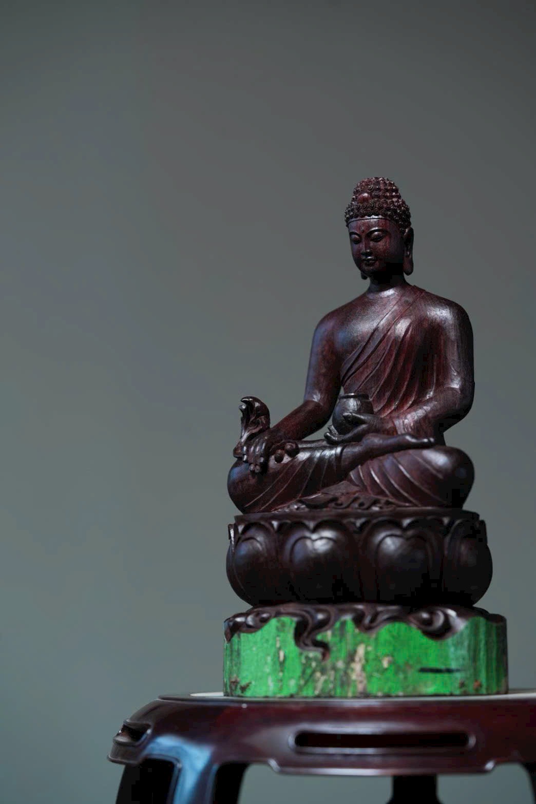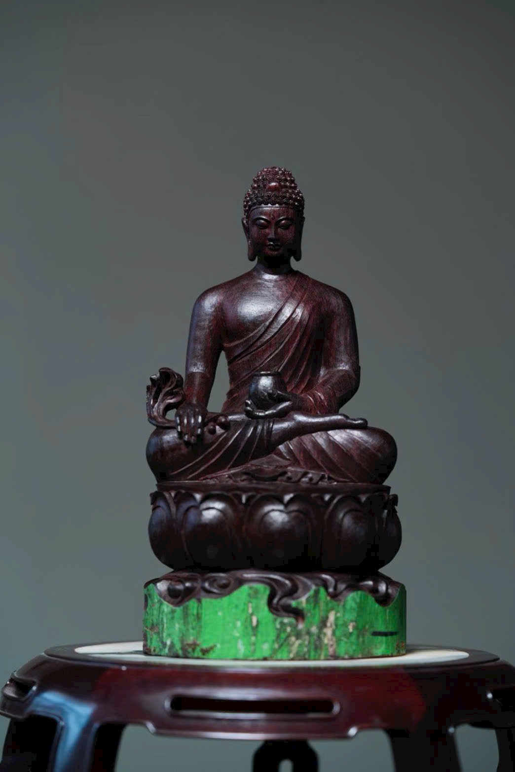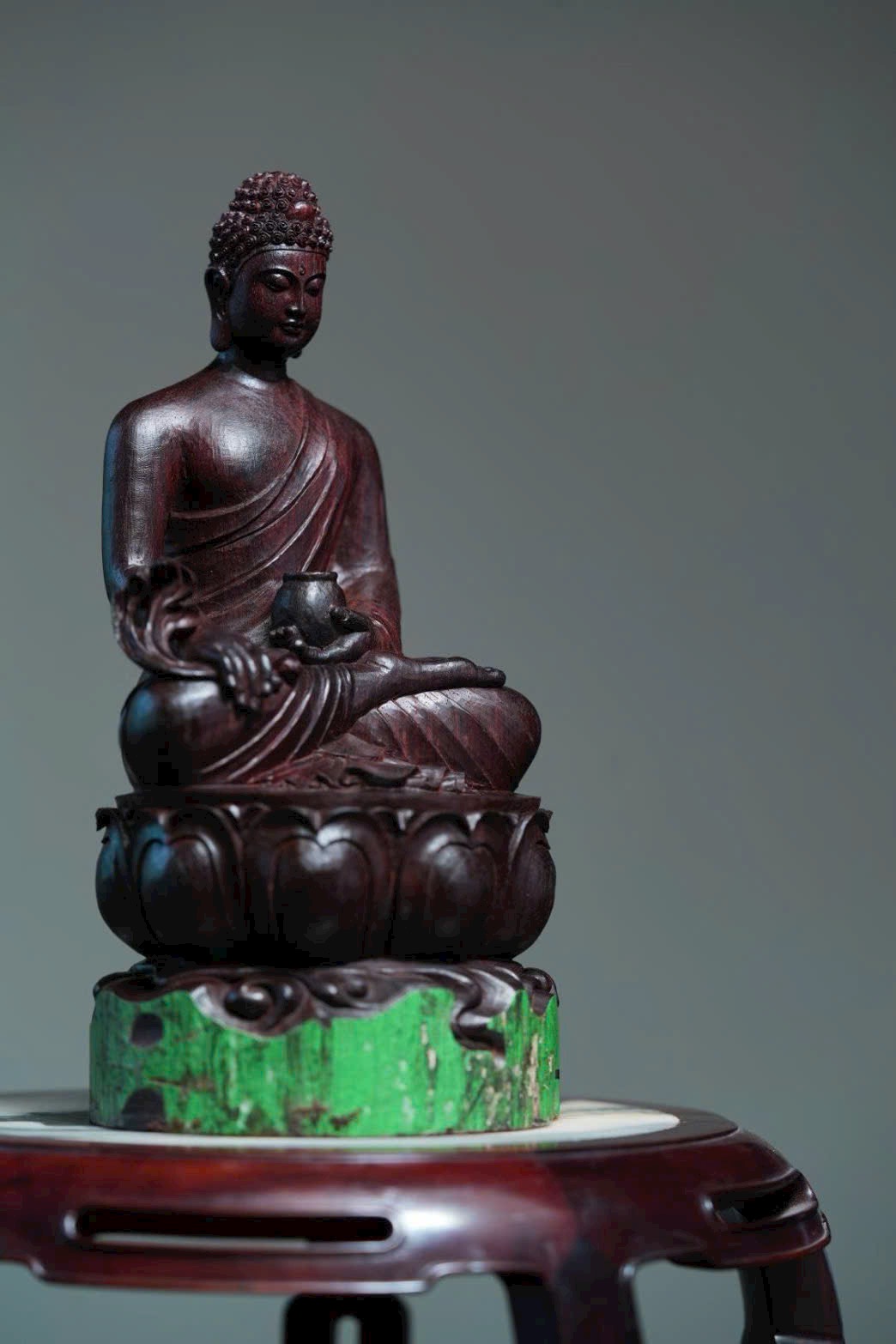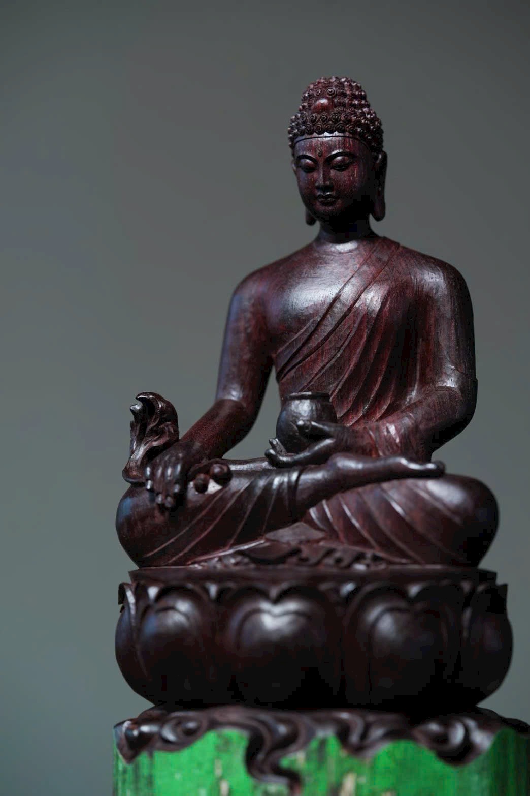 Tuyển chọn chất liệu gỗ Tử Đàn Ấn Độ mịn màng, thanh nhã, đường dao khắc vững vàng, đường nét giản lược tinh tế, toát lên thần thái trầm tĩnh và uy nghiêm.