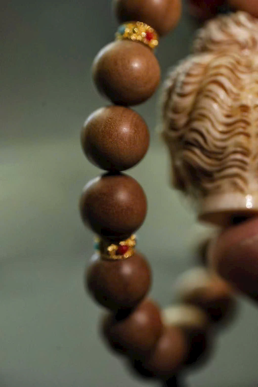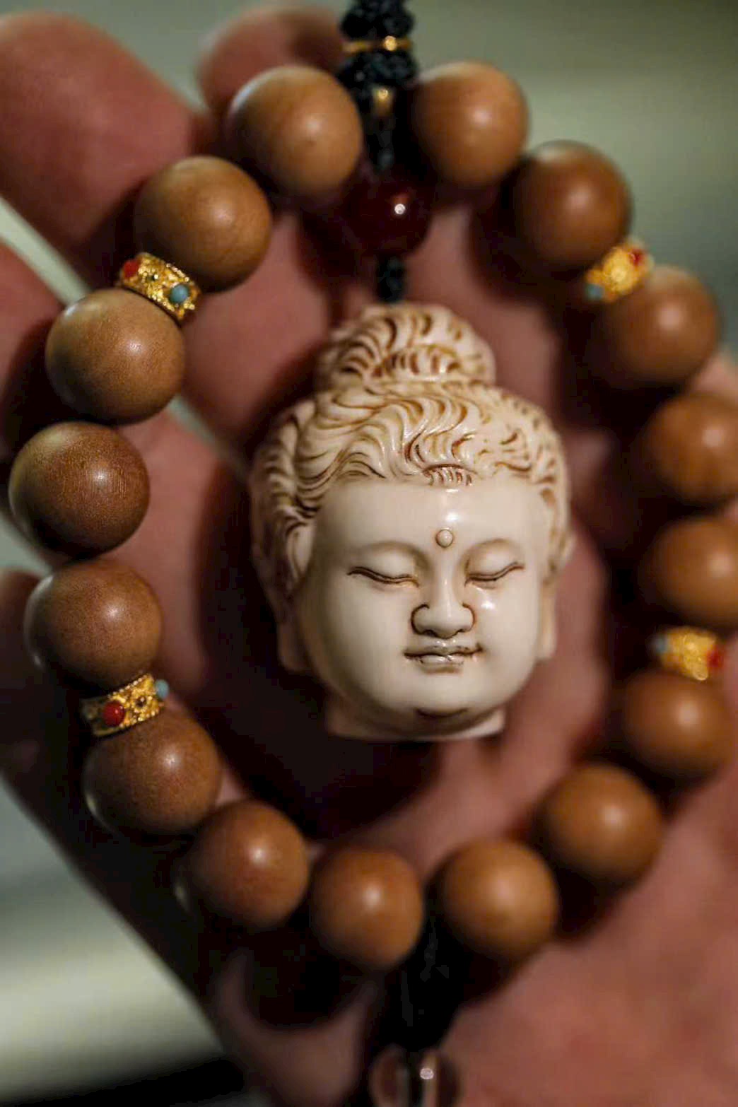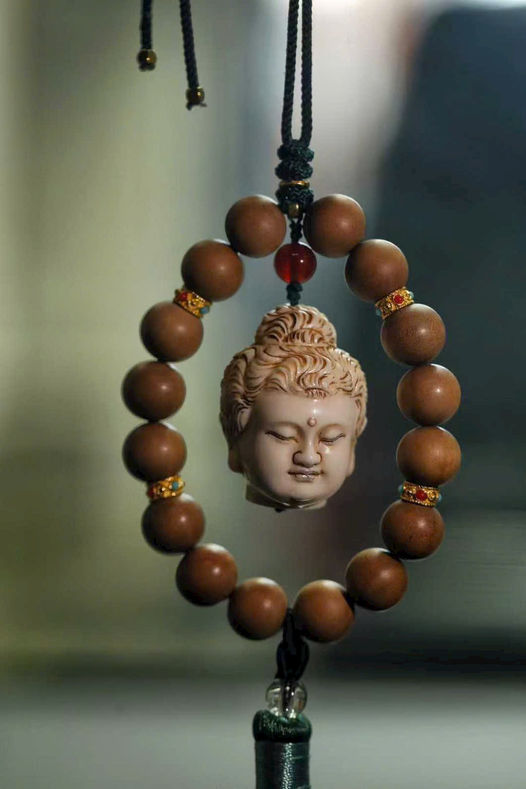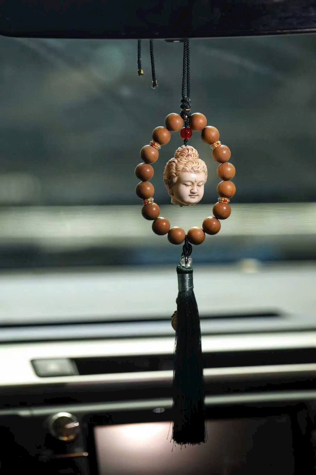 Phật điêu khắc tỉ mỉ, gương mặt từ bi an yên. Chuỗi đàn hương Ấn Độ ấm dịu, phối hạt đỏ & tua rua mềm mại – treo xe hay trưng bày đều mang ý nghĩa cầu an, thuận hành & cát tường.