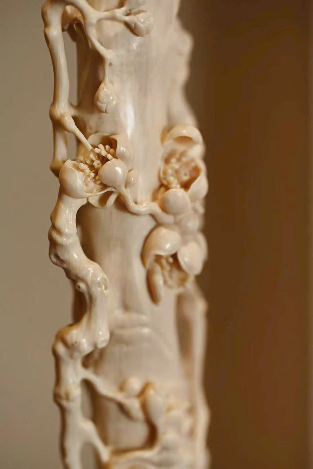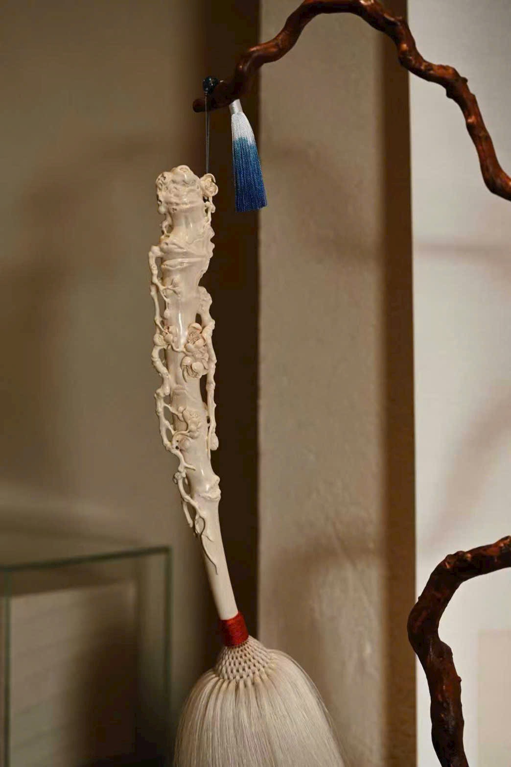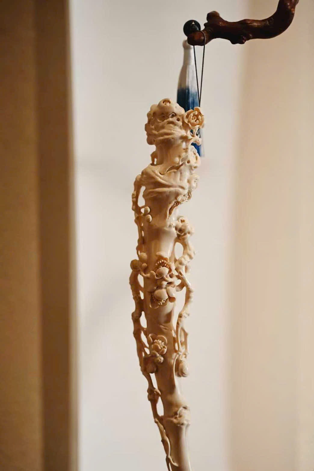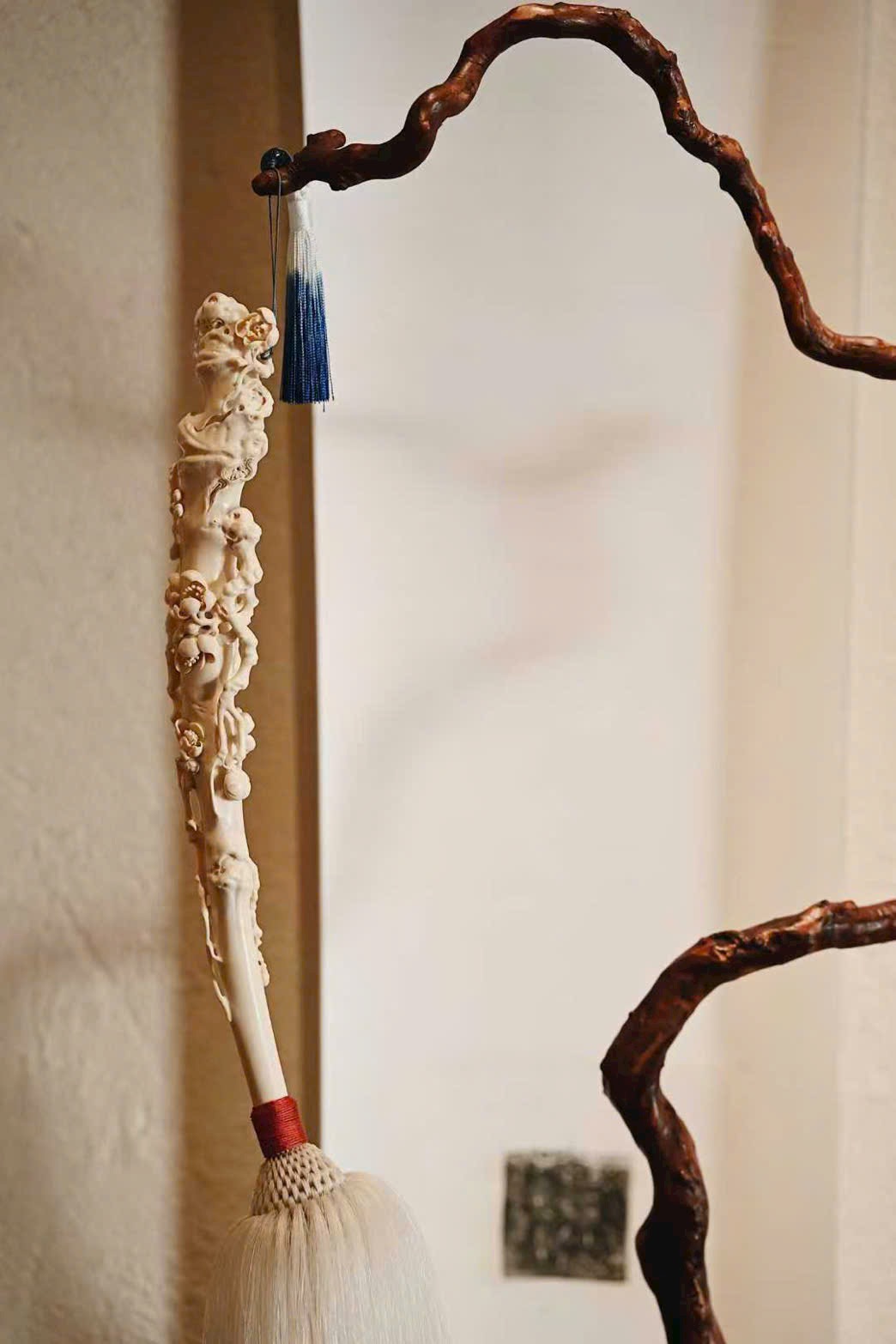 Cán phất trần được chạm khắc từ mamut, họa tiết mai nở từng đóa, sống động và tinh xảo; cành mai uốn lượn mềm mại mà cứng cáp, biểu trưng cho khí tiết thanh cao, cốt cách kiên cường. Phần đầu phất trần kết từ đuôi bờm ngựa, sợi rủ tự nhiên, linh động, tạo nên thần thái nhẹ nhàng mà sinh khí.
