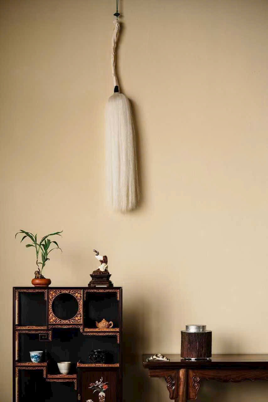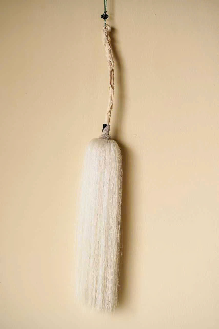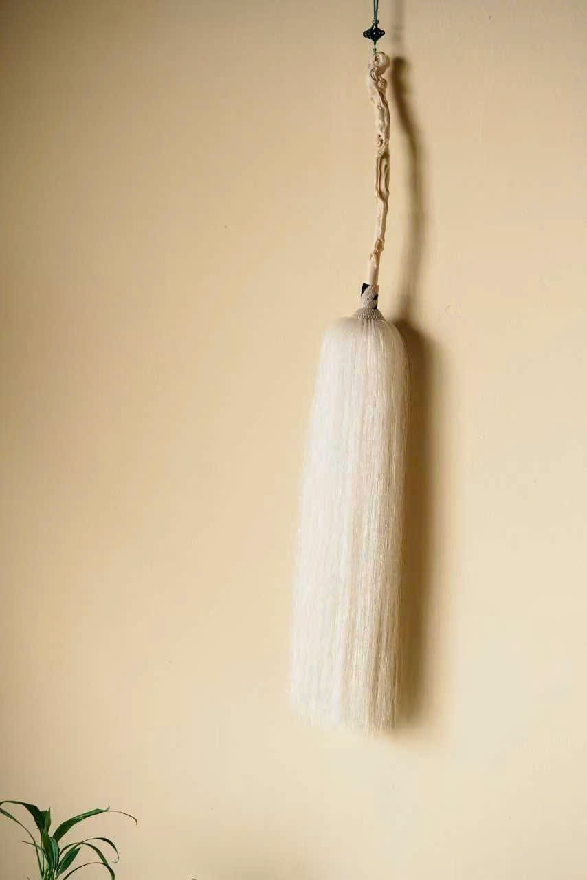 Cán chế tác tinh xảo, chạm khắc linh chi quấn quanh, mây lành ẩn hiện, tạo cảm giác cổ nhã và thanh tịnh. Phần đuôi phất trần rủ mềm như thác bạc, nhẹ nhàng uyển chuyển; đầu cán có thể treo tua trang trí, tăng thêm phần trang trọng.