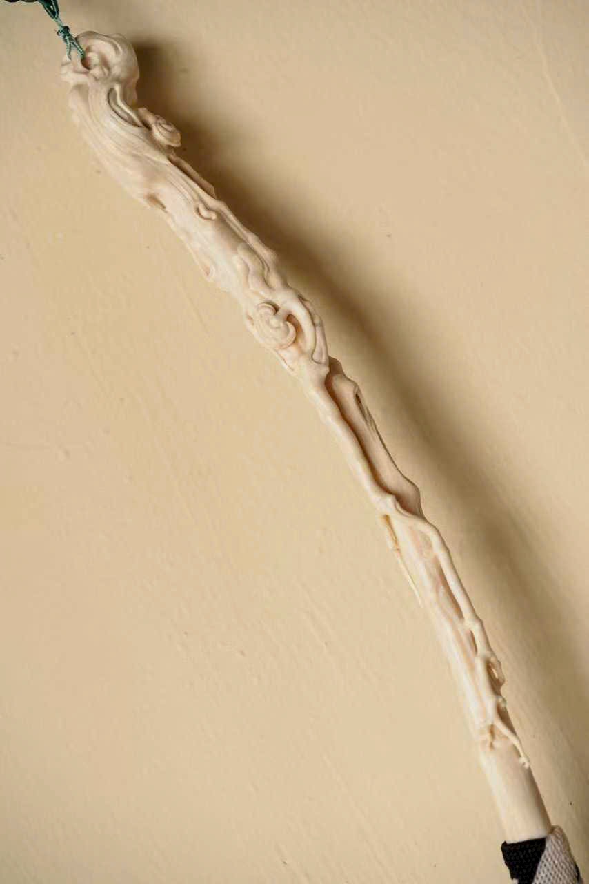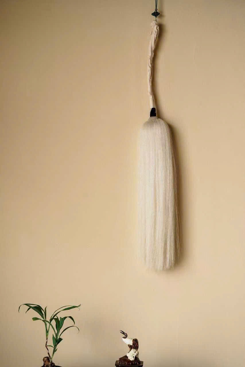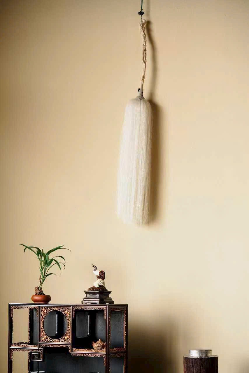 Cán chế tác tinh xảo, chạm khắc linh chi quấn quanh, mây lành ẩn hiện, tạo cảm giác cổ nhã và thanh tịnh. Phần đuôi phất trần rủ mềm như thác bạc, nhẹ nhàng uyển chuyển; đầu cán có thể treo tua trang trí, tăng thêm phần trang trọng.