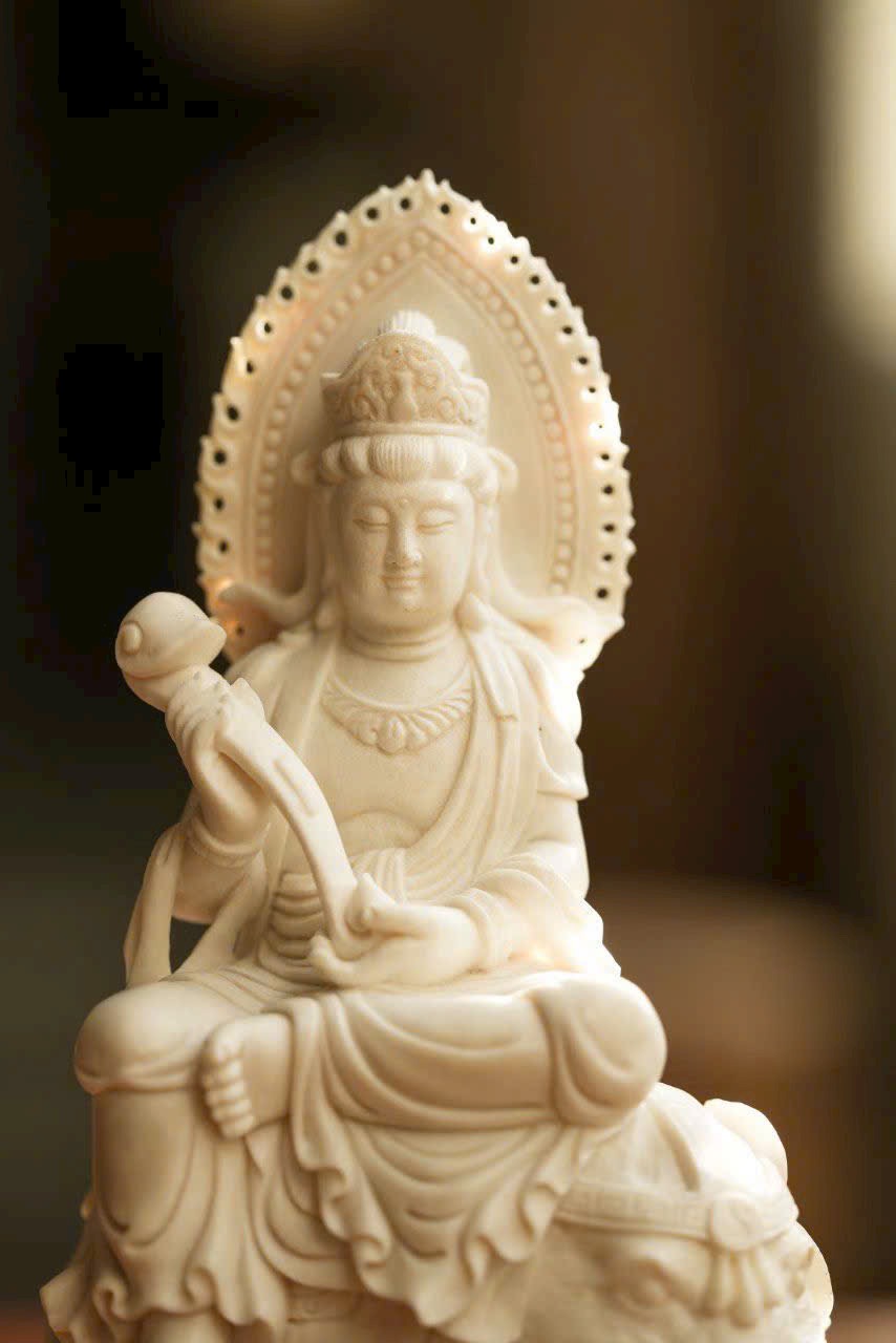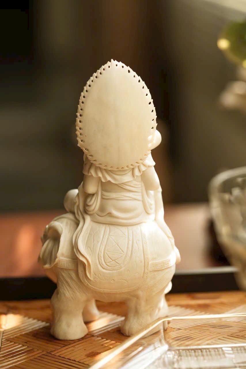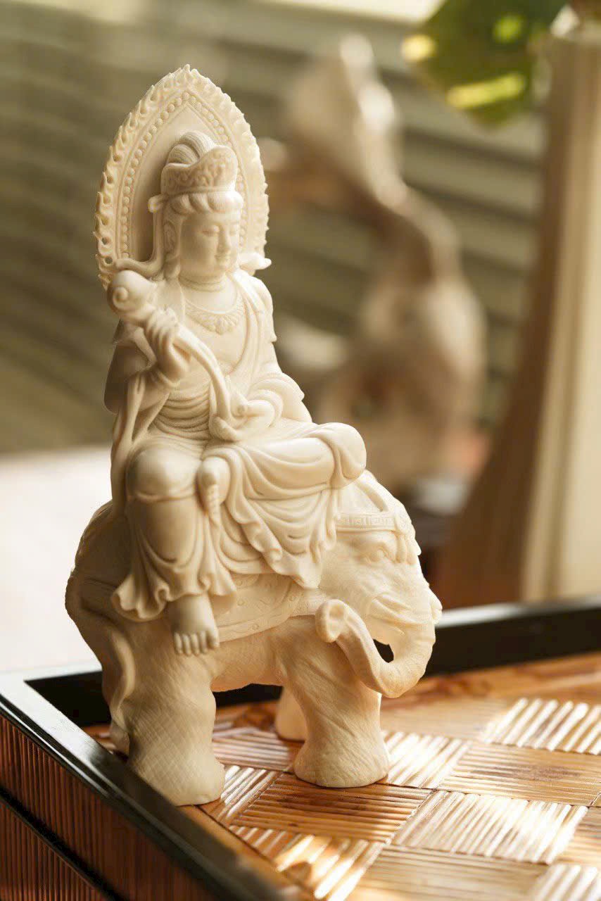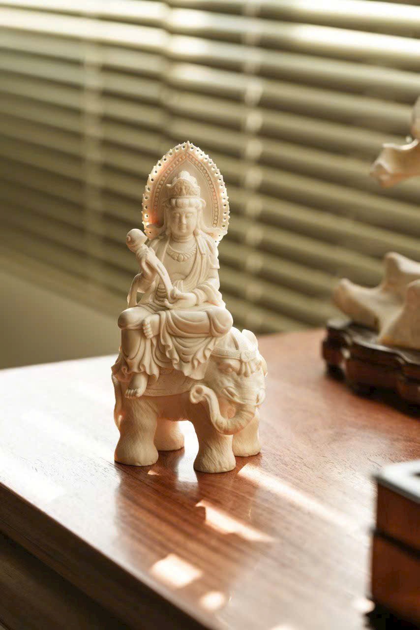 Tác phẩm thủ công tinh xảo, tôn tạo tượng ngồi trang nghiêm. Gương mặt Bồ Tát an tĩnh mỉm cười, ánh nhìn hạ nhẹ, vừa có uy nghi của thiền định, vừa chan chứa từ bi. Y phục chạm khắc nhiều lớp mềm mại, đường dao uyển chuyển. Ngài kiết già trên lưng bạch tượng lục nha hiền hòa, thân hình đầy đặn, dáng thế vững chãi.