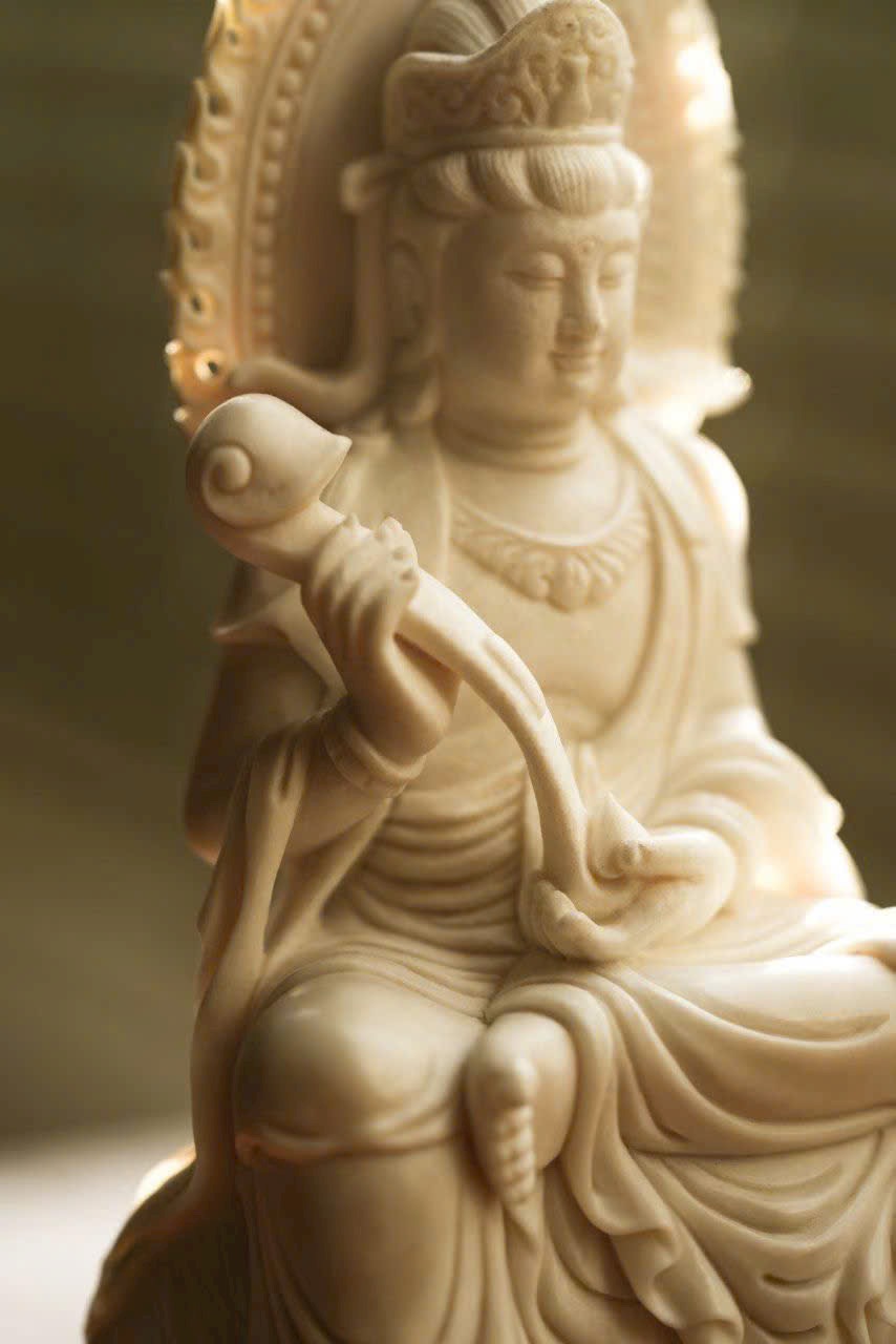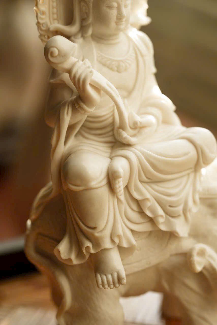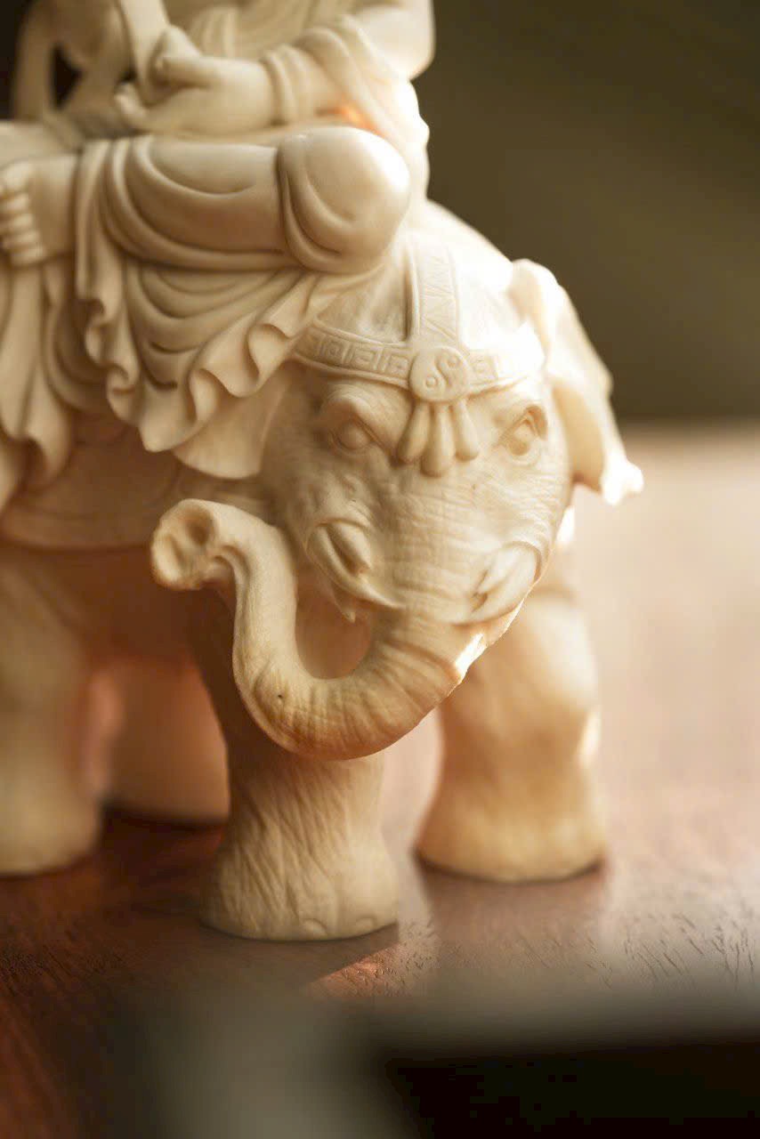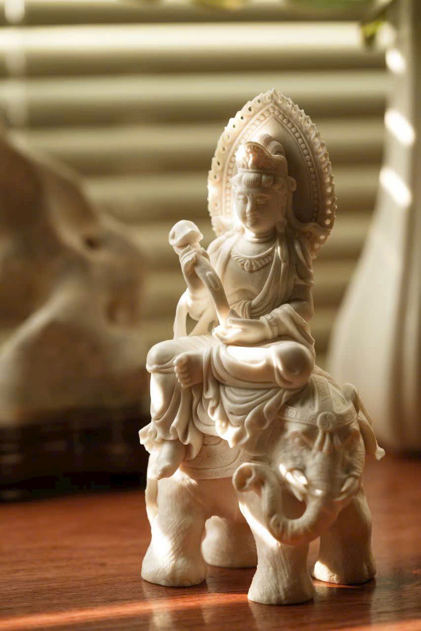 Tác phẩm thủ công tinh xảo, tôn tạo tượng ngồi trang nghiêm. Gương mặt Bồ Tát an tĩnh mỉm cười, ánh nhìn hạ nhẹ, vừa có uy nghi của thiền định, vừa chan chứa từ bi. Y phục chạm khắc nhiều lớp mềm mại, đường dao uyển chuyển. Ngài kiết già trên lưng bạch tượng lục nha hiền hòa, thân hình đầy đặn, dáng thế vững chãi.