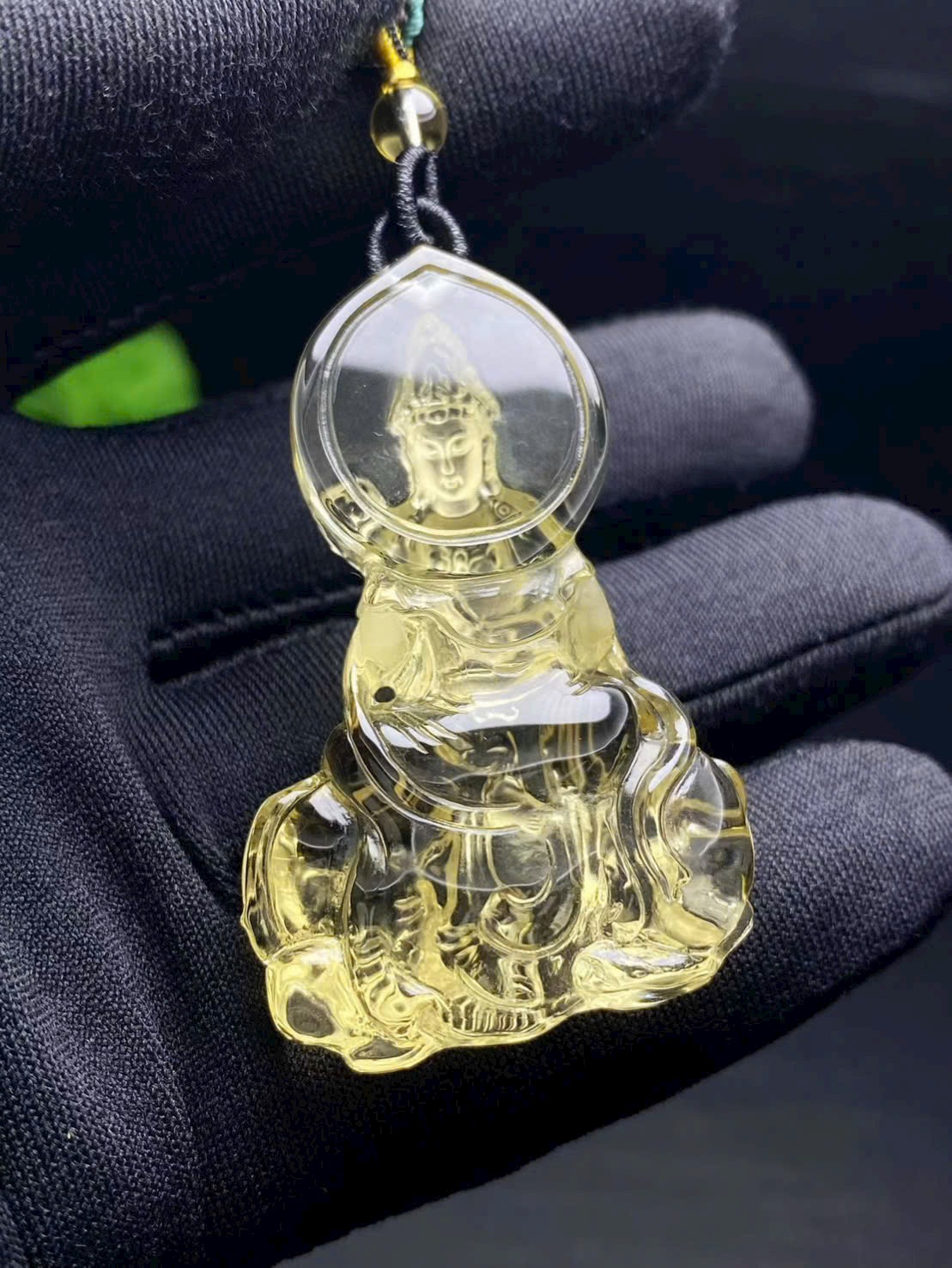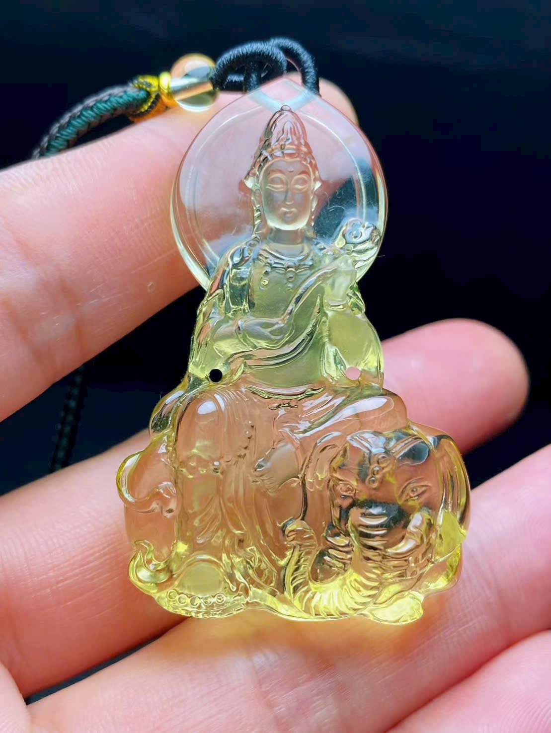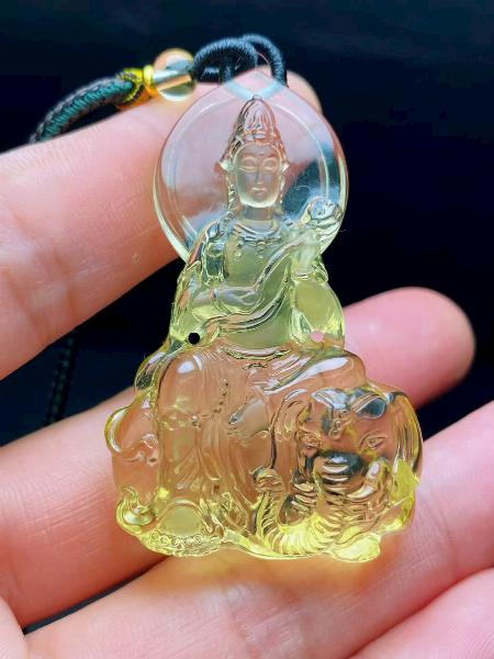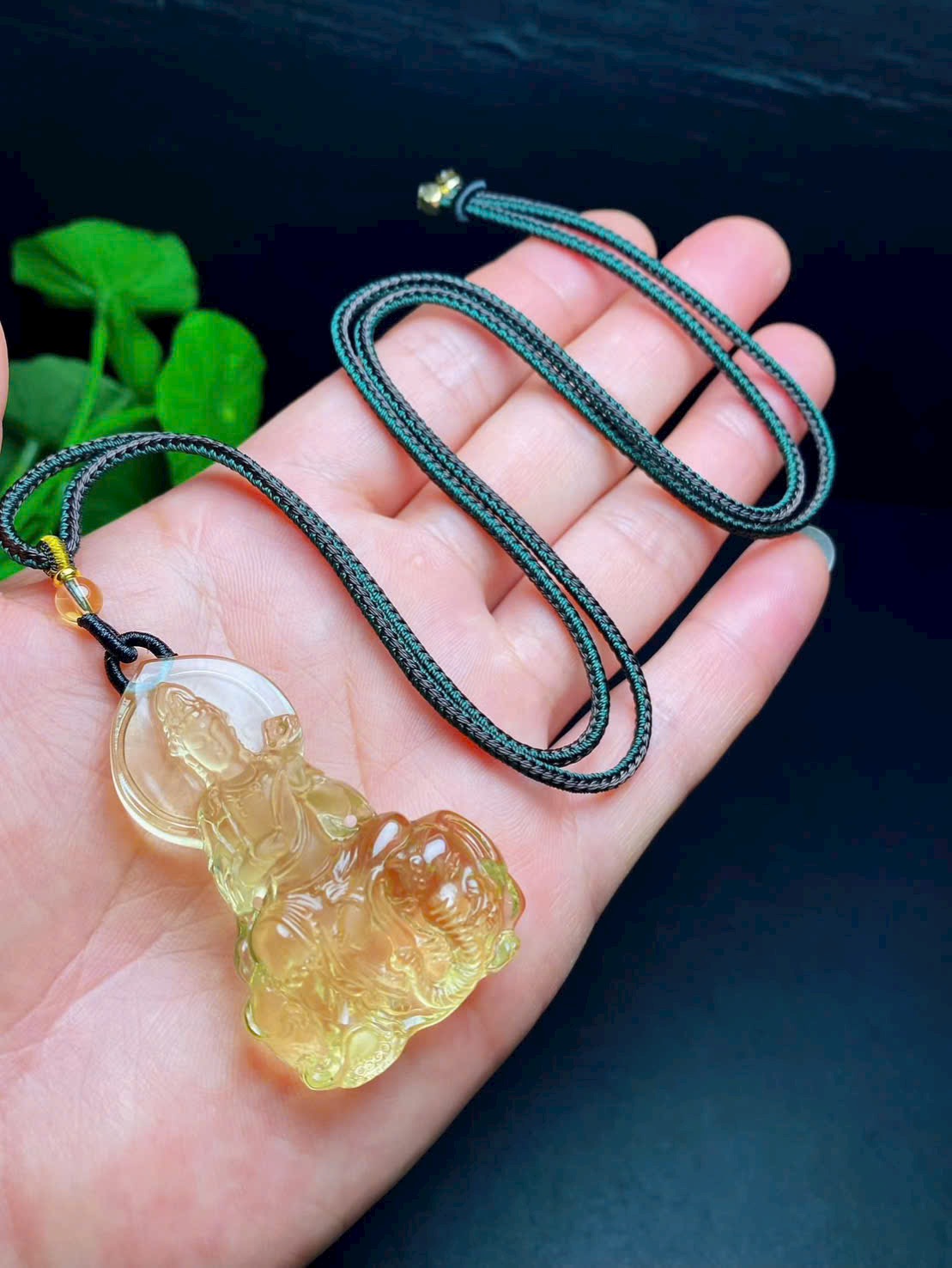 Mặt dây chuyền Phổ Hiền Bồ Tát khắc đôi mặt bằng thạch anh vàng tự nhiên Brazil — vị hộ thần của rồng và rắn, một trong Bát Đại Hộ Thần. Tượng trưng cho năng lực hóa hung thành cát, gặp nạn được lành, ban con ban phúc. Người đeo được phù hộ bình an thuận lợi, tai qua nạn khỏi, được che chở suốt đời, mang ý nghĩa vạn sự như ý, an khang cát tường, trường thọ, con cháu sum vầy, giúp tâm an và phúc đến.