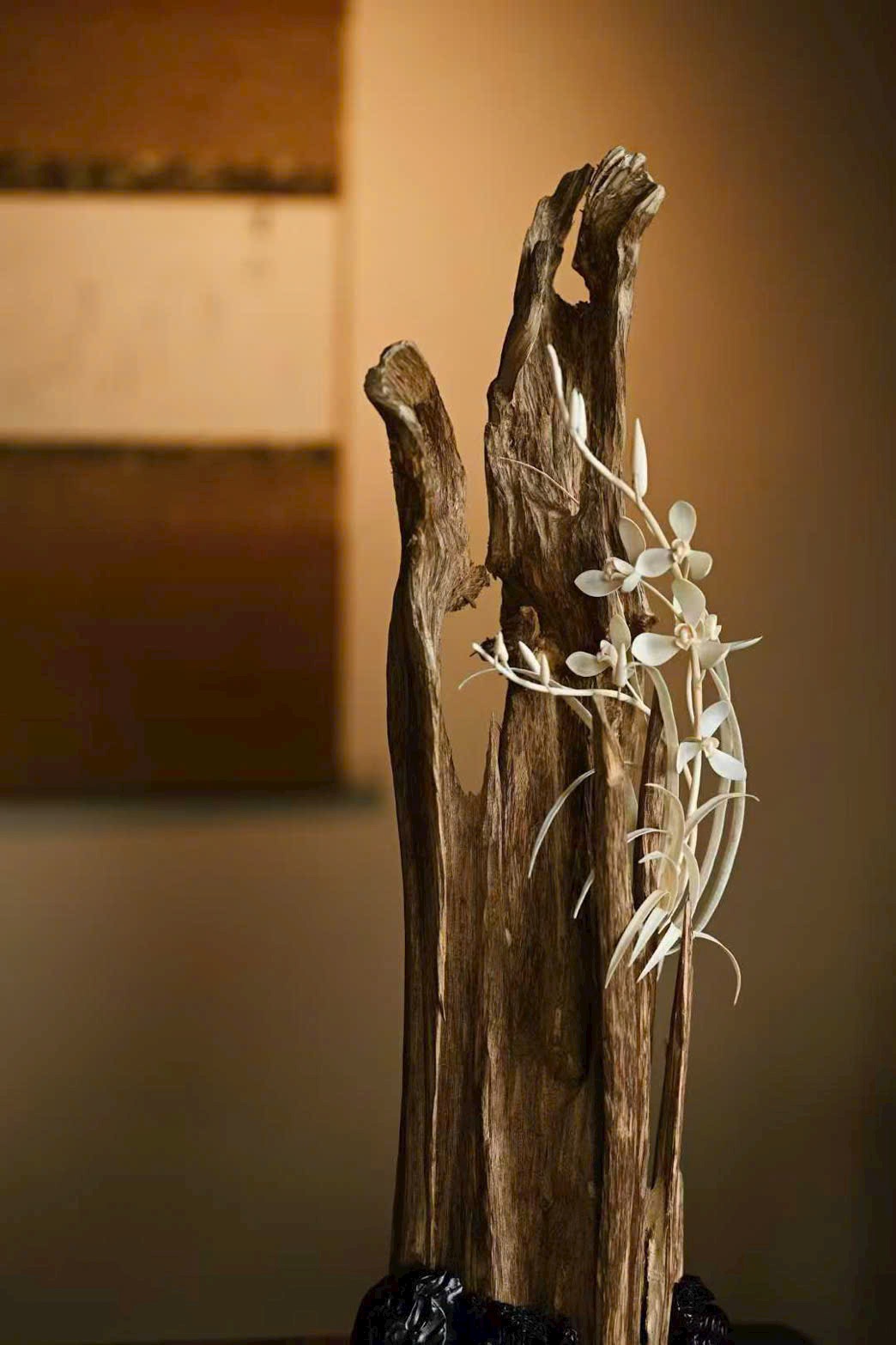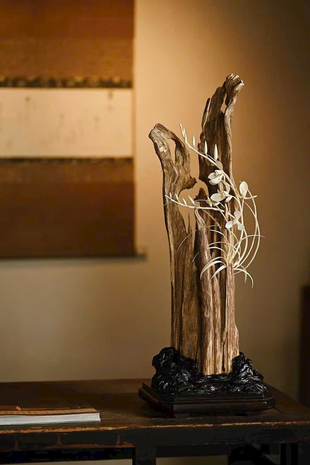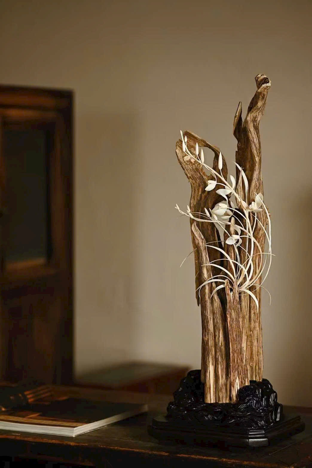 Lấy dáng tự nhiên của trầm hương, tựa núi đá lởm chởm, trầm ổn mà vẫn toát lên nét linh động. Cẩn ghép hoa lan, cành lá tinh xảo, bố cục thoáng đạt, hòa quyện cùng dáng đá, tao nhã phi phàm.