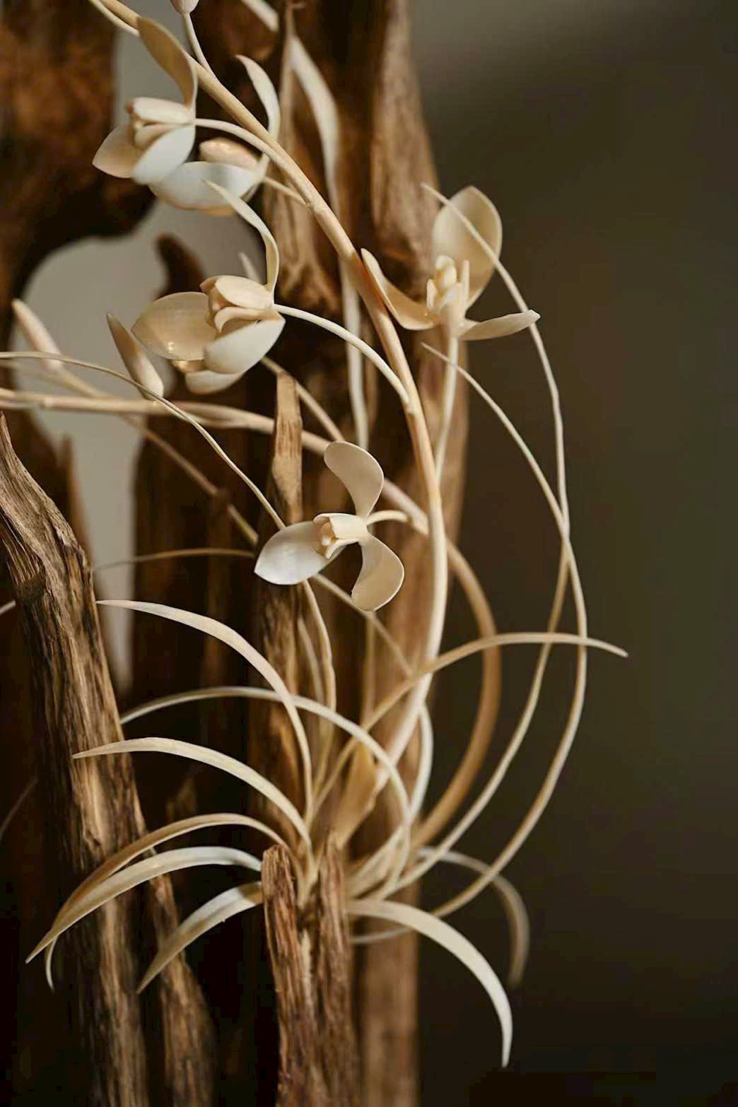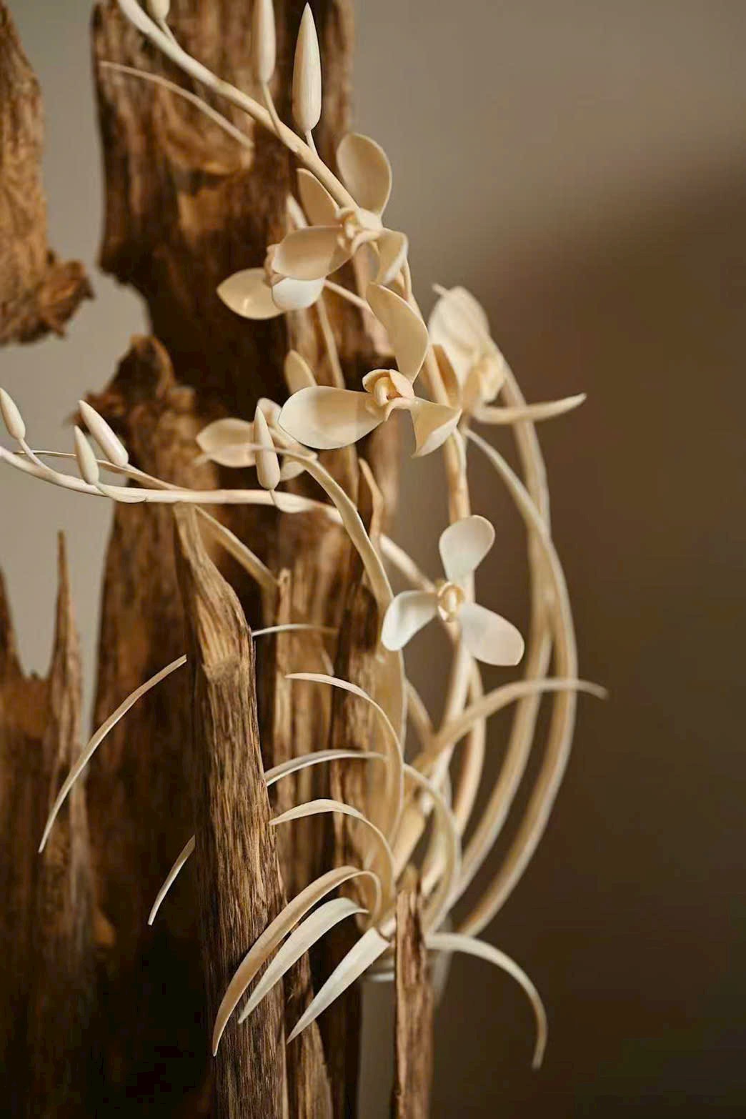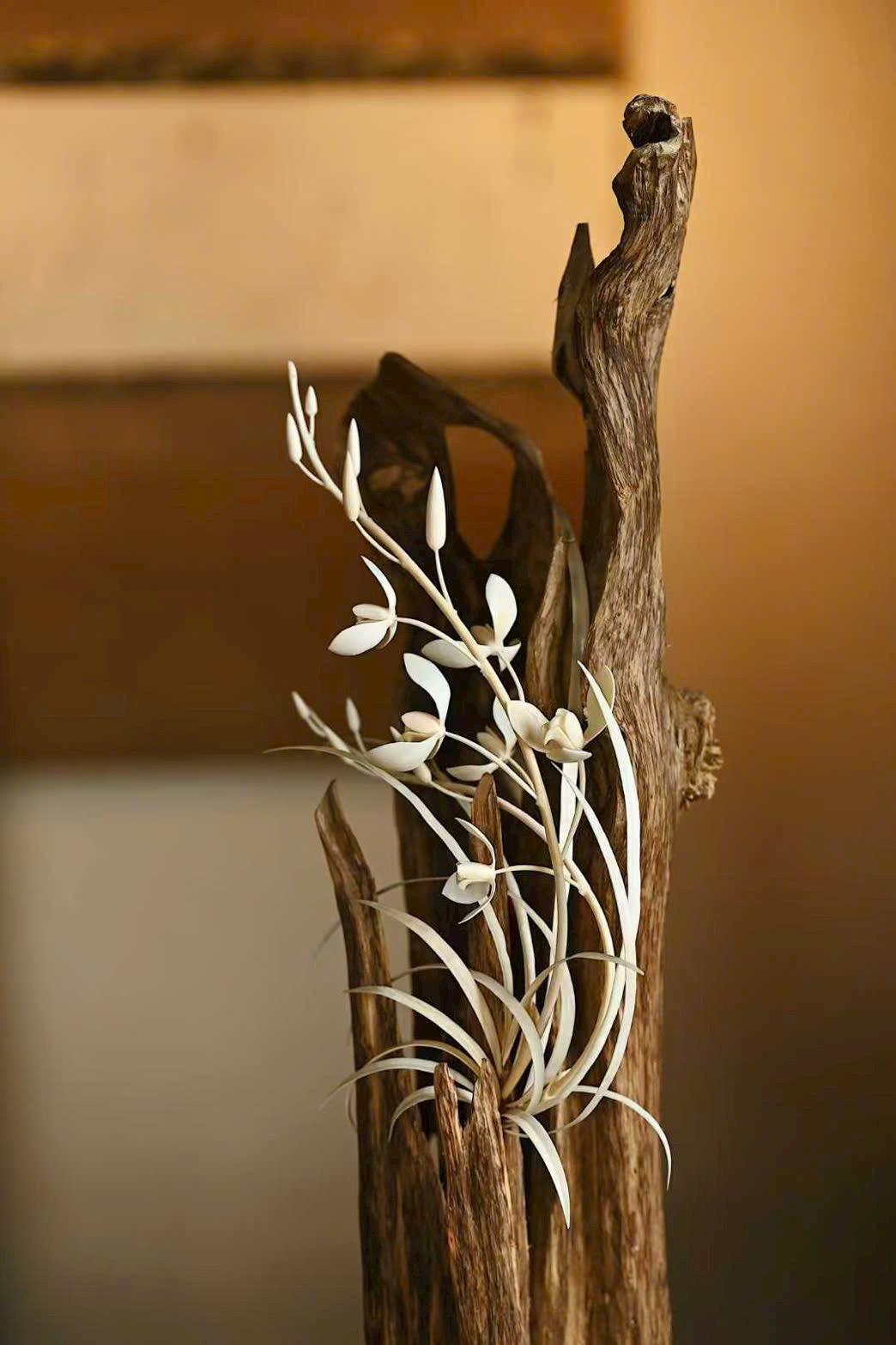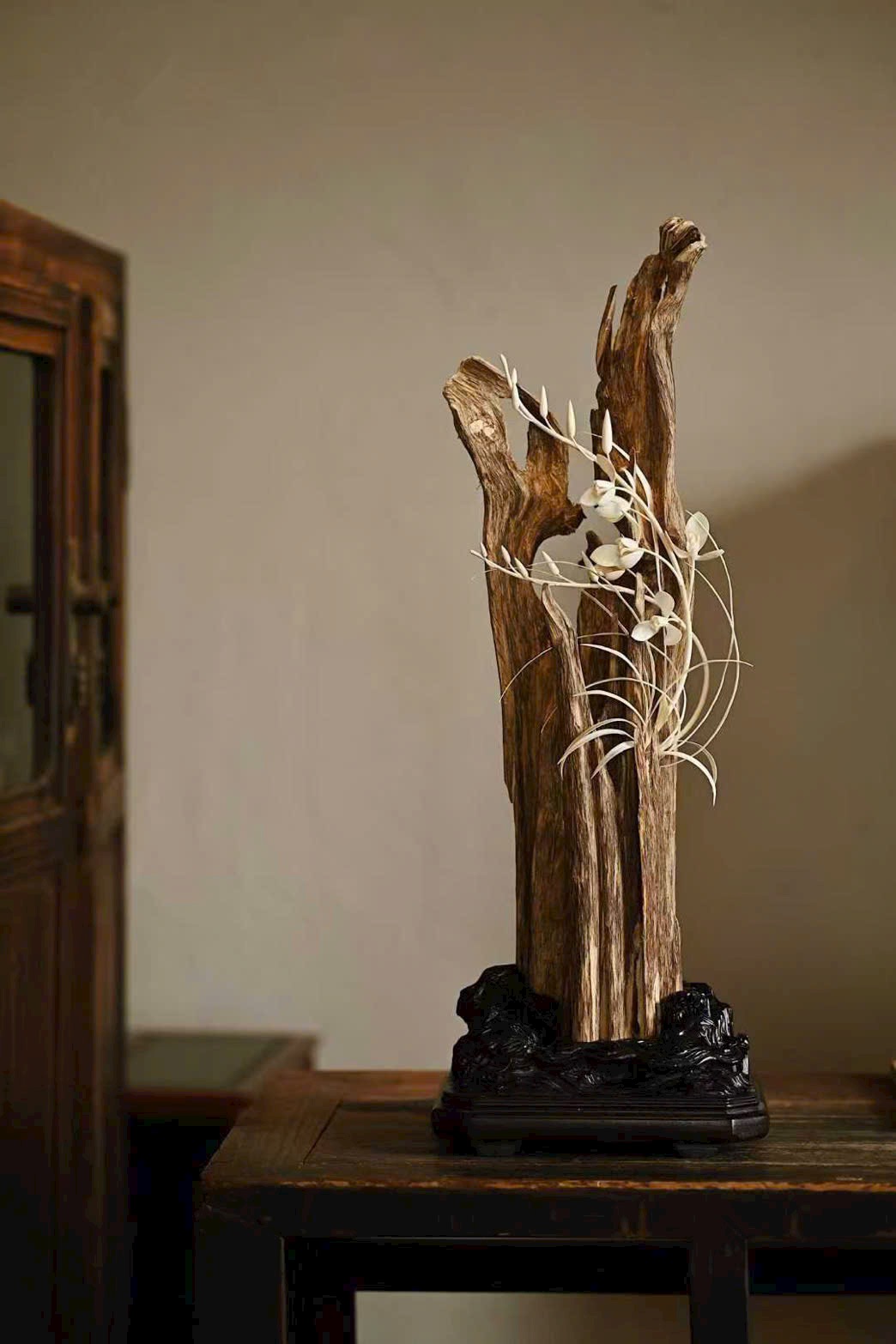 Lấy dáng tự nhiên của trầm hương, tựa núi đá lởm chởm, trầm ổn mà vẫn toát lên nét linh động. Cẩn ghép hoa lan, cành lá tinh xảo, bố cục thoáng đạt, hòa quyện cùng dáng đá, tao nhã phi phàm.