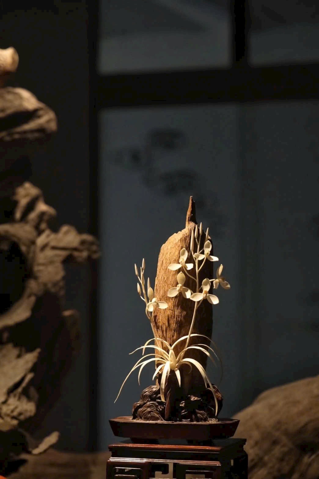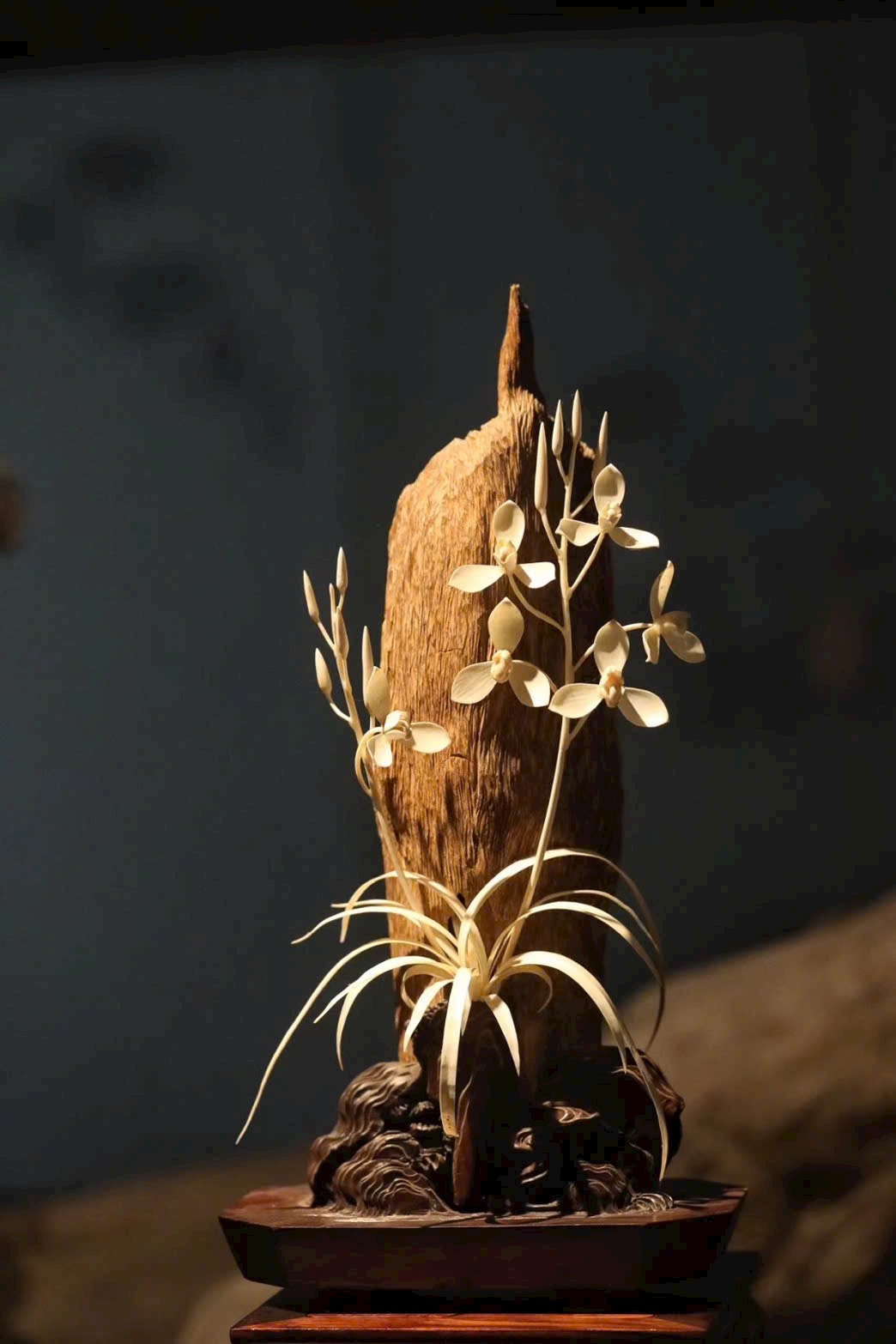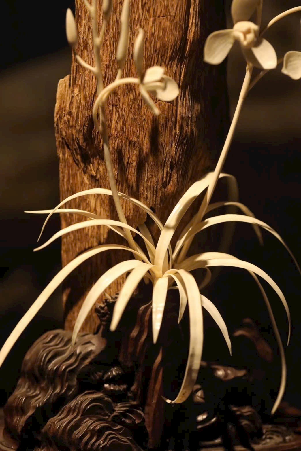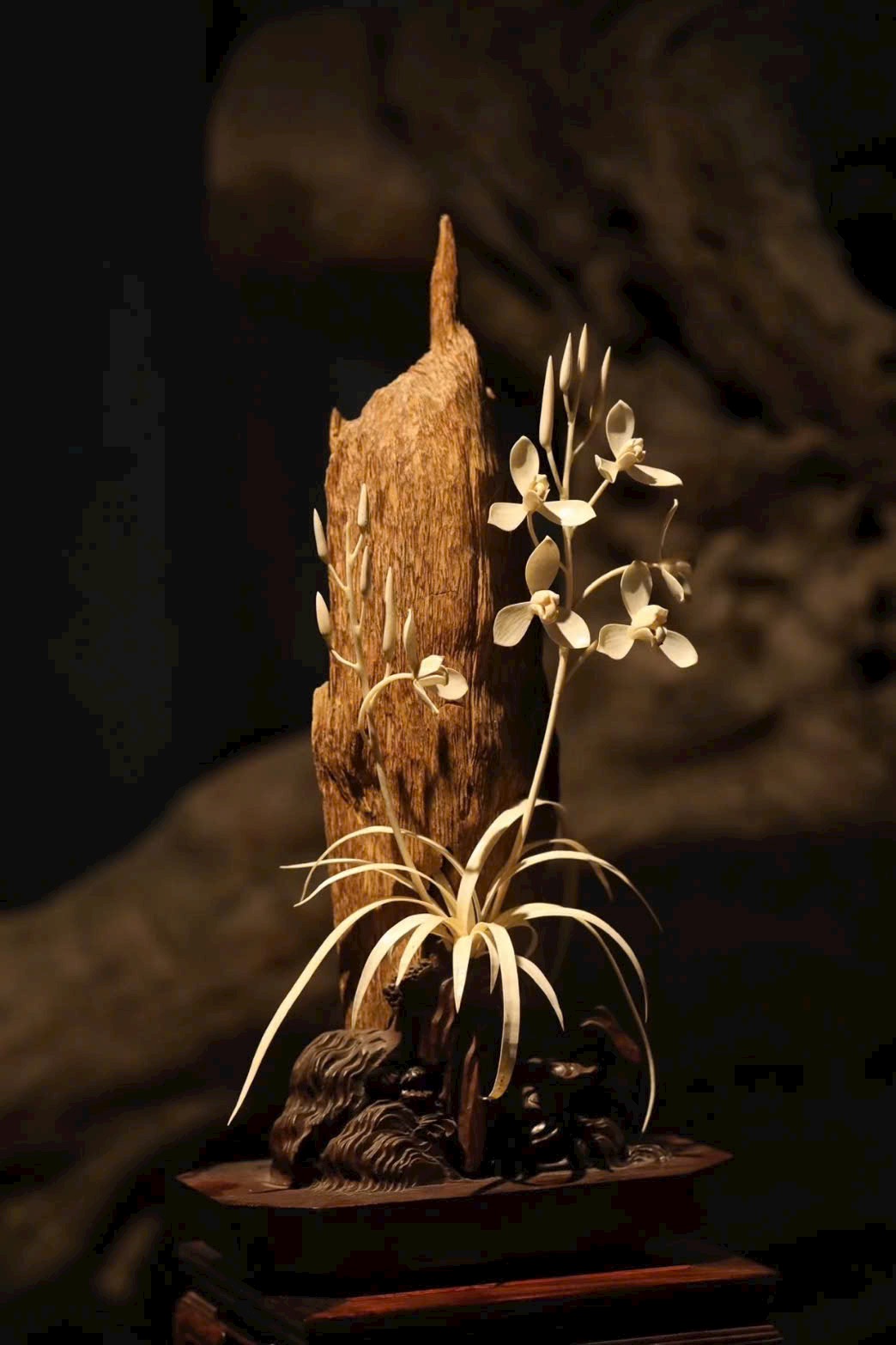 Tác phẩm tận dụng hình thế tự nhiên của trầm hương, dáng vẻ kỳ thú linh động, như đá sinh mây nổi, biến hóa hàm chứa linh khí của non nước. Theo thế gỗ mà khéo léo chạm khắc lan hoa từ ngà ma mút — cánh lá như bay trong gió, chùm hoa thanh thoát vươn cao, mang đến cảm giác thị giác thanh nhã, thoát tục.