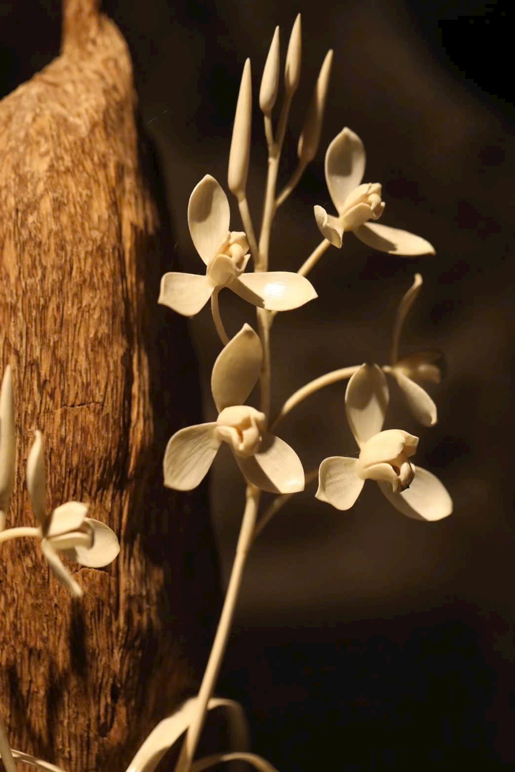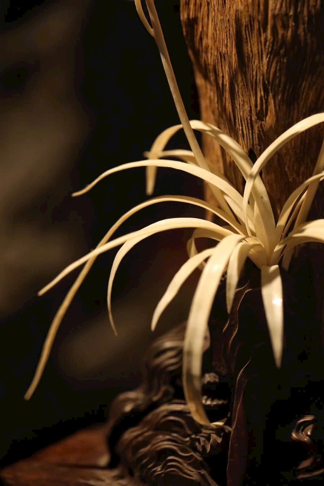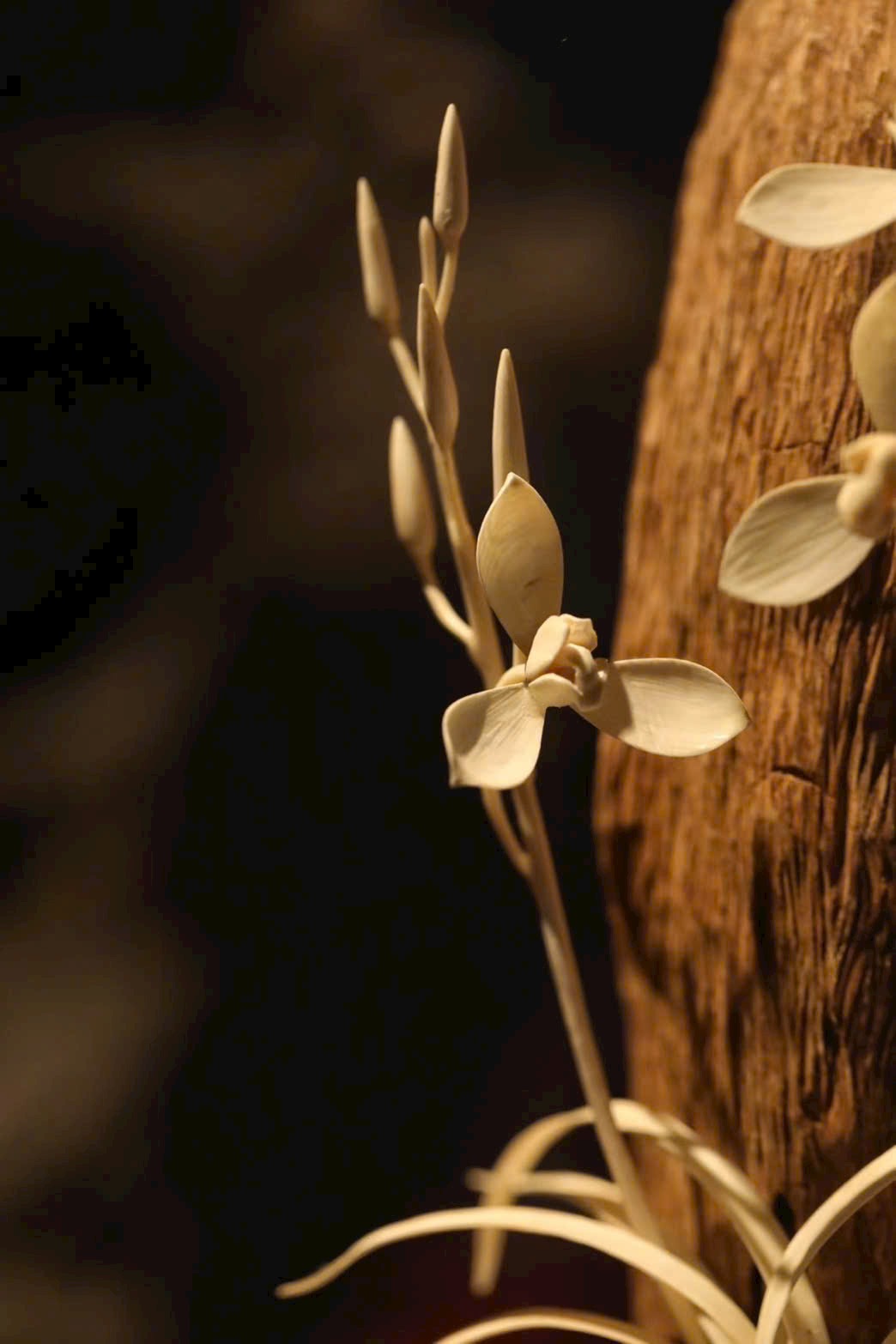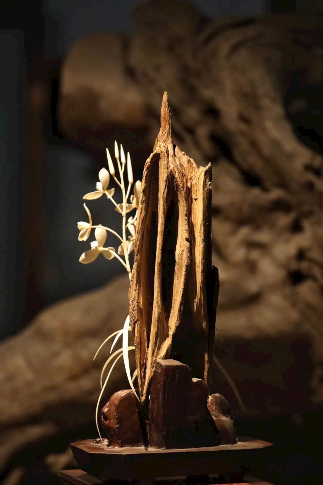 Tác phẩm tận dụng hình thế tự nhiên của trầm hương, dáng vẻ kỳ thú linh động, như đá sinh mây nổi, biến hóa hàm chứa linh khí của non nước. Theo thế gỗ mà khéo léo chạm khắc lan hoa từ ngà ma mút — cánh lá như bay trong gió, chùm hoa thanh thoát vươn cao, mang đến cảm giác thị giác thanh nhã, thoát tục.
