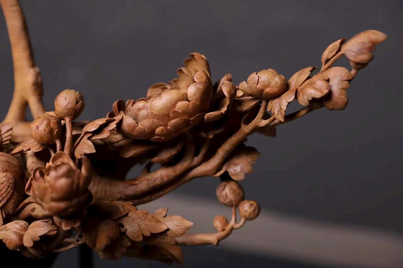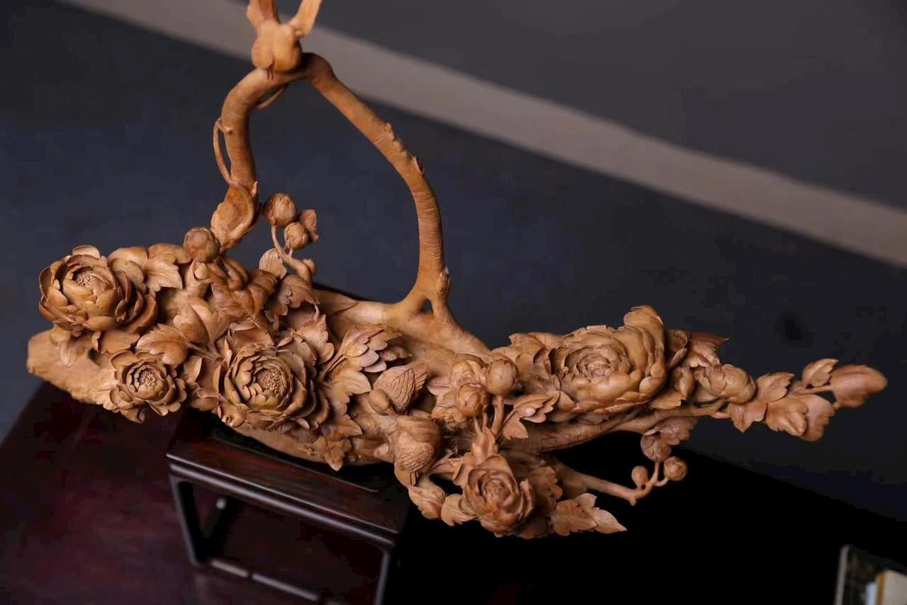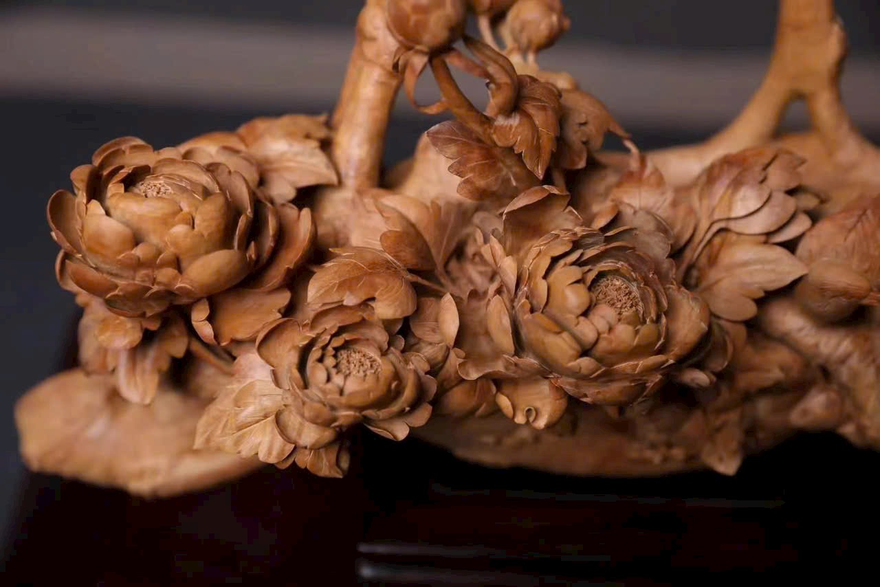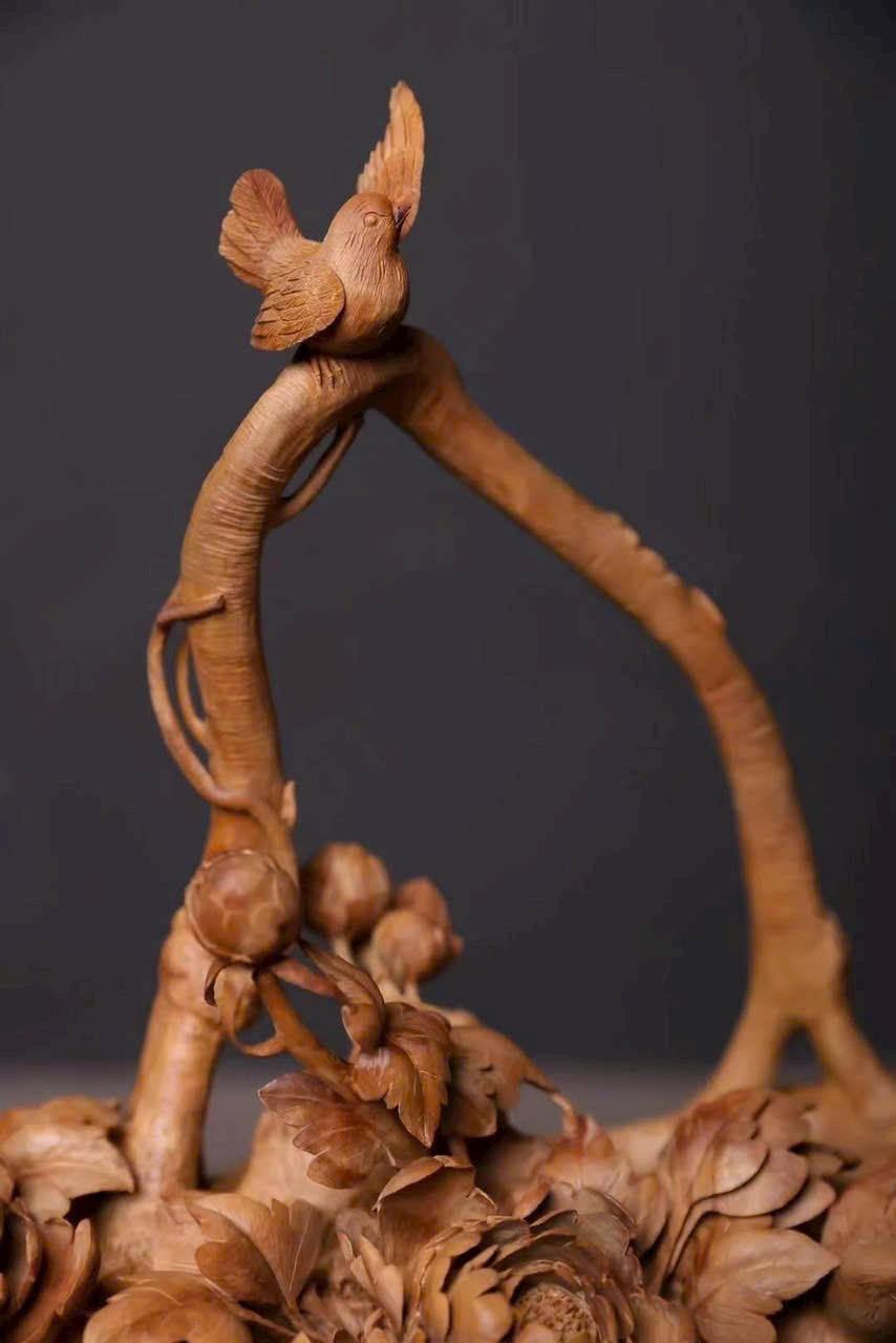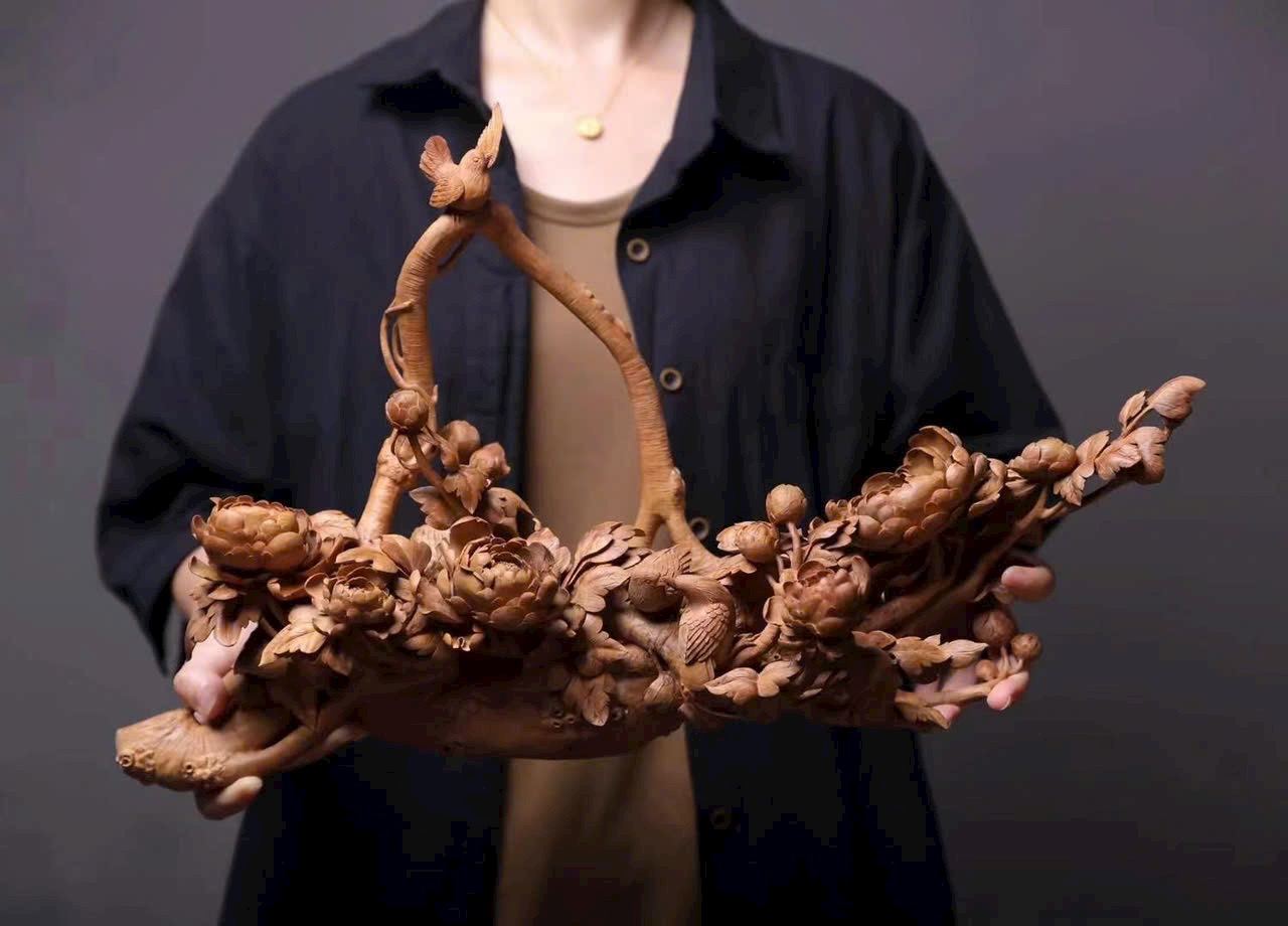 Tác phẩm điêu khắc tinh xảo hình giỏ hoa nở rộ, cành uốn lượn, hoa rủ như thác đổ, chim chóc bay lượn – tái hiện vẻ đẹp sinh động của mùa xuân và cuộc sống viên mãn.