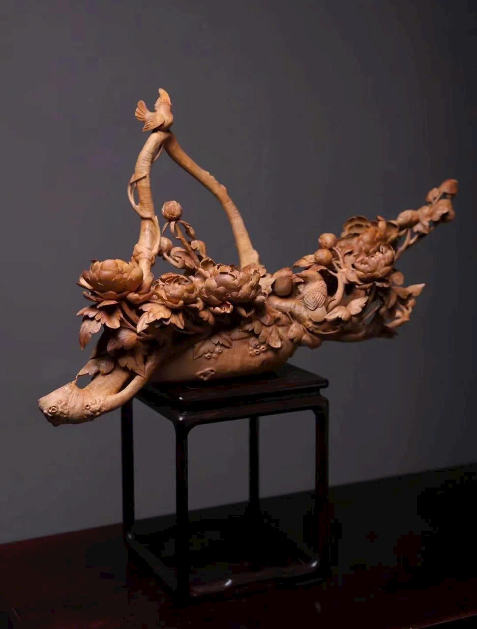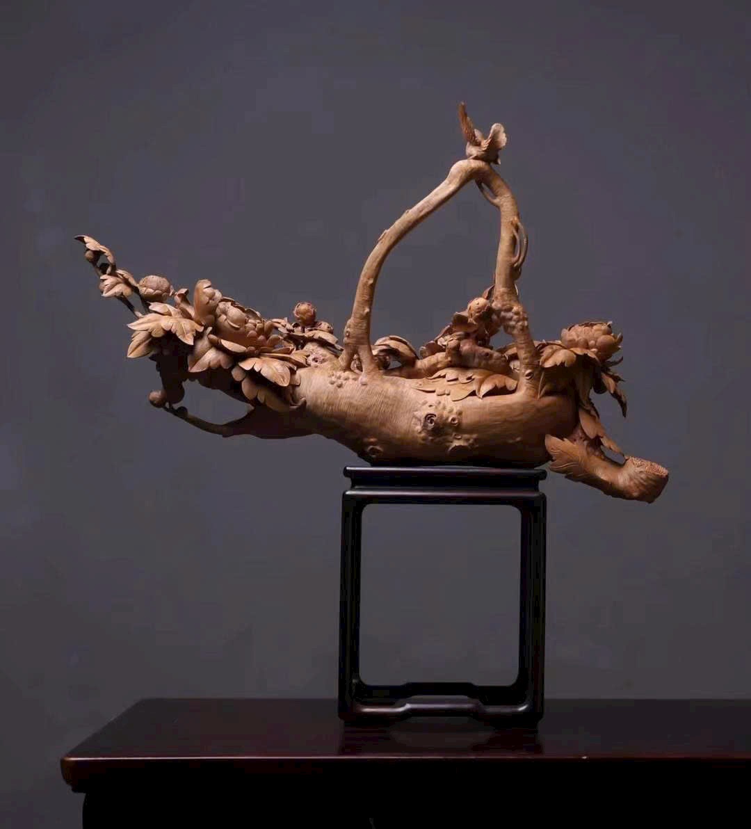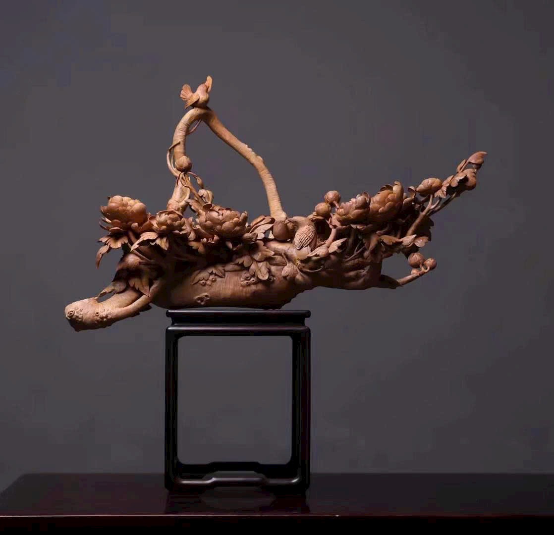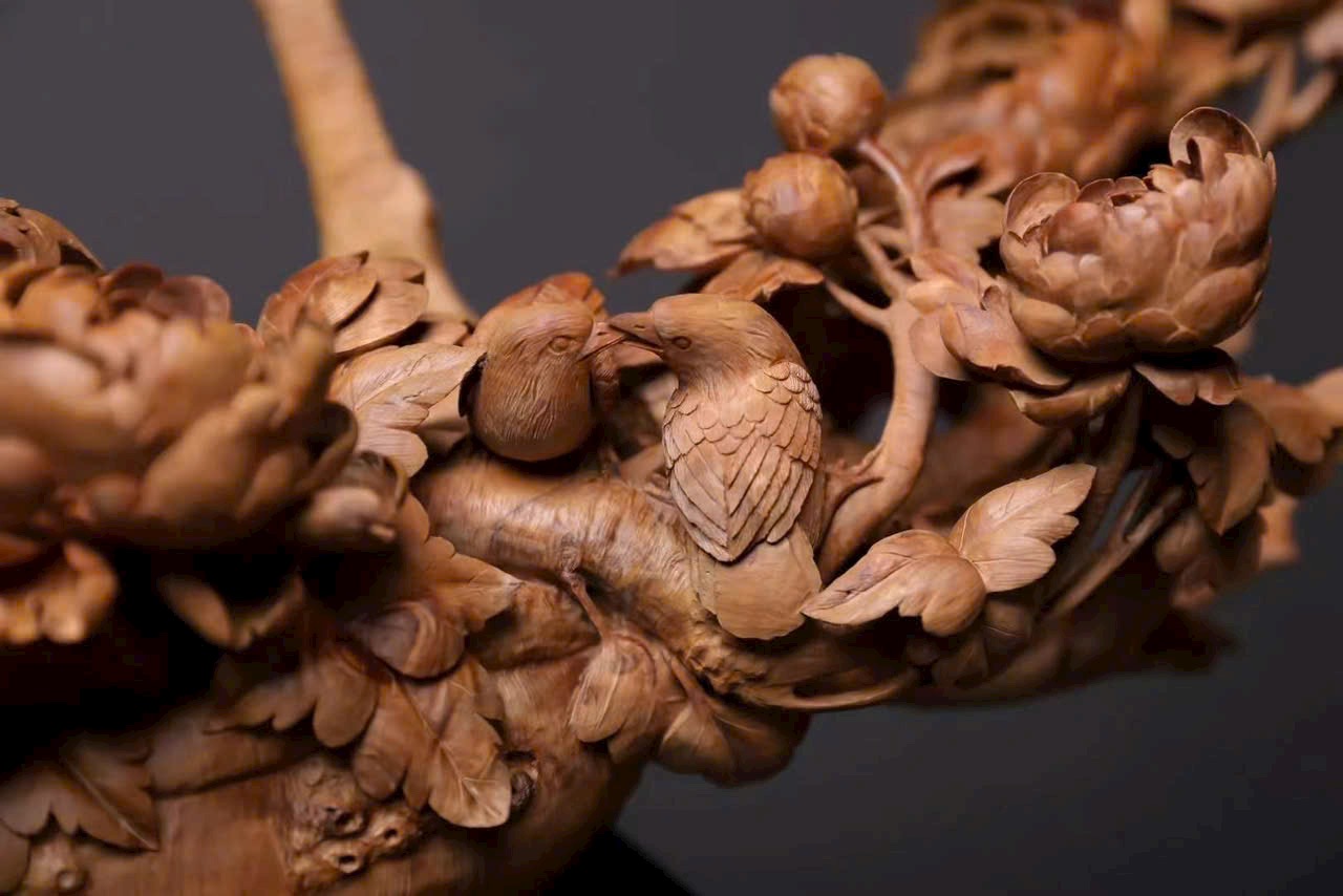 Tác phẩm điêu khắc tinh xảo hình giỏ hoa nở rộ, cành uốn lượn, hoa rủ như thác đổ, chim chóc bay lượn – tái hiện vẻ đẹp sinh động của mùa xuân và cuộc sống viên mãn.