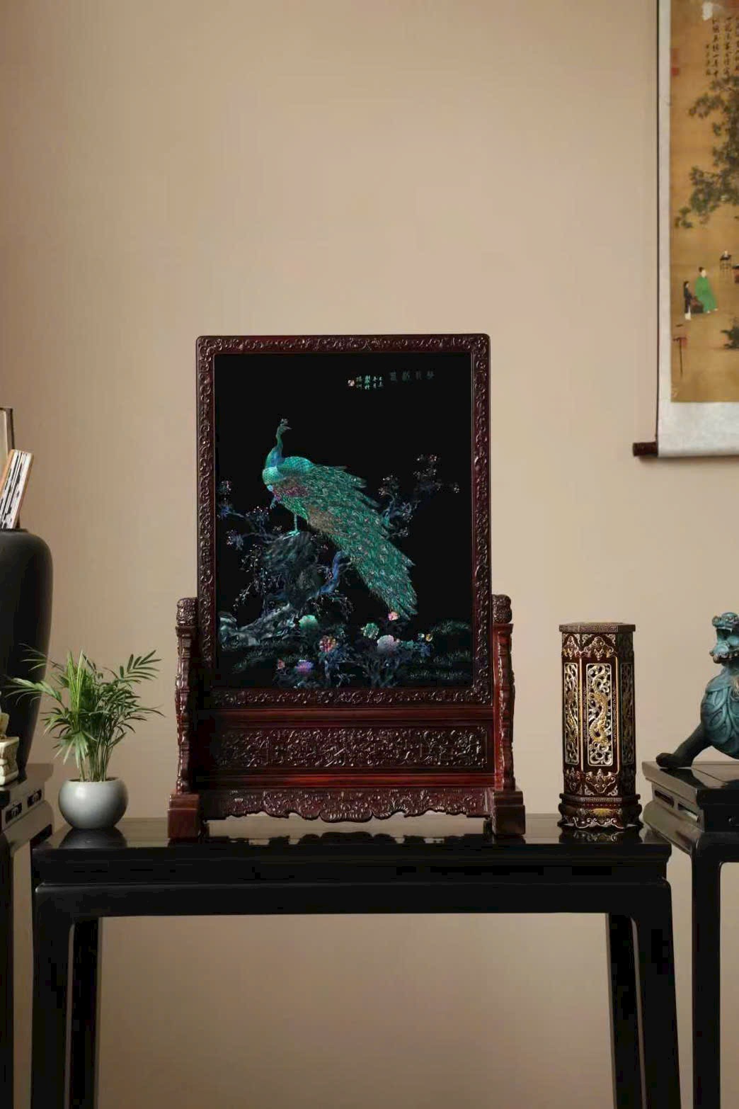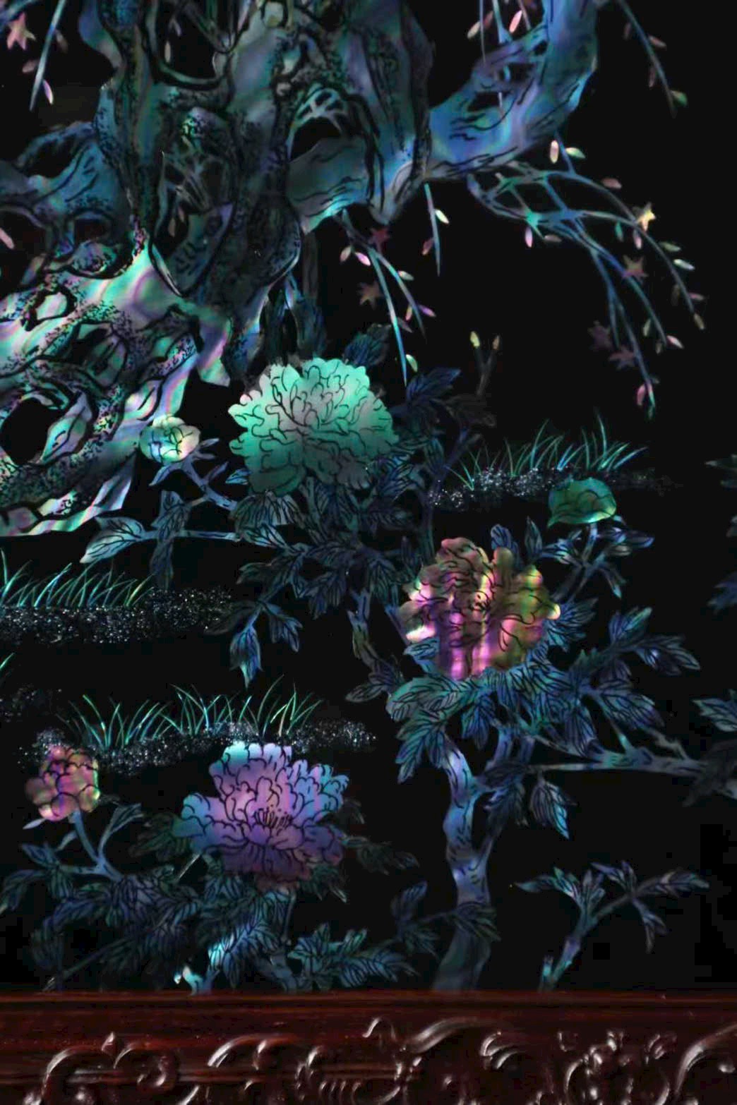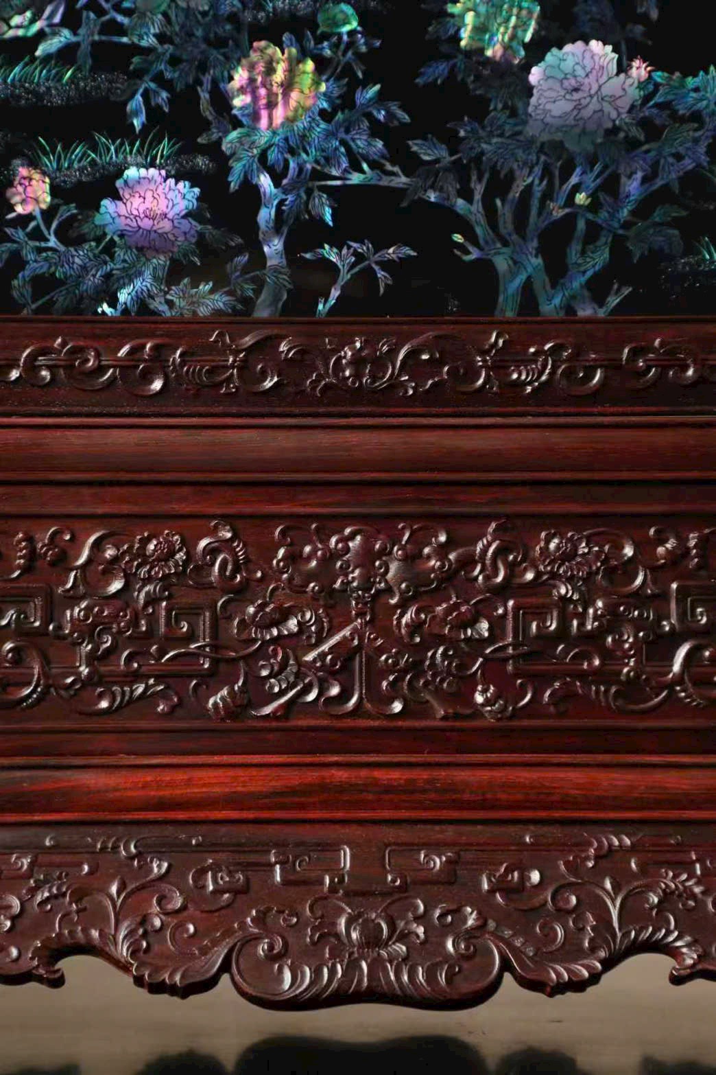 Bình phong tuyển gỗ tử đàn tiểu diệp Ấn Độ lão liệu, chế tác theo kết cấu mộng thủ công. Trên màn khảm ốc xà cừ biển sâu phát sáng, tạo họa đồ công – mẫu đơn rực rỡ, kết hợp nghệ thuật vẽ vàng mô tả cảnh hồ quang sơn sắc, toàn khí mang phong vị cổ nhã, thanh tú. Phù hợp bày nơi trung đường, vừa ngắm vừa thư giãn như thưởng thức bảo vật Cố Cung.