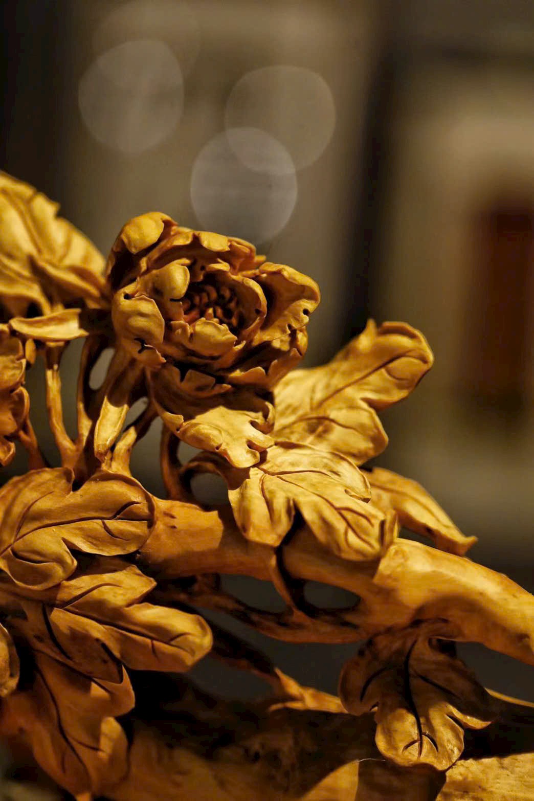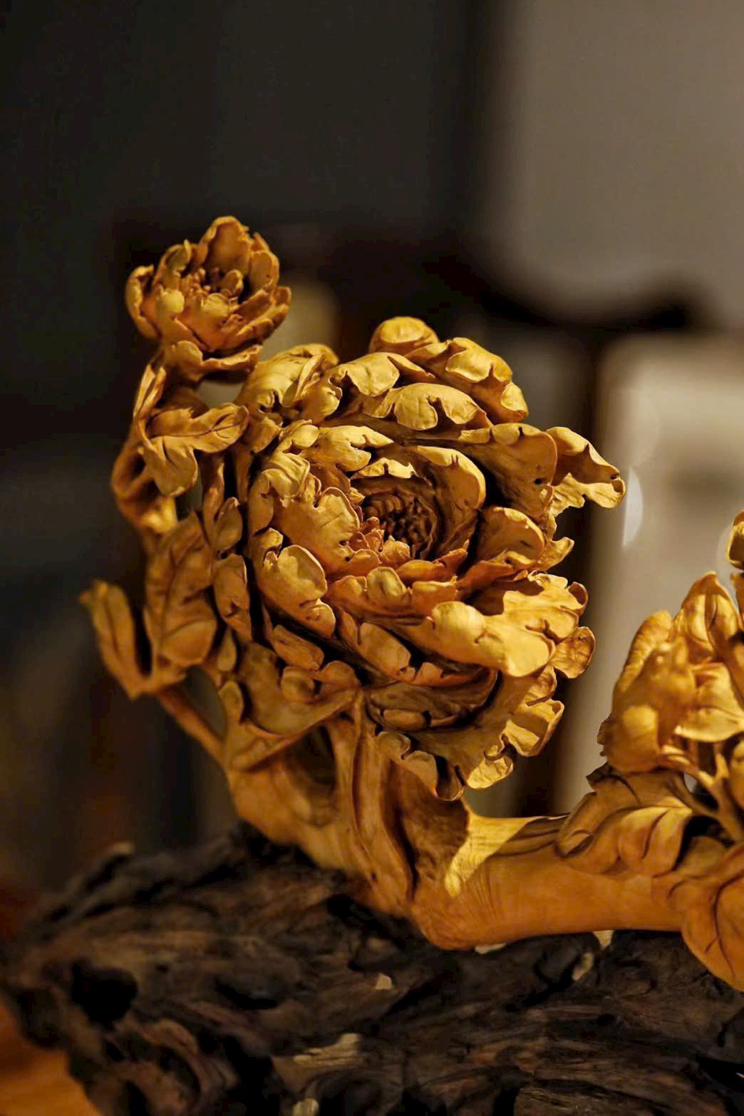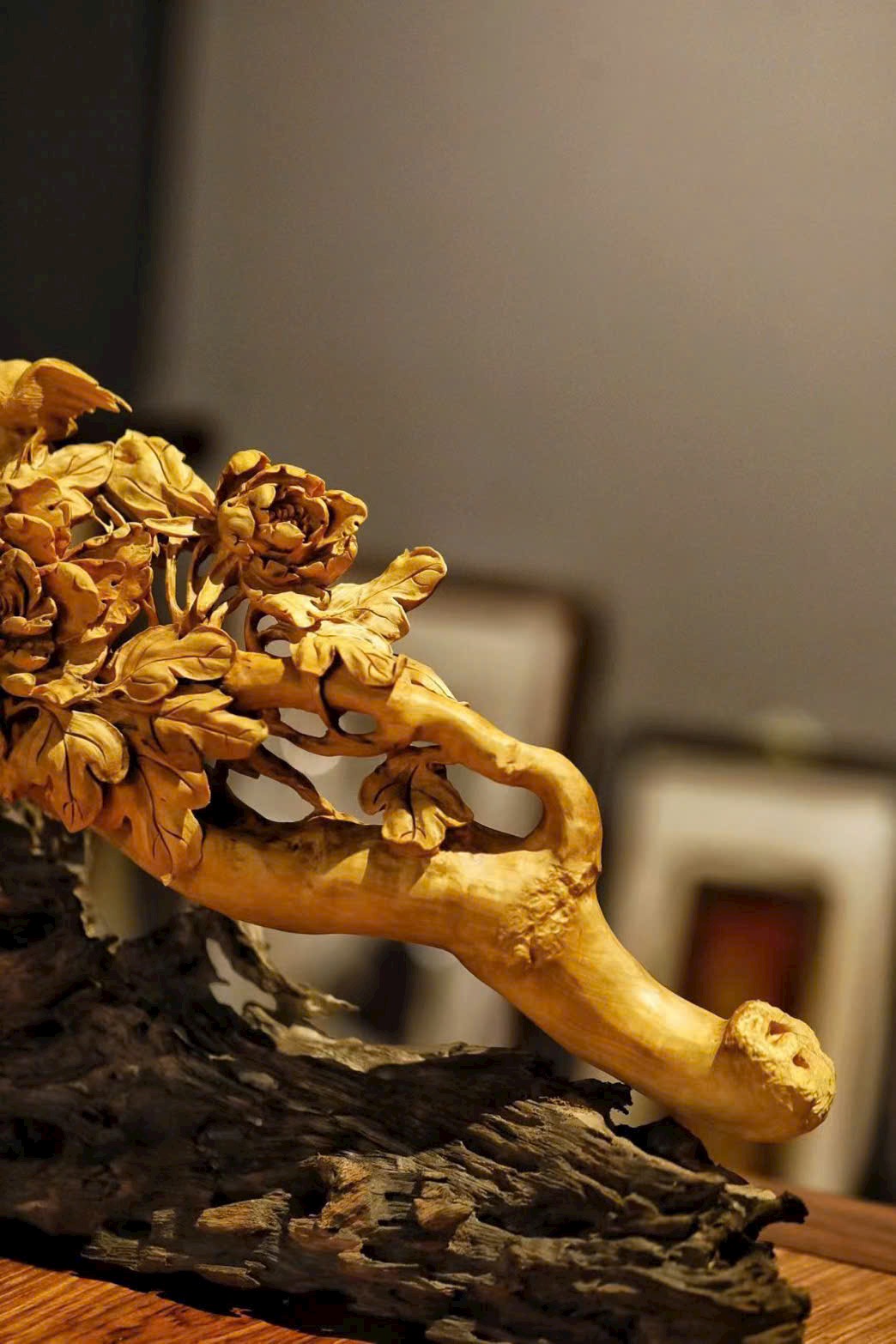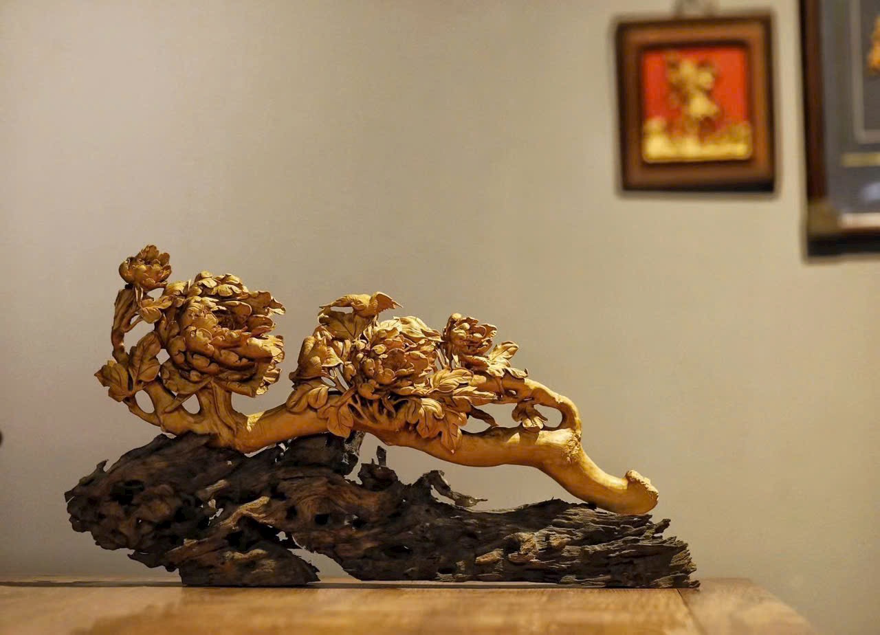 Nguyên khối gỗ hoàng dương, được chế tác thủ công tinh xảo, chạm khắc nổi tinh vi sinh động. Mẫu đơn rực rỡ kiêu sa, cành lá tươi mới khoe sắc, chim hỉ thước linh hoạt bay lượn. Mang ý vị tràn đầy sức sống, gửi gắm lời chúc phú quý vào nhà, cuộc sống thịnh vượng mỹ mãn.