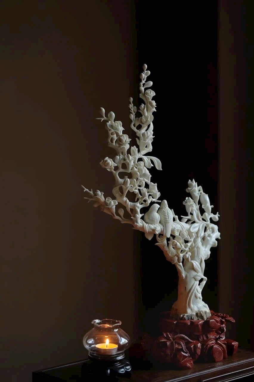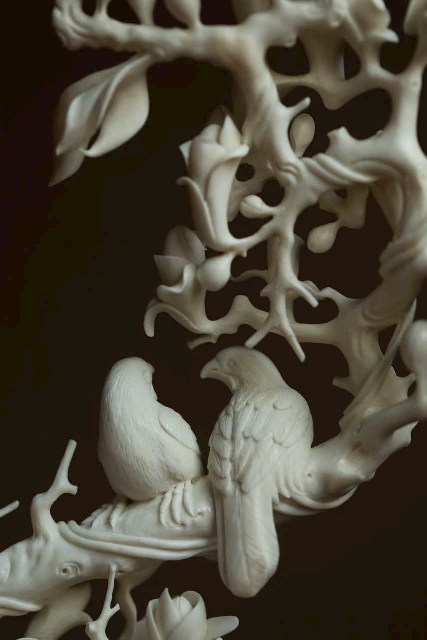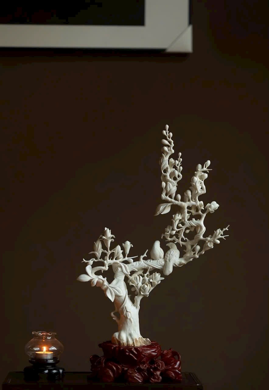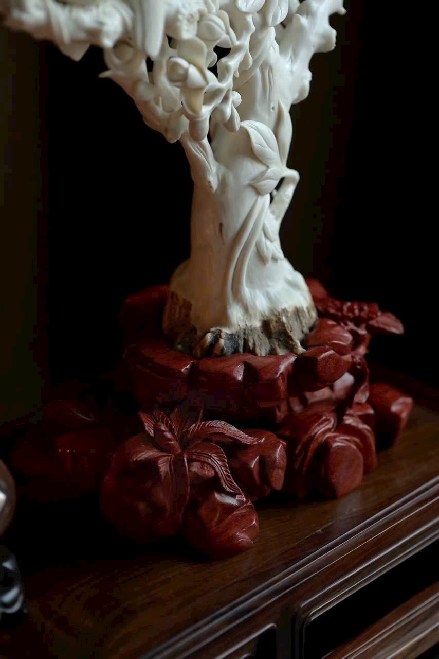 Được chạm khắc thủ công từ khối gạc lớn nguyên khối, tạo hình sống động với chiều sâu và nhiều lớp tinh tế. Kỹ thuật đục lộng và xuyên nhiều tầng hoa ngọc lan uốn lượn, cổ hoa thanh mảnh, đường nét sắc sảo. Bề mặt được đánh bóng mịn màng, bố cục thoáng đãng, mang vẻ đẹp thanh nhã. Tượng trưng cho gia đình hòa thuận, hạnh phúc viên mãn.
