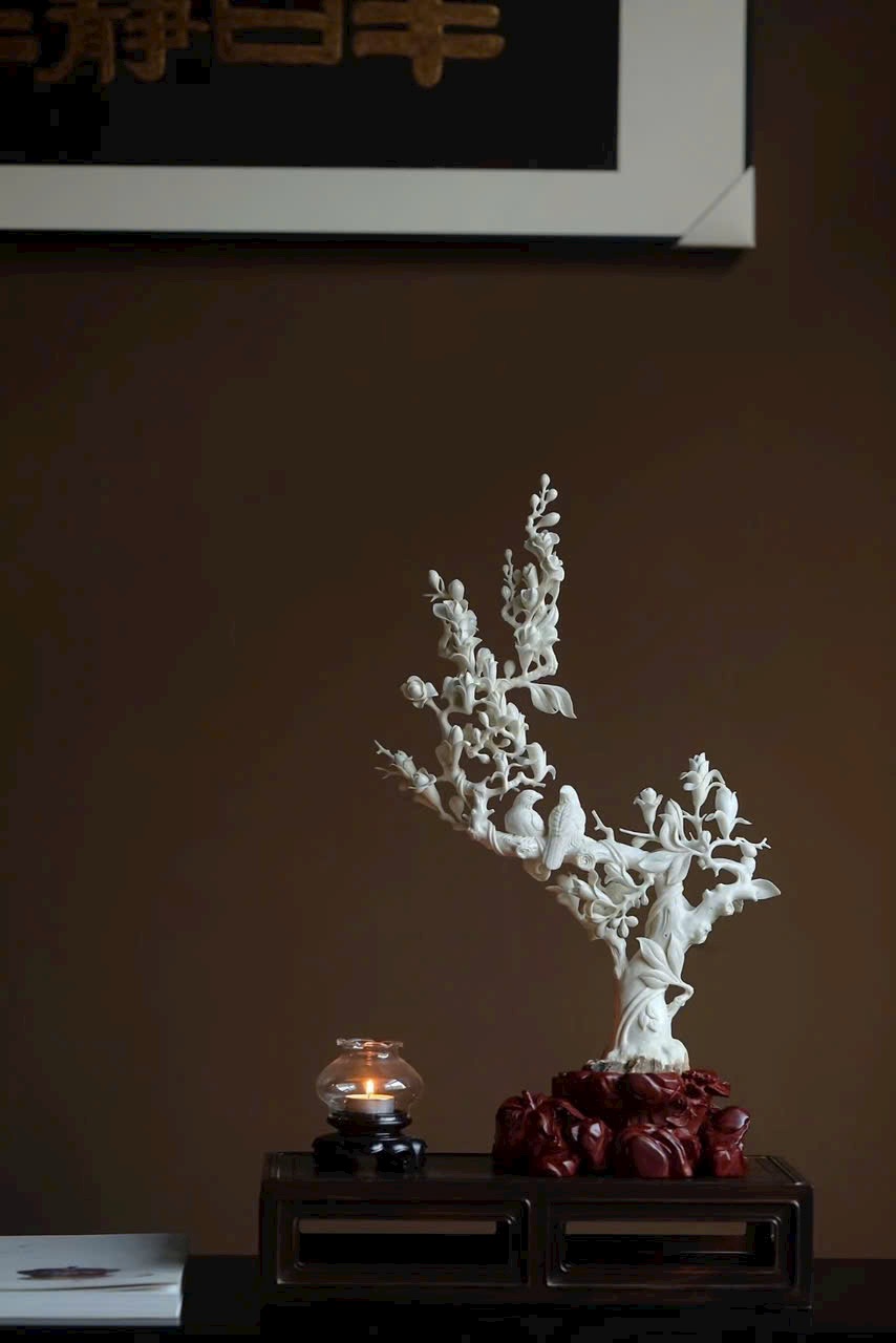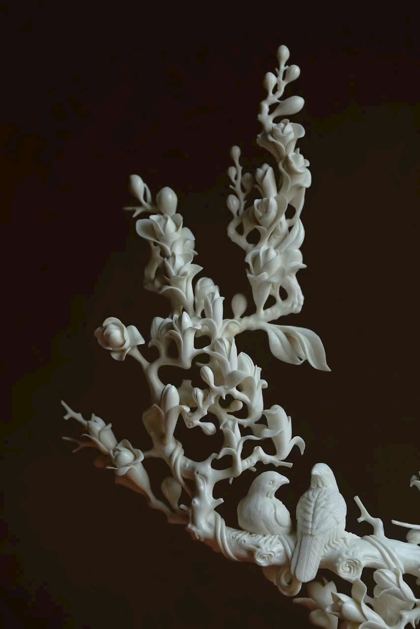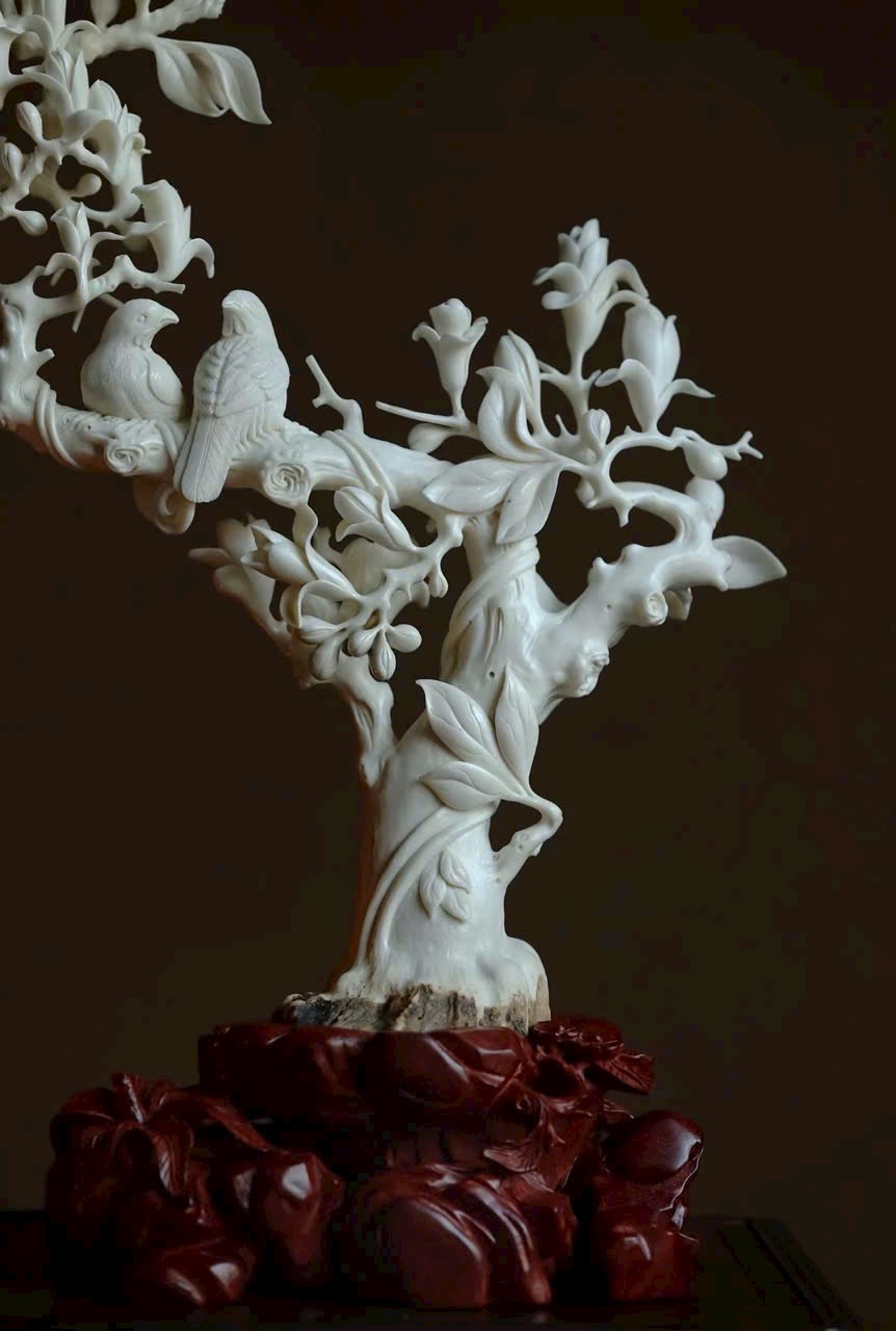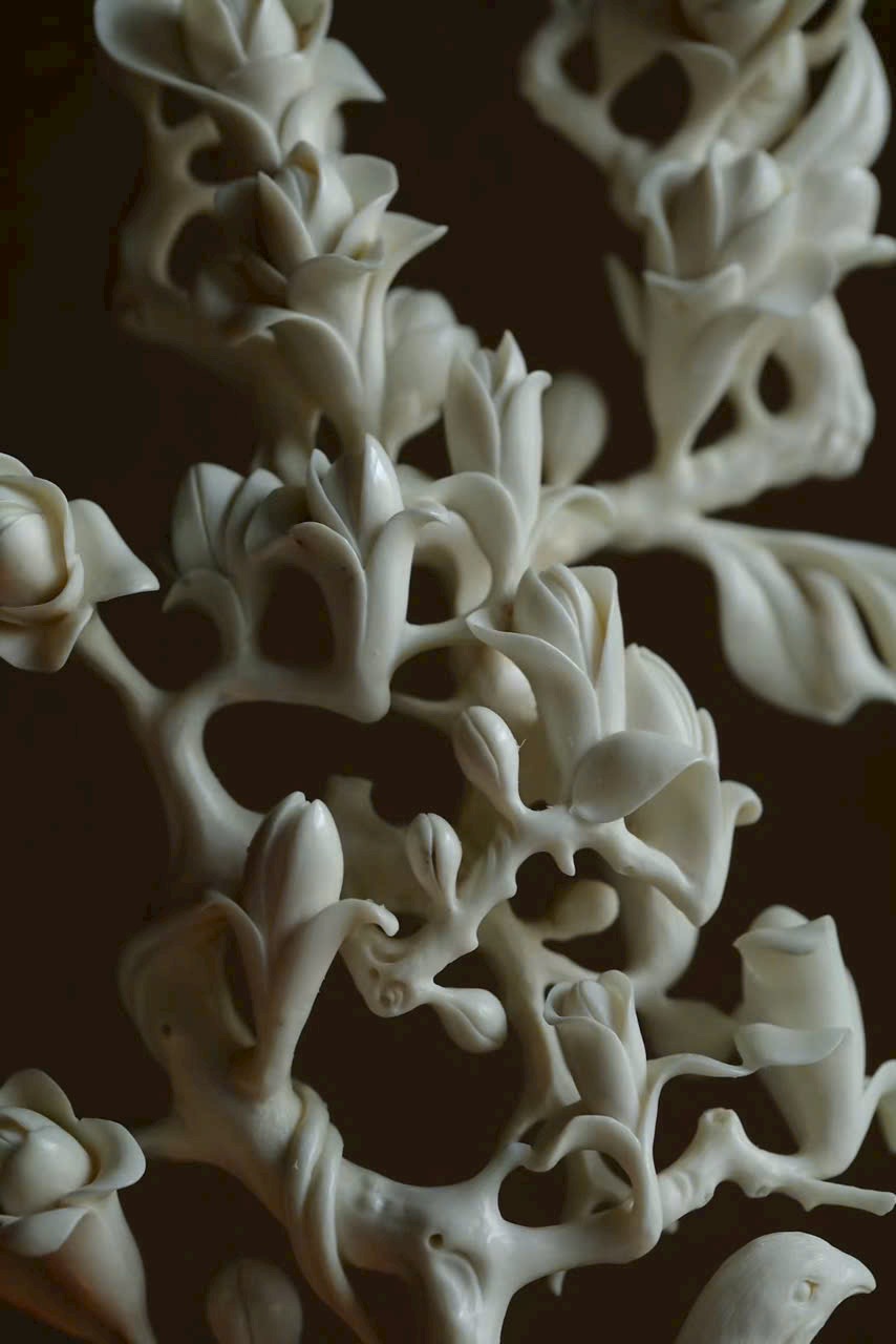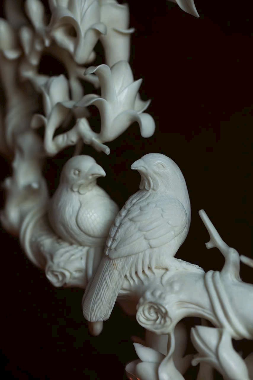 Được chạm khắc thủ công từ khối gạc lớn nguyên khối, tạo hình sống động với chiều sâu và nhiều lớp tinh tế. Kỹ thuật đục lộng và xuyên nhiều tầng hoa ngọc lan uốn lượn, cổ hoa thanh mảnh, đường nét sắc sảo. Bề mặt được đánh bóng mịn màng, bố cục thoáng đãng, mang vẻ đẹp thanh nhã. Tượng trưng cho gia đình hòa thuận, hạnh phúc viên mãn.