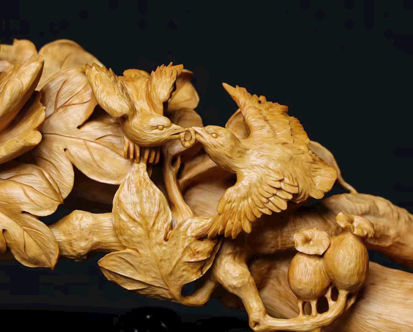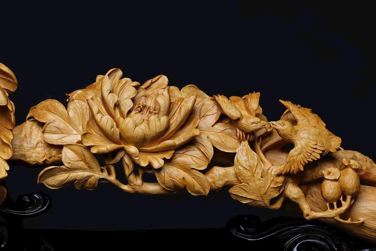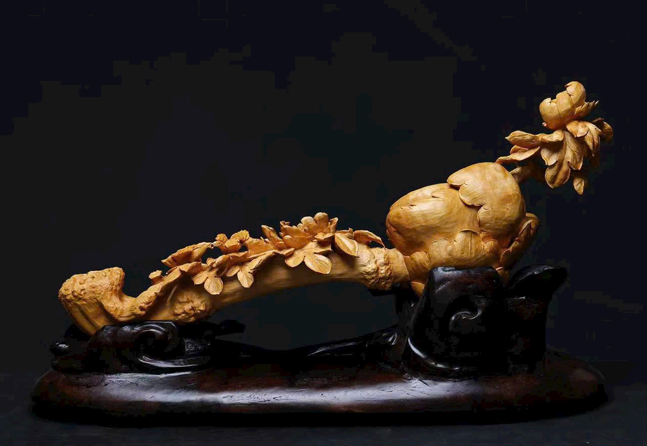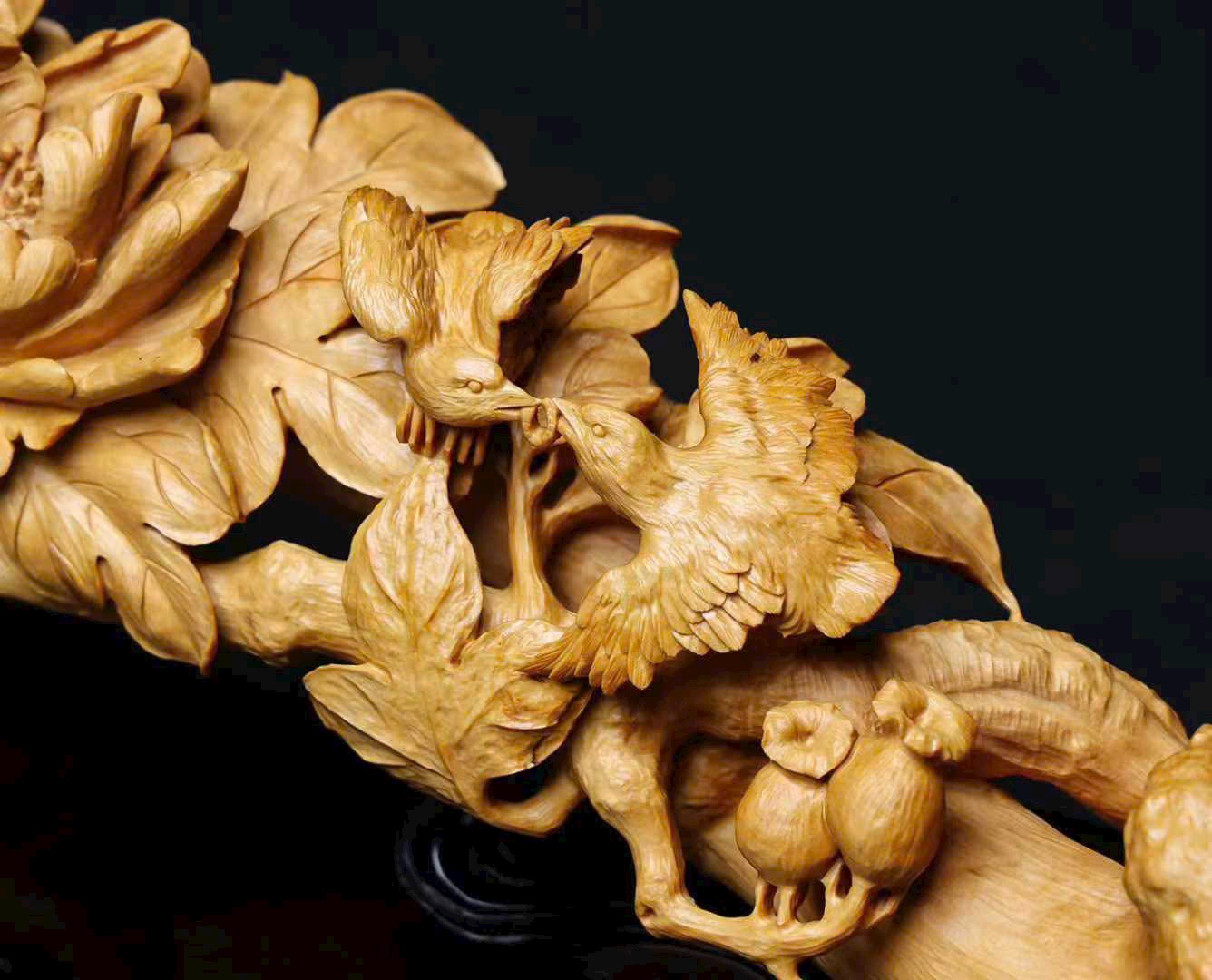 Chạm khắc thủ công từ nguyên khối. Hình tượng hoa mẫu đơn mang ý nghĩa phú quý cát tường, chim hỷ thước đậu cành tượng trưng cho may mắn, mọi sự như ý. Thiết kế kèm đế, tổng thể bề thế trang nhã, chi tiết làm kỹ, tình trạng bảo quản rất tốt.